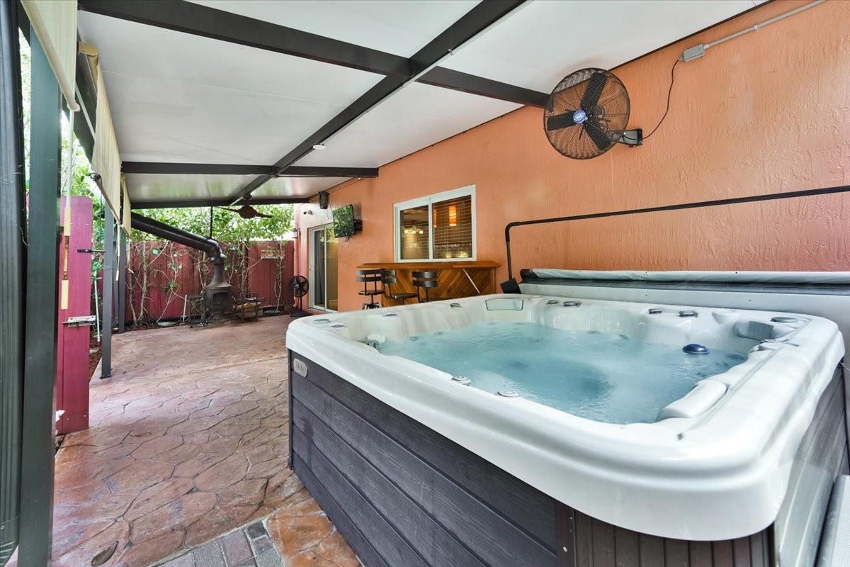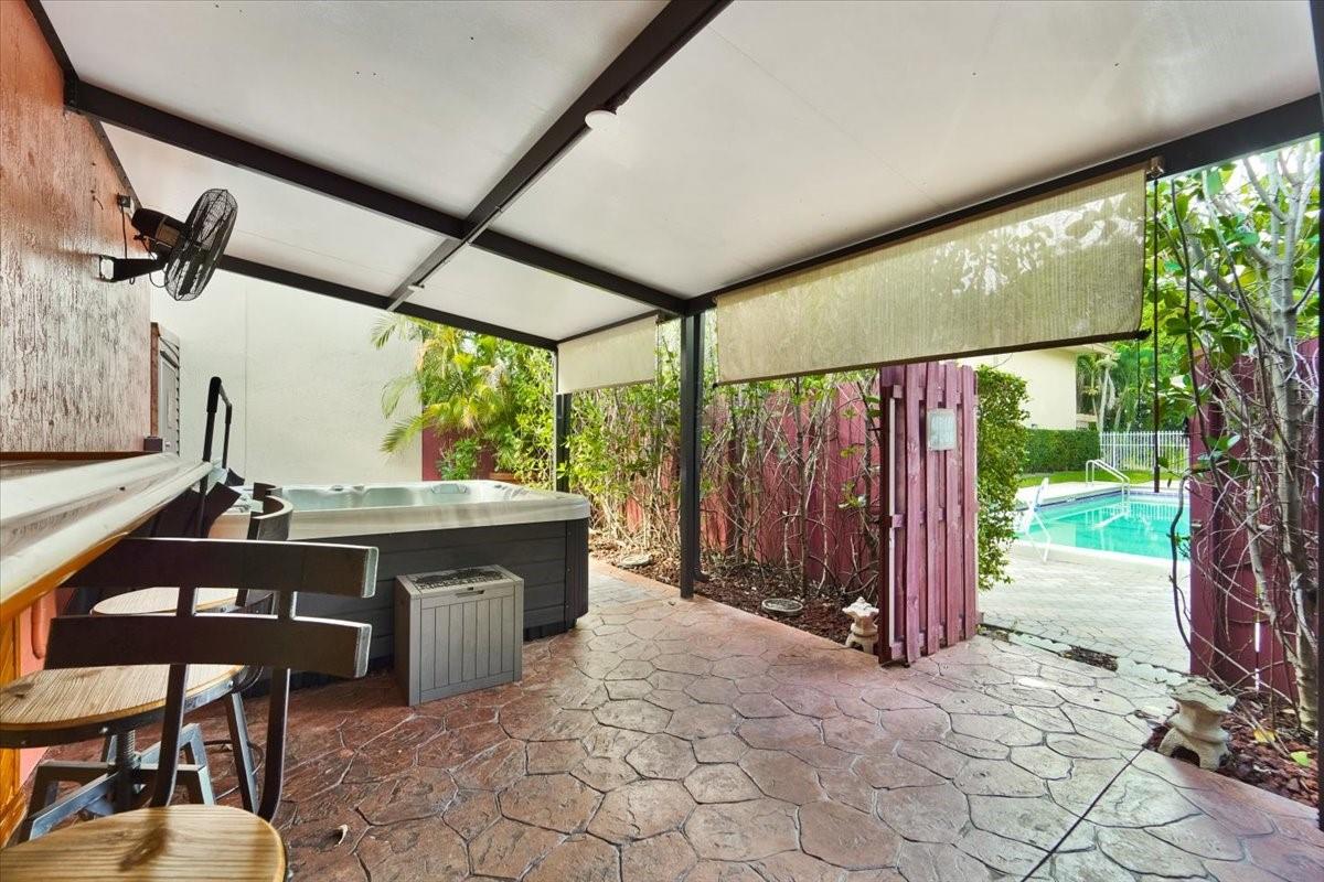 Perfect home for entertaining and living your best Florida lifestyle! This gem is one of a handful with direct gated access to the community pool. Large covered stamped-concrete patio with hot tub - all under an insulated rigid awning. Great layout with lots of flow from living to dining to patio to kitchen and back. Kitchen features stainless steel appliances and back-lit quartzite backsplashes for amazing ambiance. Storm protection includes impact garage door, impact windows downstairs and accordions upstairs. Lots of terrific features, including: alarm system, attached garage, large storage shed, excellent video camera system with DVR, and laundry room with premium front loading washer and dryer. Come make this your home - you'll love it!.