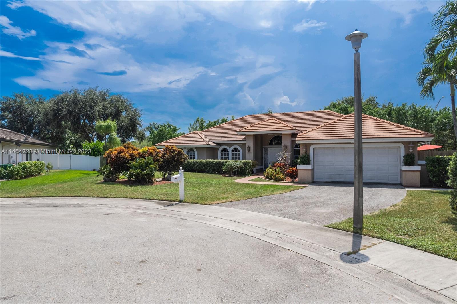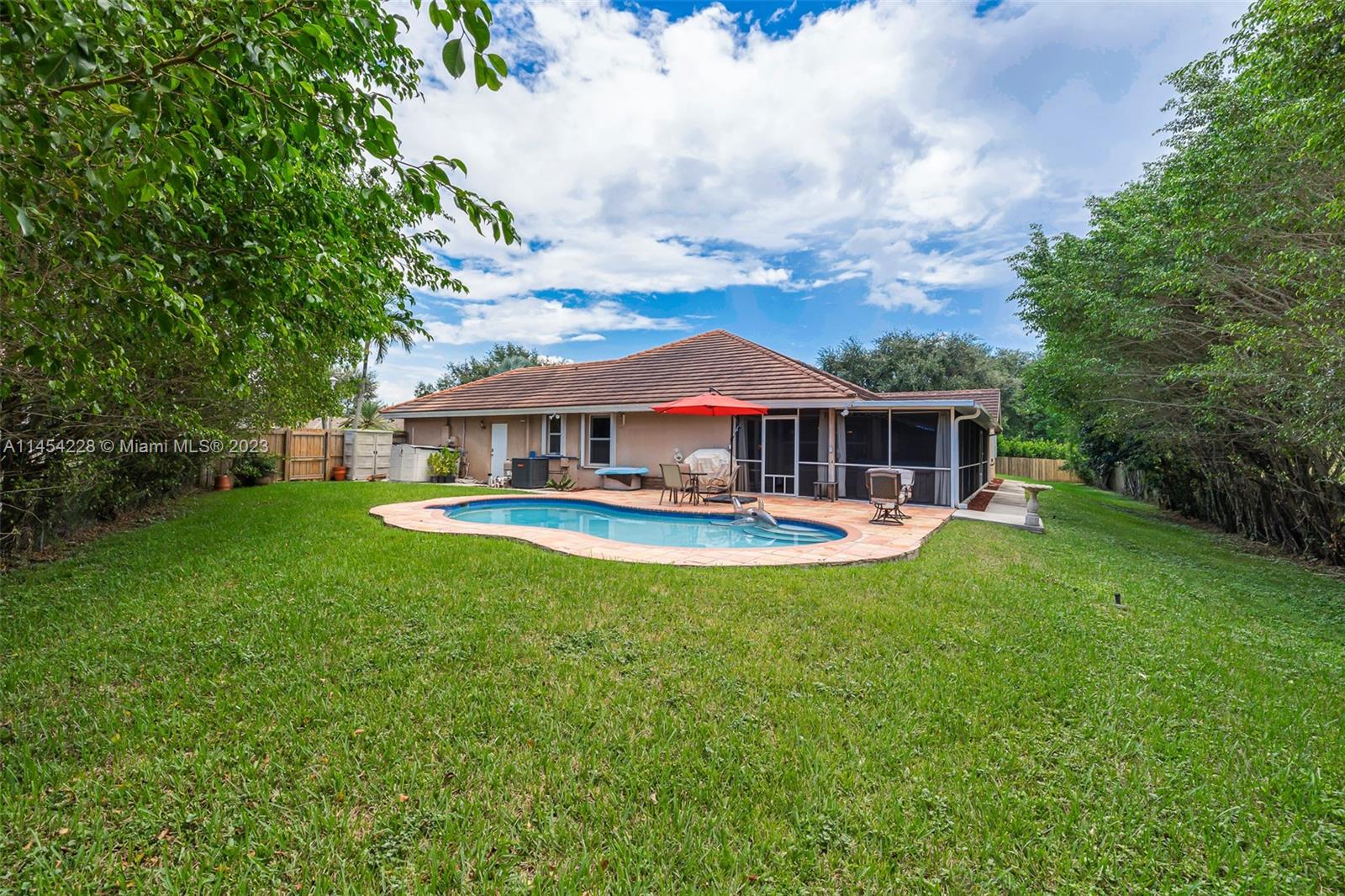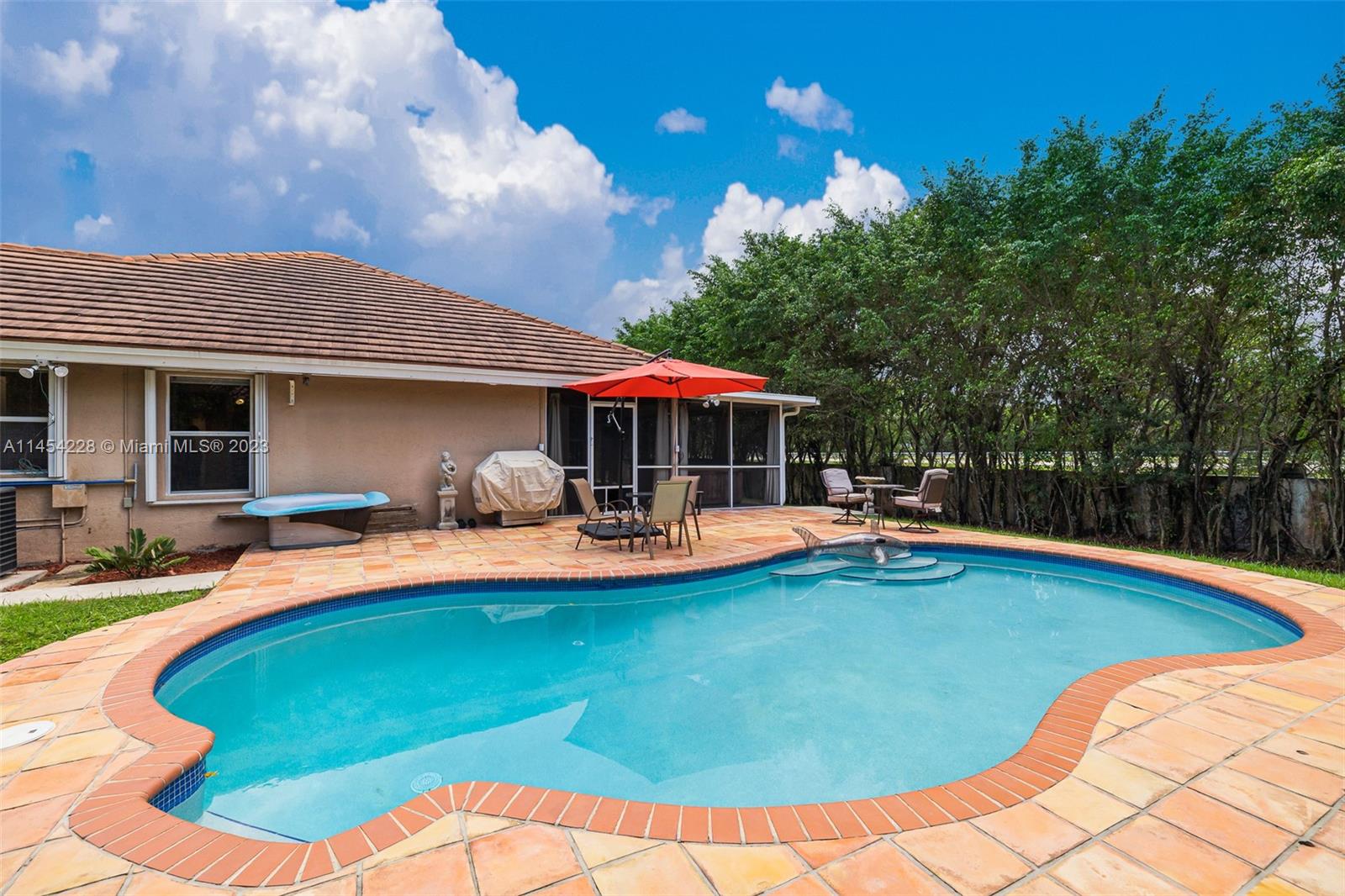 Lovely Pool Home in Davie Country Estates that sits on a builders half acre in the center of the cul-da-sac. Walk in you have a 4 Bedrooms, 2 Bathes, updates Kitchen with wood cabinets, Granite counter tops, family room, breakfast area, office, separate laundry room with sink, 2 car garage. Great covered patio for entertaining which is 50' long. Outside you have your pool and plenty of room for anything else. Roof was replaced 2016. Only 20 homes in the community.