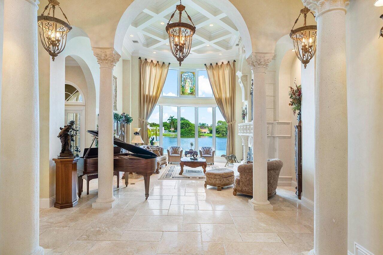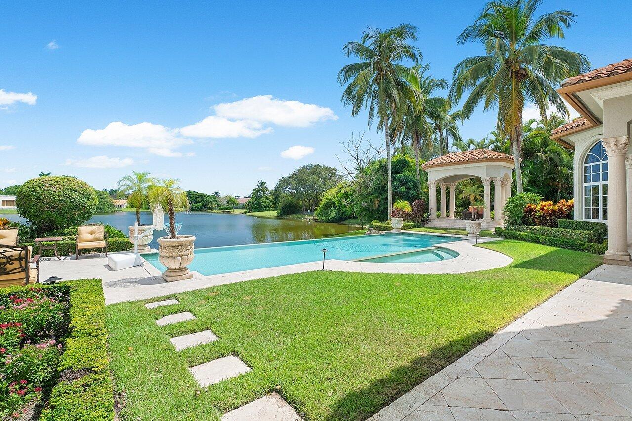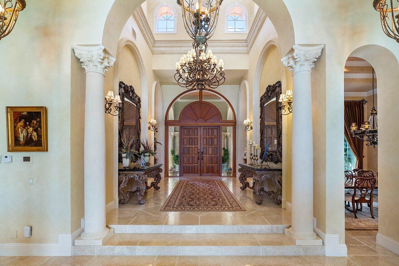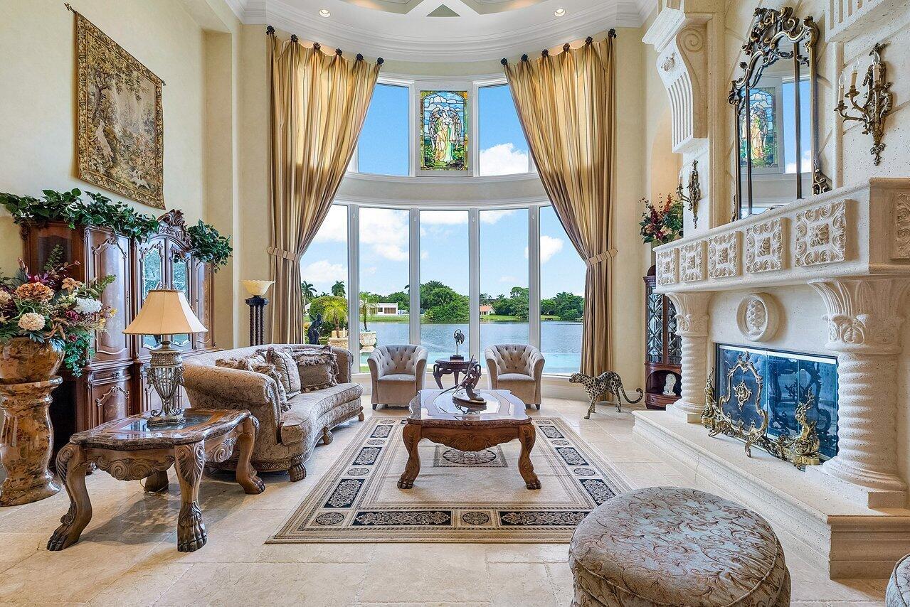 Breathtaking banyan trees welcome you to this majestic mediterranean lakefront estate boasting 10,013 square feet of living space and set on over an acre of meticulous and professionally designed landscaping. 8465 Twin Lake Drive is in a league of its own showcasing unparalleled luxury in one of Boca Raton's most coveted and exclusive neighborhoods, Long Lake Estates. Designed for exquisite living and entertaining on a grand scale this custom sprawling property with extraordinary architectural details are evident in arched doorways, barrel and coffered ceilings, stone columns and custom millwork. Featuring 7 oversized ensuite bedrooms including a guest house, staff quarters or in-law suite, 3 half bathrooms, club room with bar, home theatre, office and chef's kitchen this home is