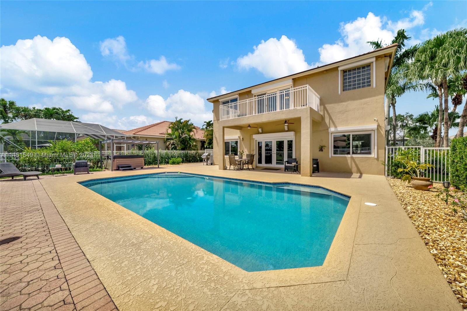 $25,000 BUY DOWN CREDIT paid buy Seller - Welcome to luxurious living in Weston's Emerald Estates! This stunning 5-bedroom, 3-bath home, tucked away in a tranquil cul-de-sac, offers modern updates, a chef's kitchen, and elegant baths. The primary bedroom boasts a private terrace with serene lake views. Marble floors, a 3-car garage with epoxy floors, and brick paver driveways add to the charm. Safety is ensured with security cameras and monitors installed inside and out as well as 24/7 gated security, and the HOA covers landscaping, cable, internet, gym access, and alarm monitoring. A new roof and impact windows provide peace of mind. Your oasis awaits outside with a pool, spa, and outdoor kitchen. Don't miss out! Schedule your showing today!