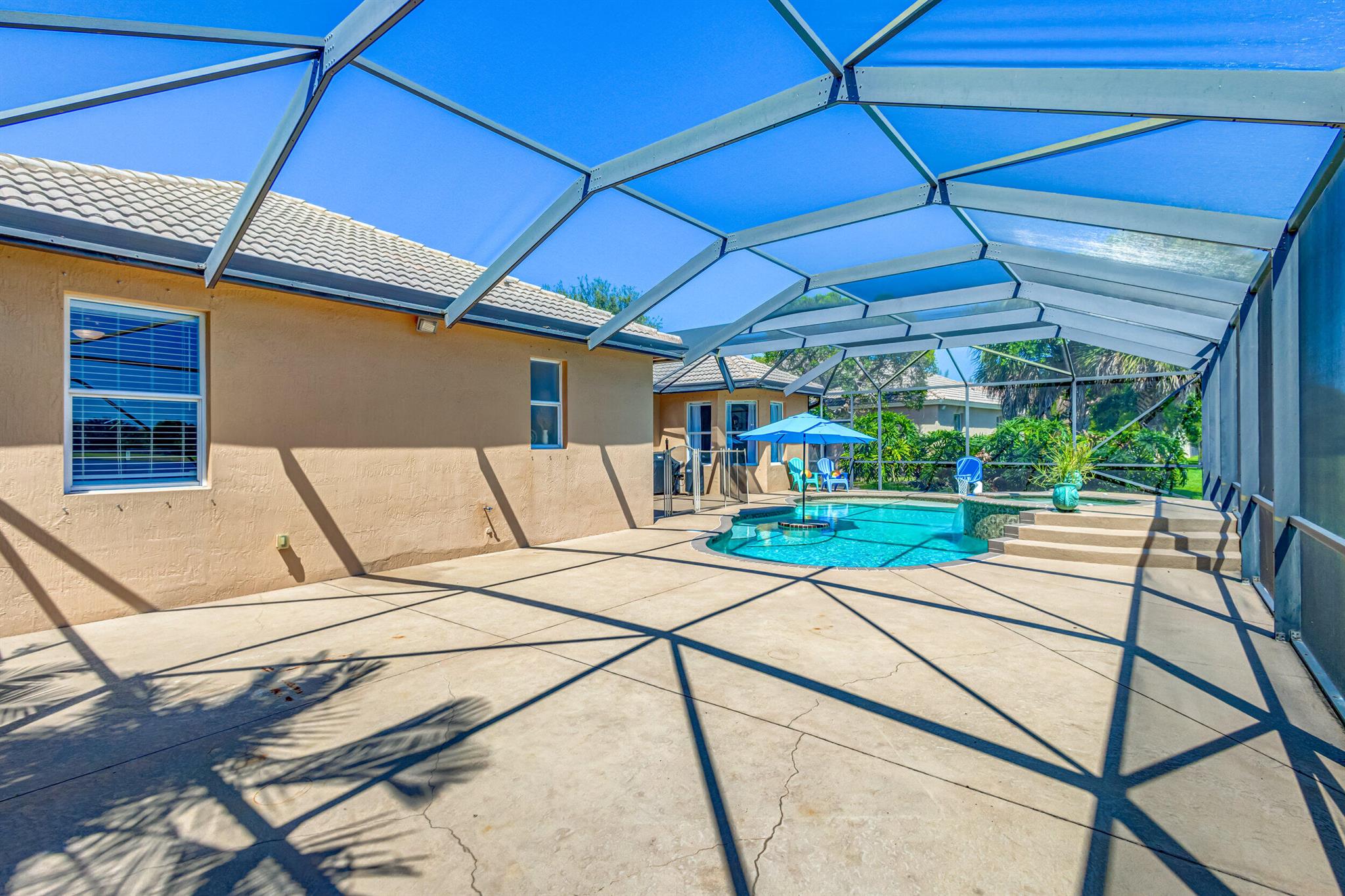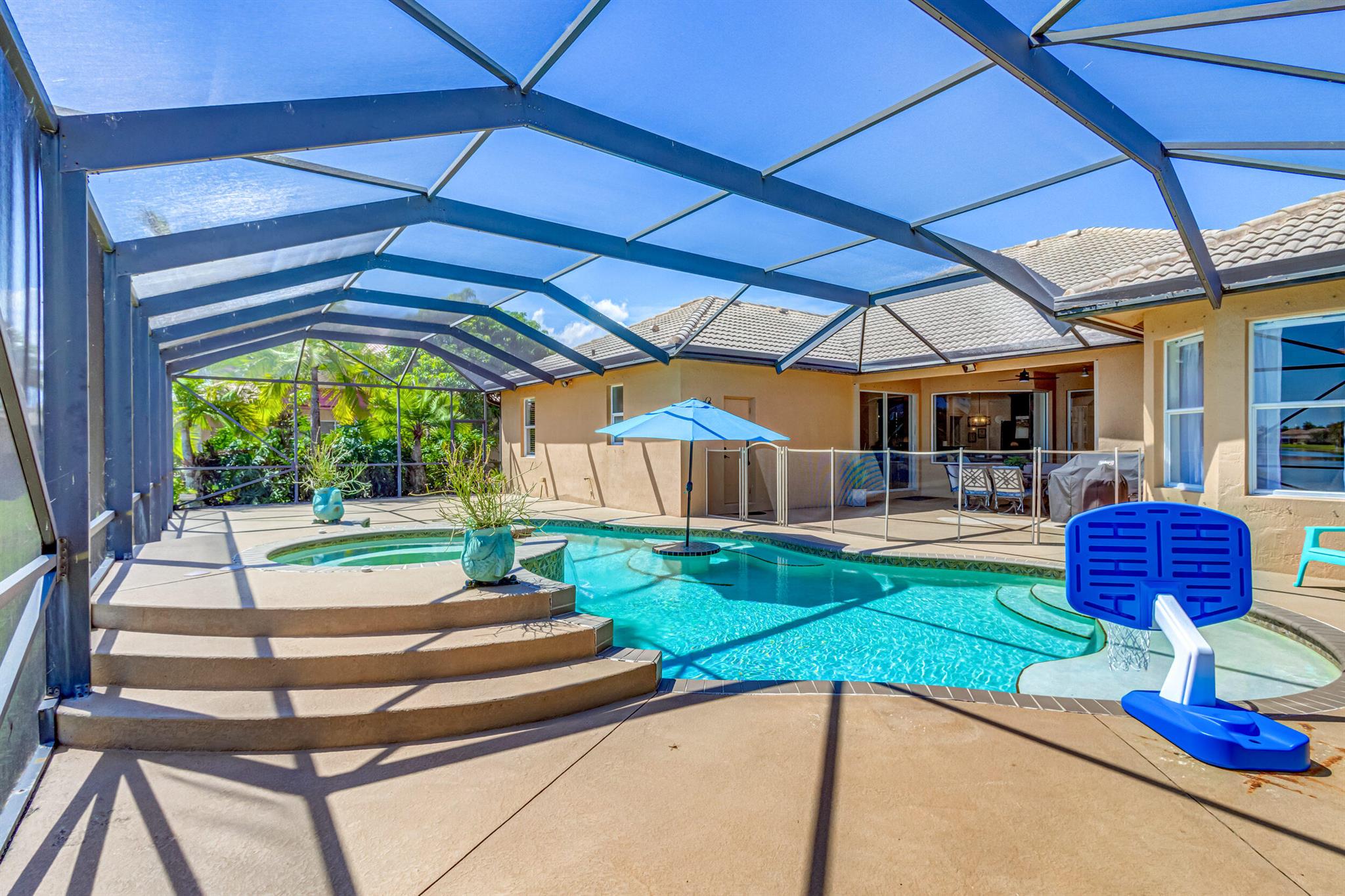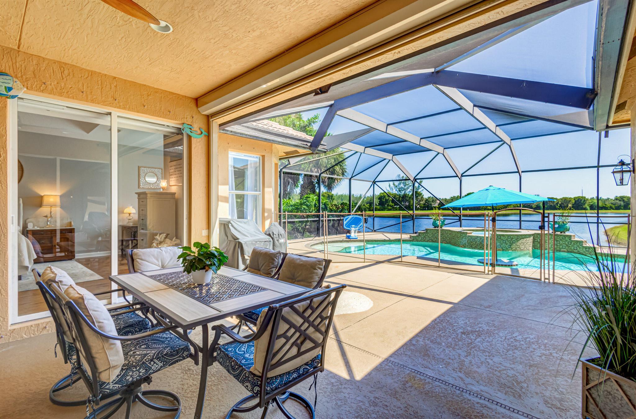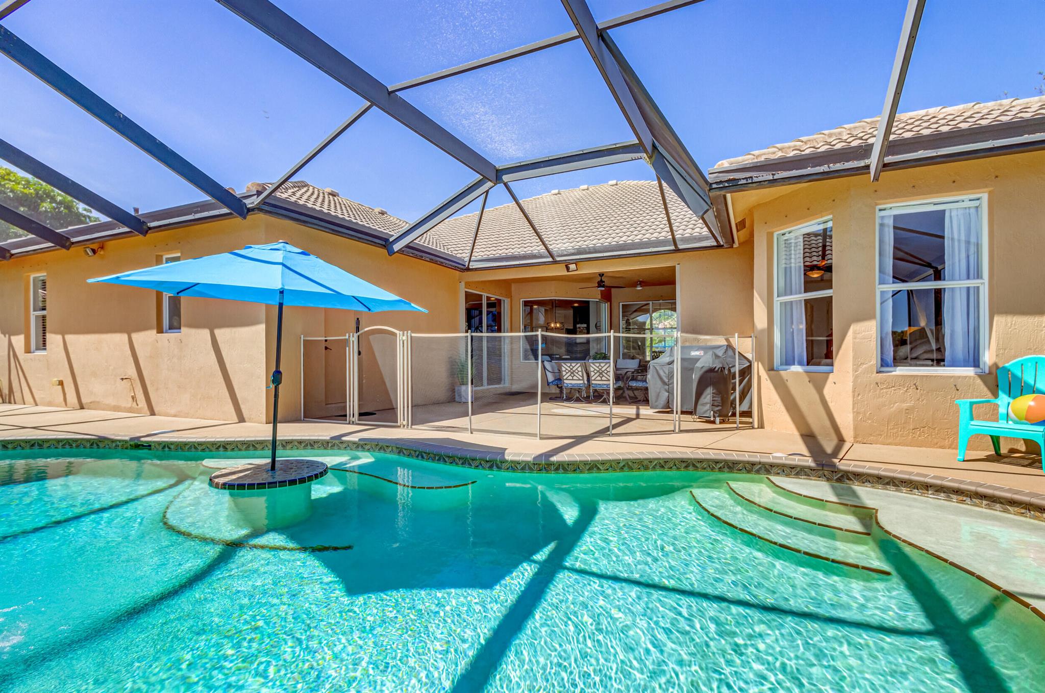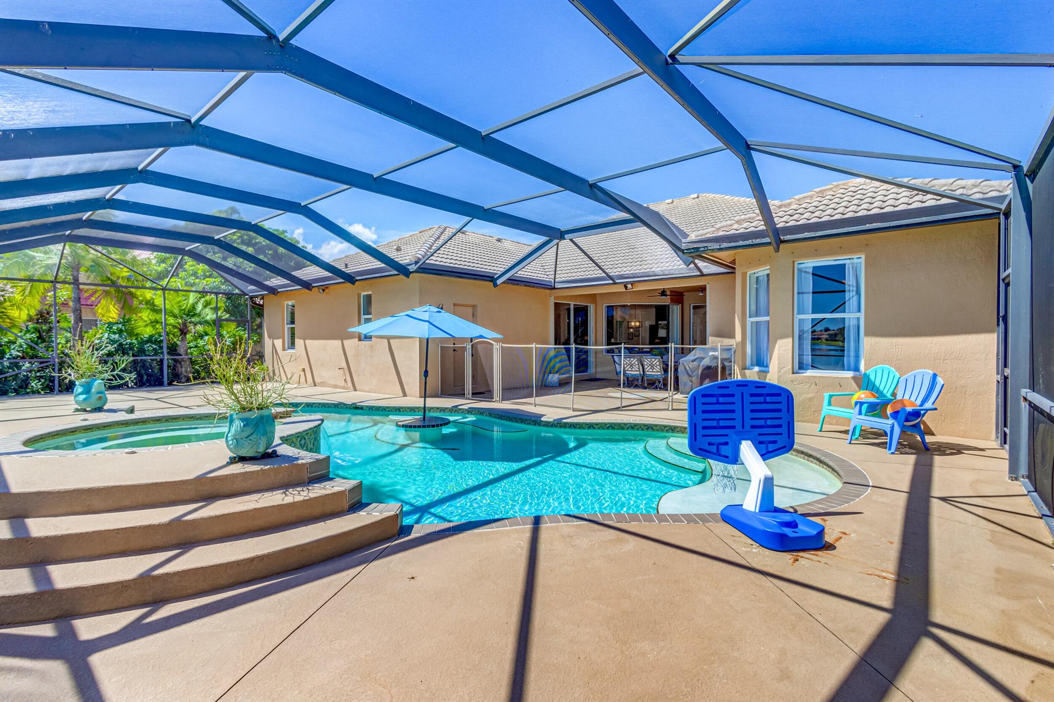 Stunning expansive long lakefront view one of a kind extended mdl single story 2847 lvg sq ft 5 br 3 bath 3 car gar. home. Oversized cul-de-sac lot. Spacious layout living, family, dining, breakfast, bar top casual eating, outdoor fully screened living space w/long water view, pool, spa, sun & covered lanai shade space & dining space. outdoor BBQ. cabana bath. All hard friendly living floor surfaces, no carpet, indoor laundry room, ample kitchen storage, center island & pantry space. New gas stove, micro, w/d, new commodes, faucets, water heater 2023, new pool heater, salt system. child safety fence. Roll down hurricane screen back patio no moving furniture inside! New pavers front. North/South exposure can leave new window treatments open! Community pool, tennis & playground.