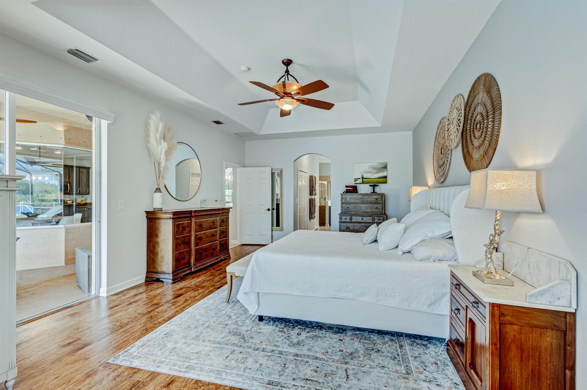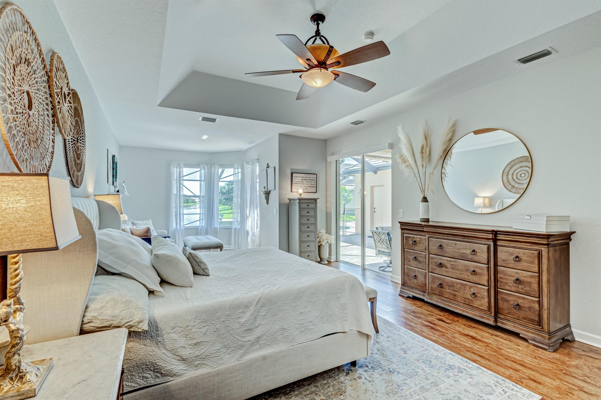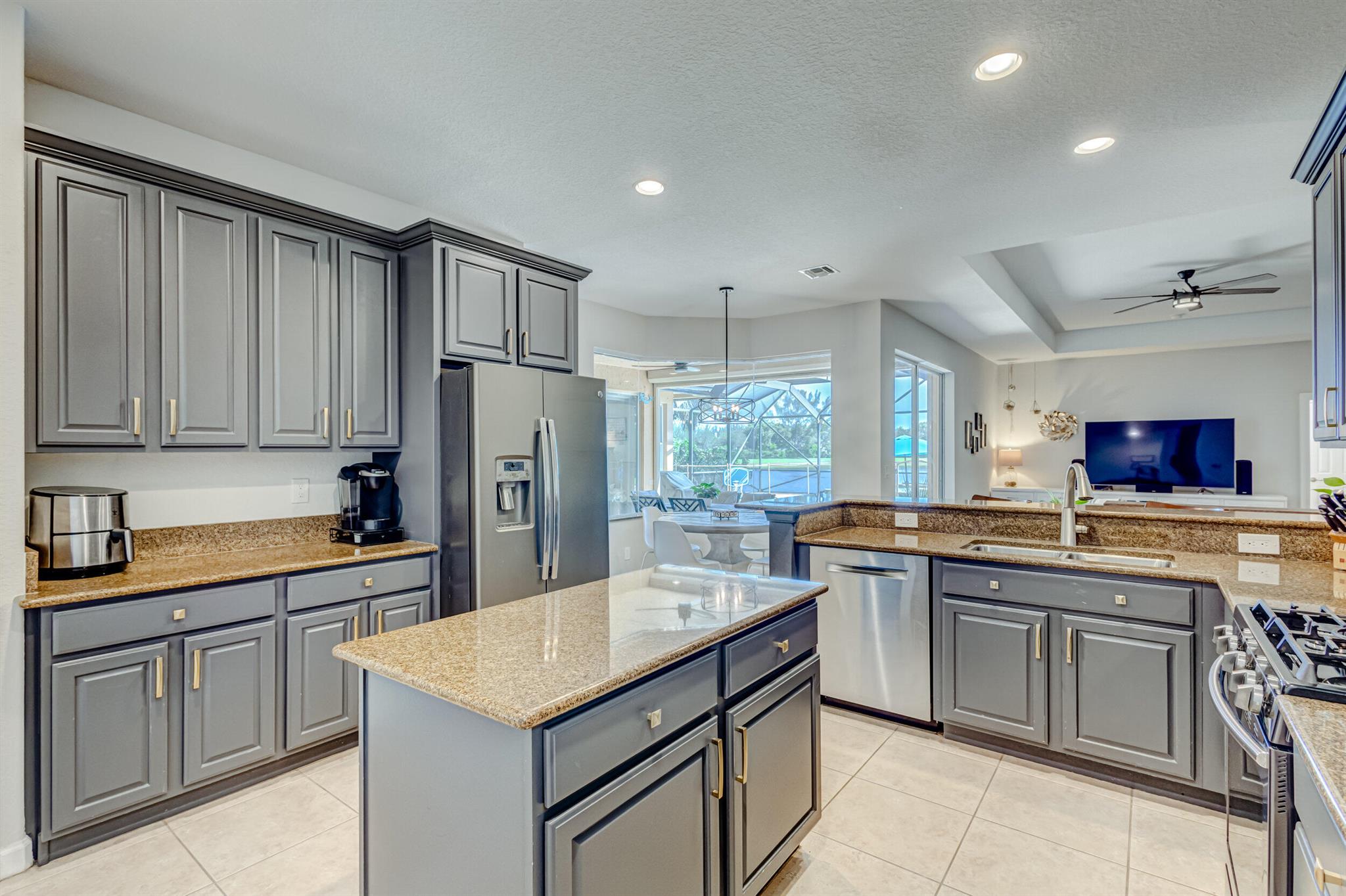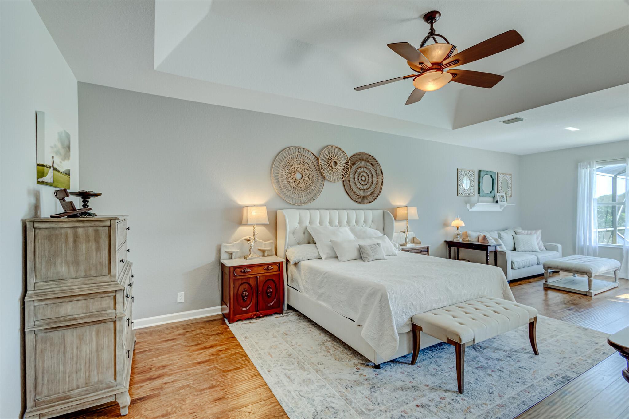 Stunning expansive long lakefront view one of a kind extended mdl single story 2847 lvg sq ft 5 br 3 bath 3 car gar. home. Oversized cul-de-sac lot. Spacious layout living, family, dining, breakfast, bar top casual eating, outdoor fully screened living space w/long water view, pool, spa, sun & covered lanai shade space & dining space. outdoor BBQ. cabana bath. All hard friendly living floor surfaces, no carpet, indoor laundry room, ample kitchen storage, center island & pantry space. New gas stove, micro, w/d, new commodes, faucets, water heater 2023, new pool heater, salt system. child safety fence. Roll down hurricane screen back patio no moving furniture inside! New pavers front. North/South exposure can leave new window treatments open! Community pool, tennis & playground.