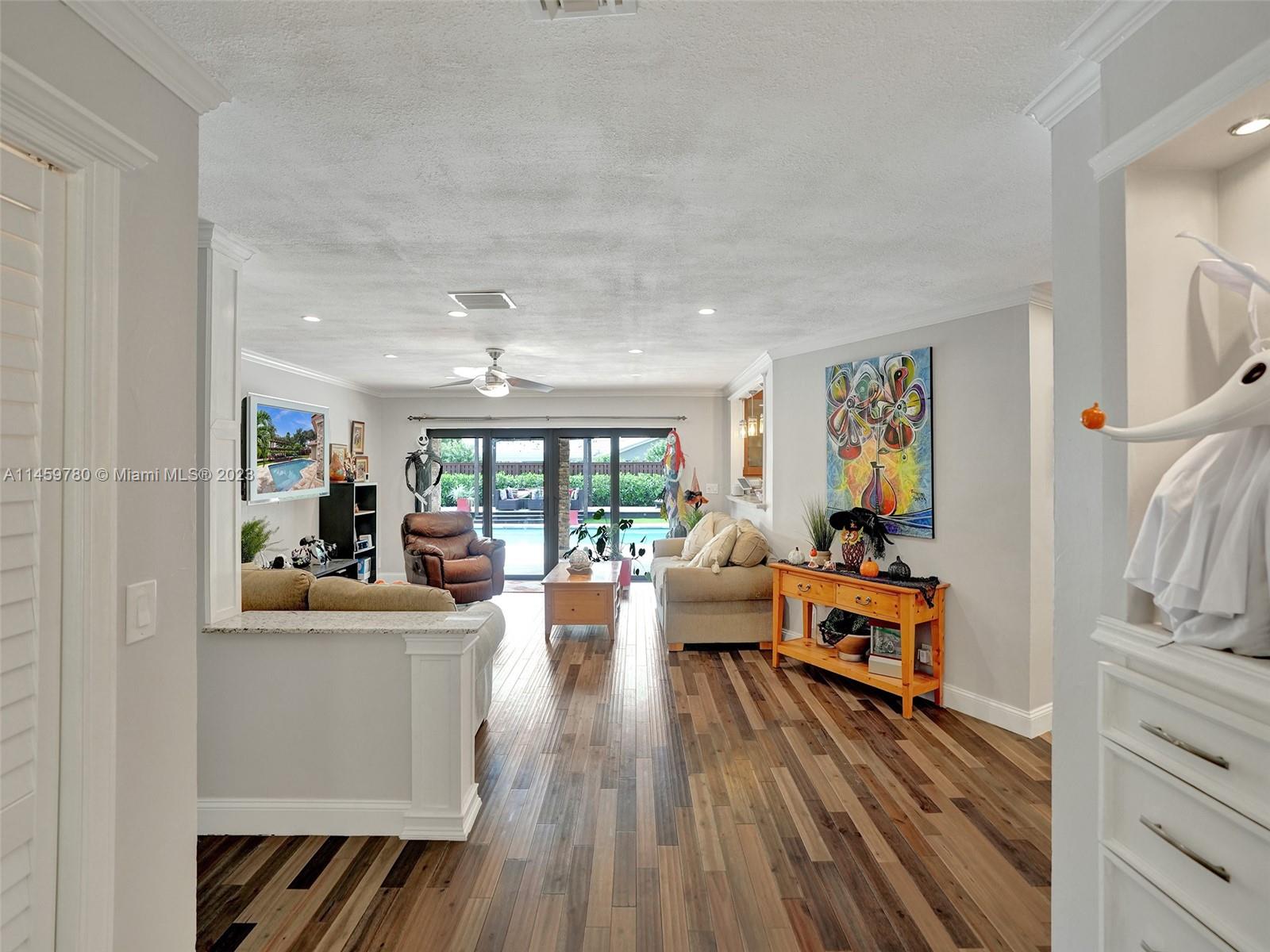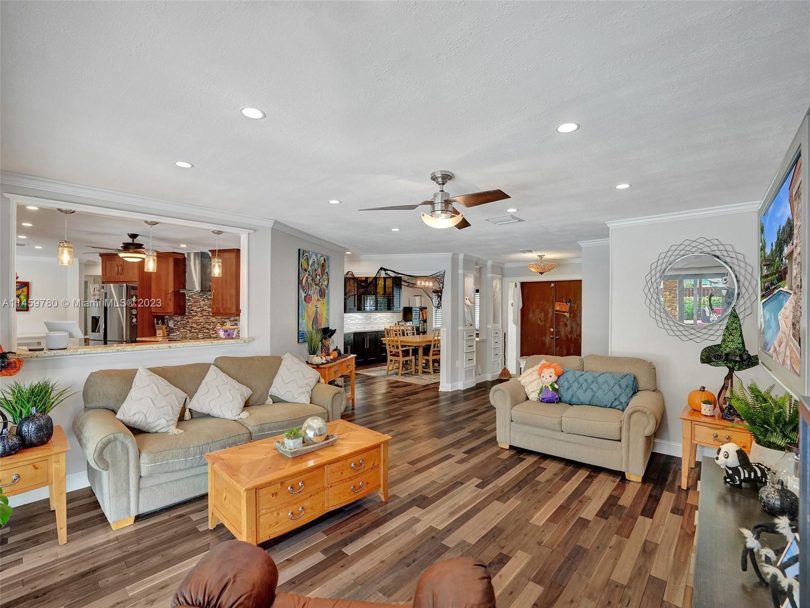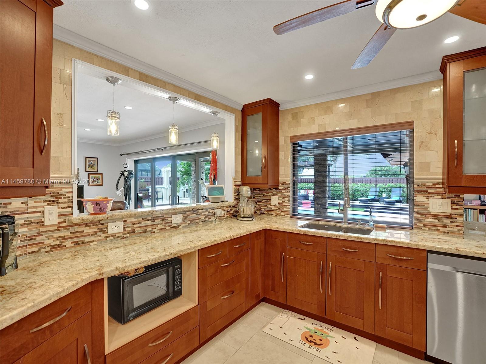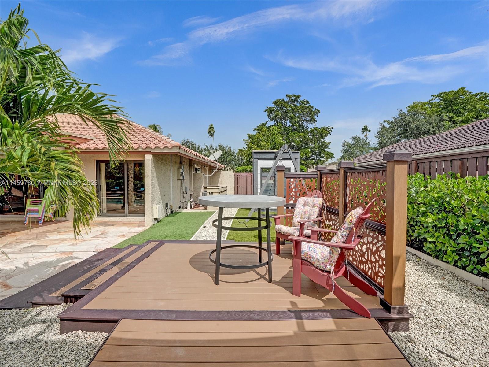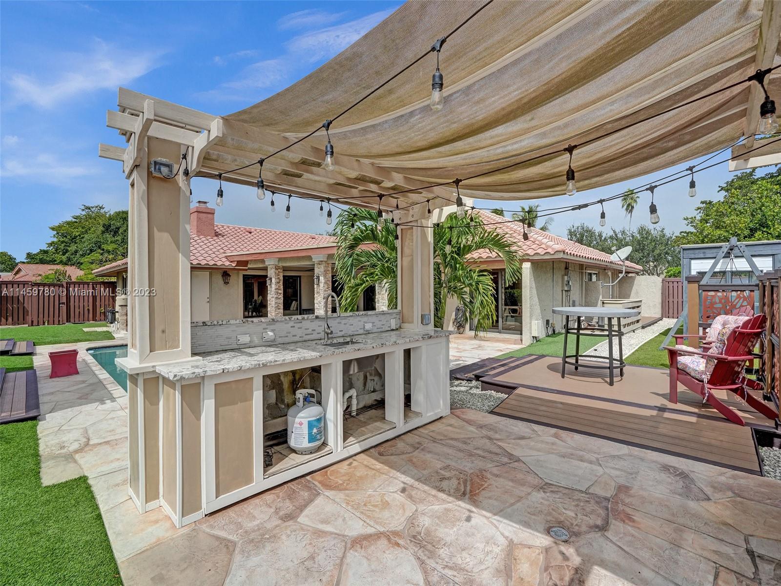 Welcome to your dream home! This spacious updated 4/3 property is nestled on a generous corner lot, boasting a captivating circular driveway and a two-car garage with an extra side driveway. The exterior is an oasis featuring a large terrace, a sparkling pool surrounded by lush synthetic grass, an outdoor kitchen, and a convenient outdoor shower. Step inside to discover a 3-way split floor plan that offers both privacy and functionality. The expansive kitchen is a chef's delight, complete with dual wall ovens, abundant counter and pantry space, and dining area. Enjoy the cozy fireplace in the family room, perfect for creating a warm ambiance. This home also features a separate family room & living room, providing ample space for relaxation and entertainment. A-rated schools and NO HOA.