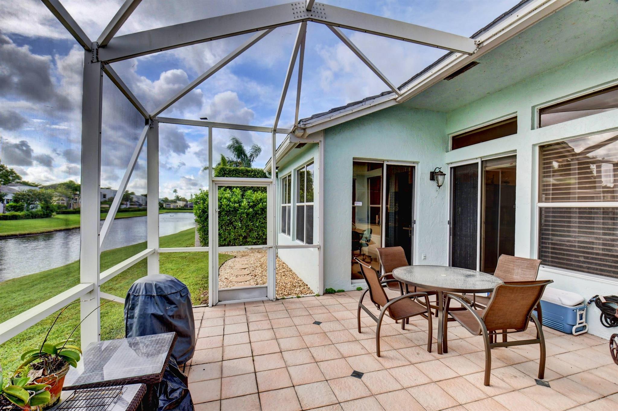 You won't forget this long lake view in this updated one story homes in popular Palms community. Floor plan features 2 bedrooms plus den and formal living and dining room. Large tile floors in main living areas. Updated kitchen and baths. Large screened in patio to enjoy endless water views. Roof replaced 2015! A/C replaced in 2020. Other features include crown molding, carpet in primary bedroom, built in closets in both bedrooms, primary bath has double sinks with lots of cabinet storage, tankless water heater, large walk in plus wall closet in primary bedroom, impact front door and so much more! Washer and dryer currently located in garage with sink. Laundry room used as hobby closet, but can be easily converted back. Close to subdivision pool. Don't miss this one!!!