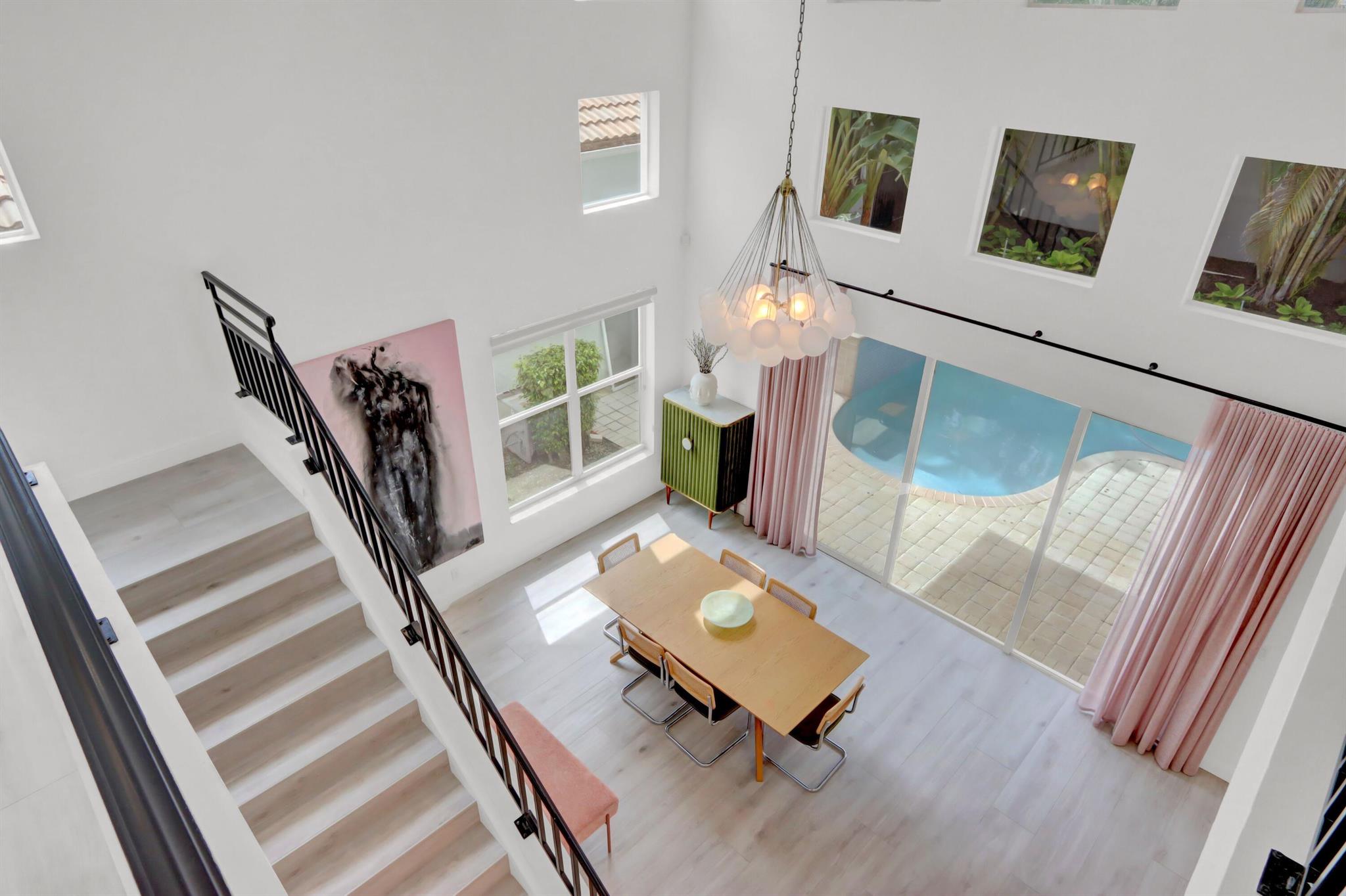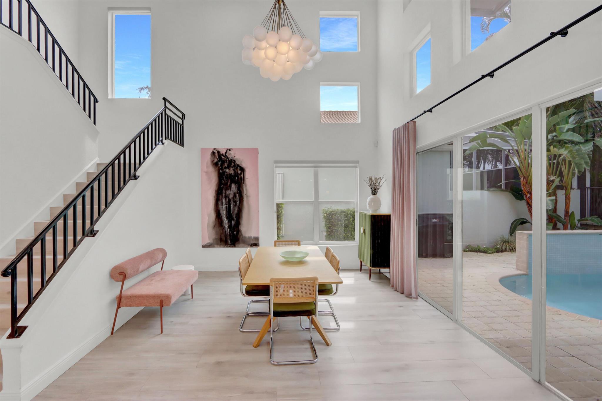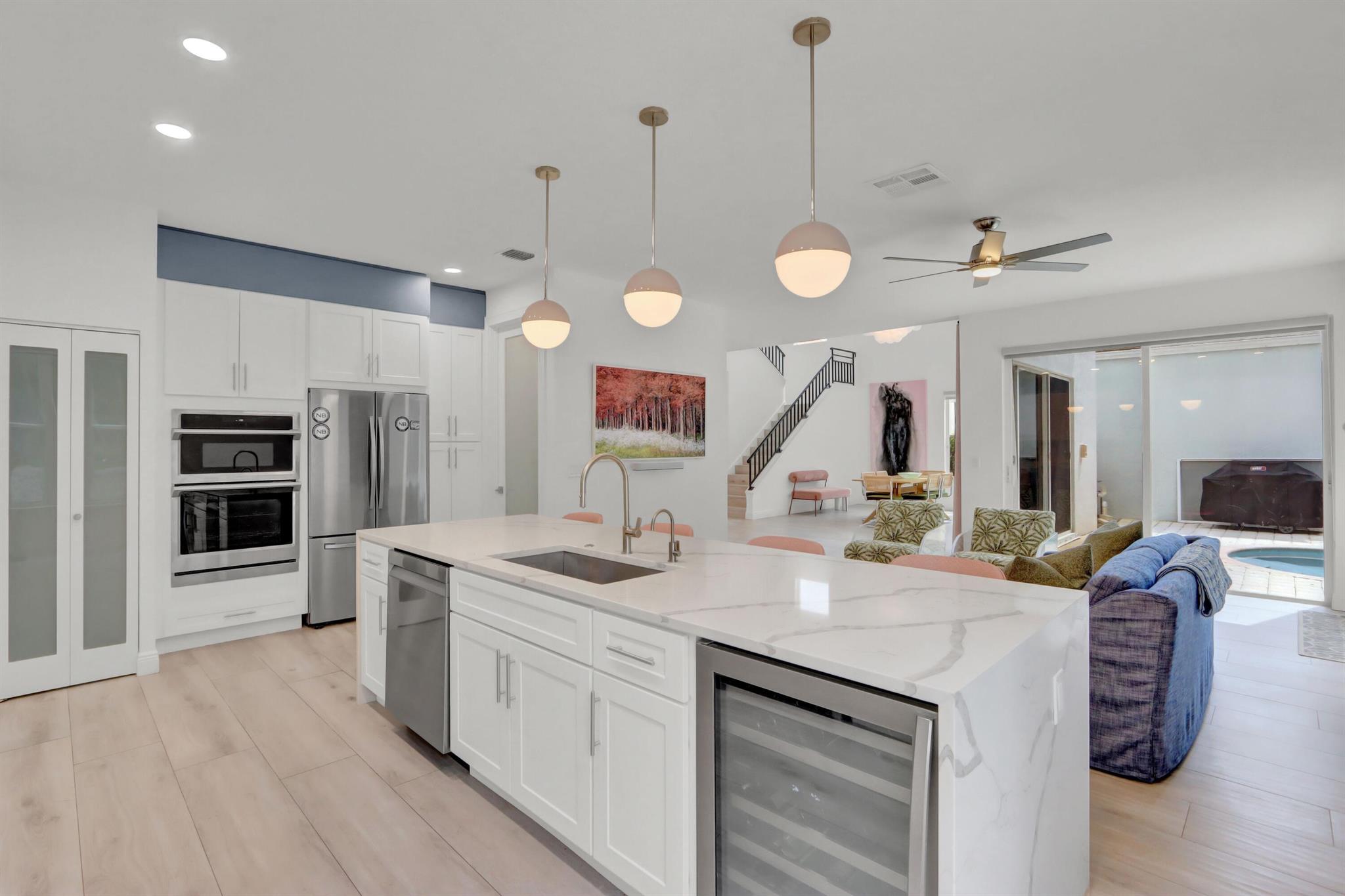 Great space & sunlight! This remodeled 2-story pool home of 5 bedrooms & 4 baths features new impact front doors;volume ceilings;new fixtures & LED high hats;wood-grain porcelain floors;open & spacious contemporary island kitchen with 42'' white & gray shaker-style cabinets,wine cooler & pantry,quartz counters & backsplash,stainless steel appliances;new doors throughout;custom window blinds & closet design;newer washer & dryer.All bathrooms are remodeled with contemporary flair.Water filtration/reverse osmosis; A/C UV filters;hospital-grade air duct filtration. Roof replaced in 2022. Preventative termite contract but no evidence of termites. The inviting outdoor space features a waterfall into the pool.Pool was resurfaced & tiled and has a child fence.