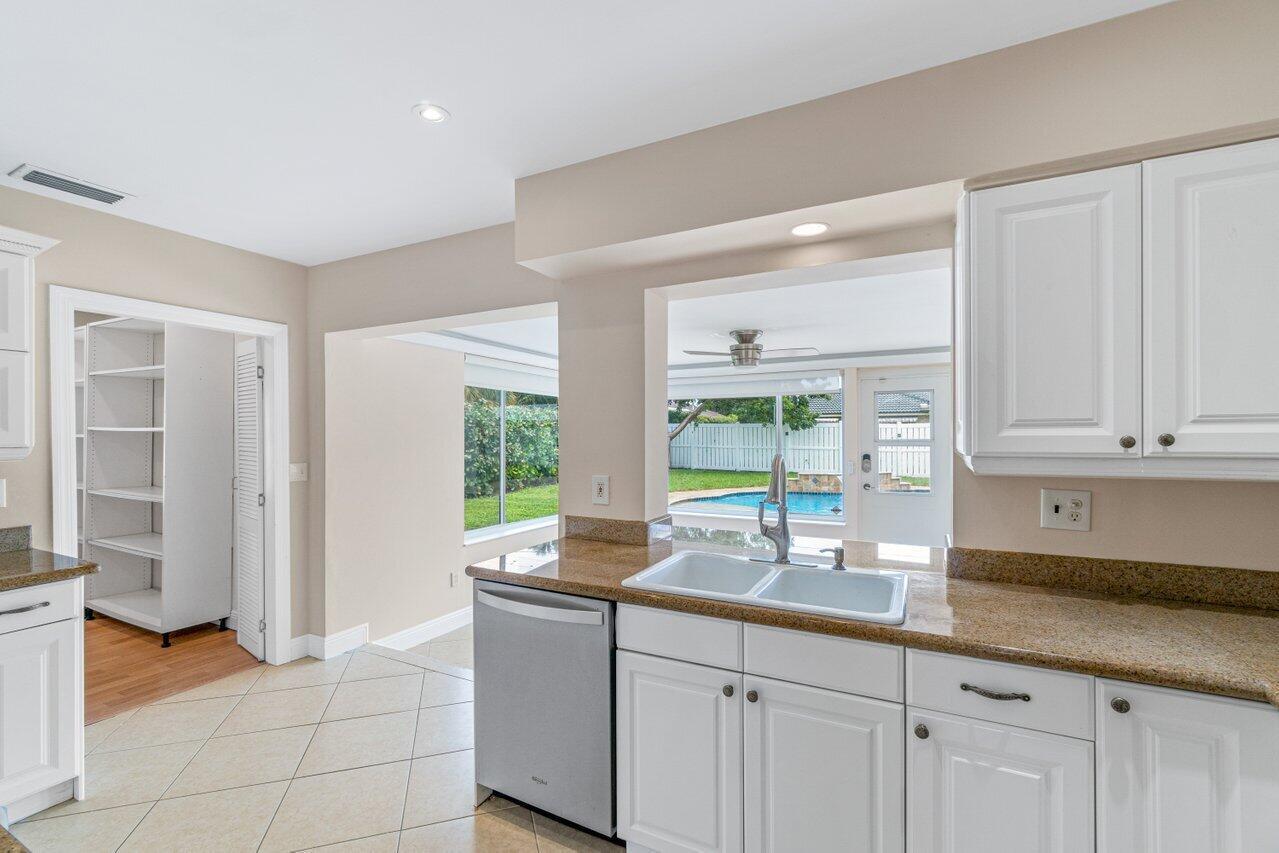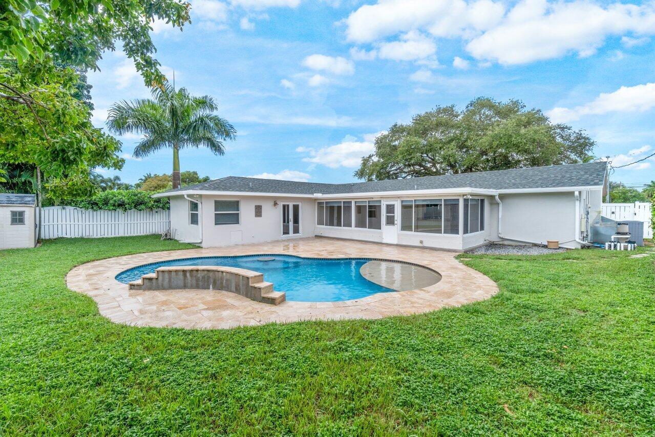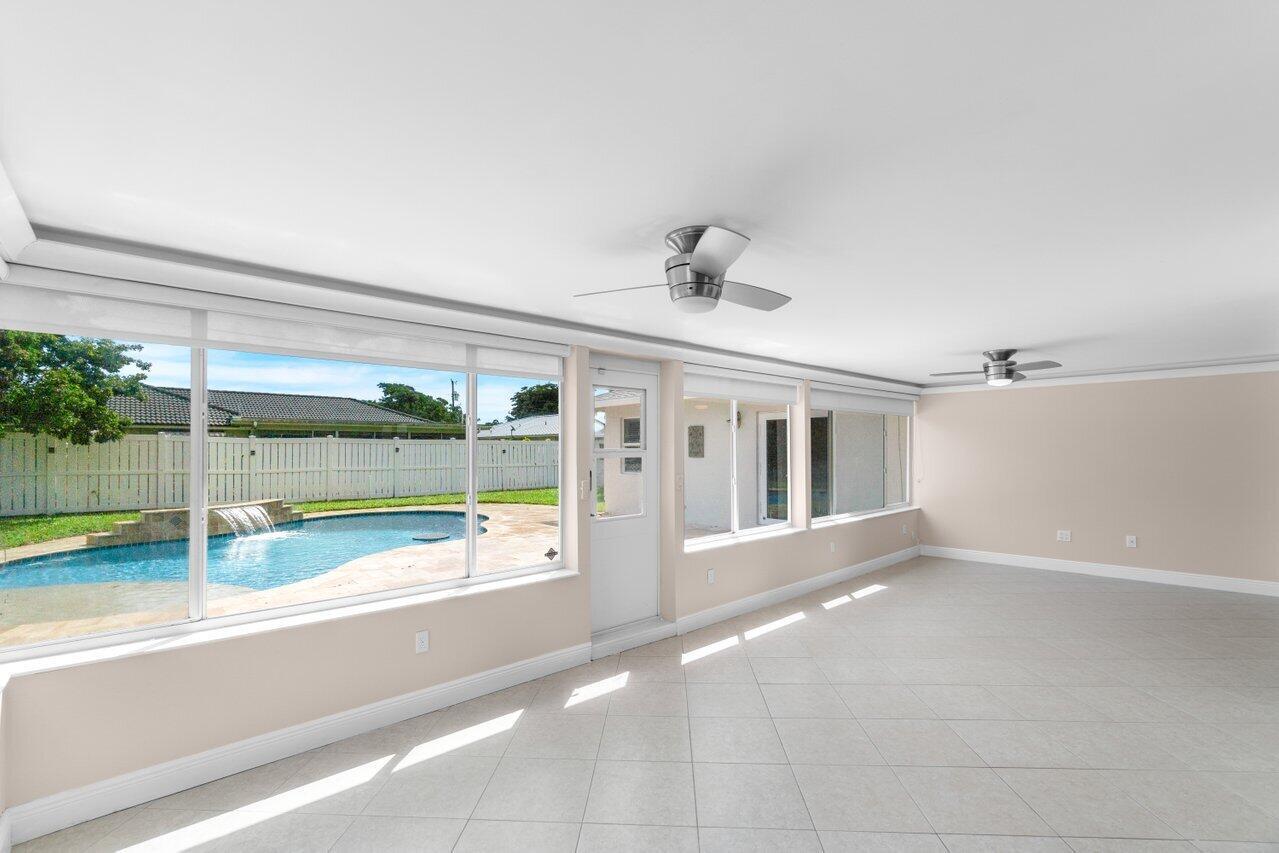 Welcome home to this spacious and beautifully appointed single-family home in the highly sought-after Boca Raton Square. Brand New Roof, Chicago brick paver driveway, custom built pool, welcoming entry that leads you to a large living room, and formal dining room area. Open floor plan. Kitchen is complete with stainless steel appliances and a granite countertop. Florida Room offers plenty of space for additional living and entertainment options. The custom primary suite is a true retreat with its ensuite bathroom that boasts a spa tub, walk-in shower, and a double vanity. French doors provide convenient access to the backyard, where you'll find a true tropical oasis. NO HOA. Baby gate for pool.