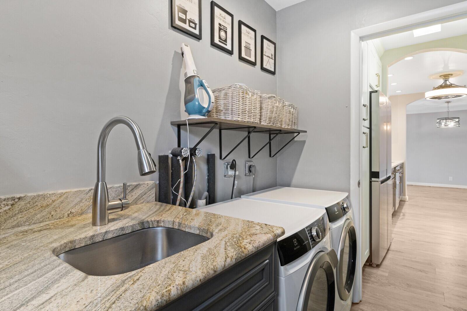 Great 4BED/3BATH, 2 XL MASTERS, >2000 sft; NEWLY REDONE; ROOF IN 2008, PVC PIPES UNDER THE HOUSE! IMPACT DOORS/WINDOWS, OPEN CONCEPT. LUXURY KITCHEN w/Smart White/Blue Cabinets, Gold Hardware, ALL APPLIANCES, including LATEST 4 DOOR WHIRLPOOL REFRIGERATOR/FREEZER, Double Pantry, QUARTZ countertops. NEW: LVP tile floors, AC, Designer Fixtures and High Hats throughout. Some photos staged w/furniture. The LAUNDRY ROOM has the latest ELECTROLUX STACKABLE washer/dryer. The huge great room is your entry where all of your friends and family will be, BUT there's also a LARGE FAMILY ROOM and FIREPLACE for a separate space when you want to converse, read or just relax. Step outside: NEW HEATED POOL and JACUZZI ! The 6' PRIVACy fence makes the outdoors as inviting as indoors. Of course there's a