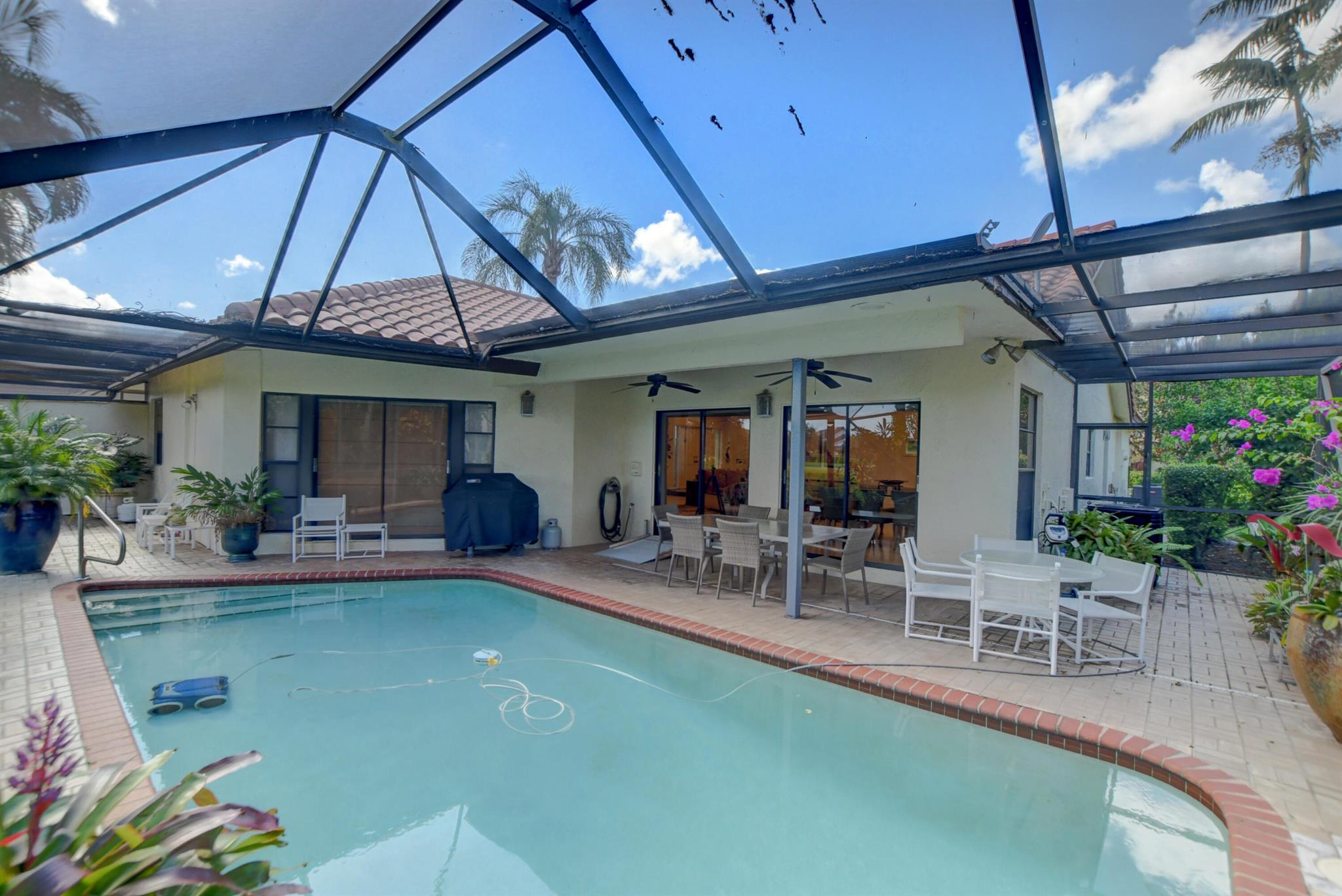 Rarely available immaculate pool home located in popular Esplanada at Boca Pointe. Redone w/ open & expansive floor plan with beautiful golf views. Situated on large corner lot. Beside 3 large bedrooms there's a den area with a large bar area w/ 2 refrigerators. The Primary Bedroom has upgraded carpet & T.V. that raises up or down. Beautiful built-ins w/ glass doors. All baths are redone with either marble, stone or granite. Large kitchen boasts decorator granite countertops, stainless steel appliances & wood paneled cabinets. Large breakfast area in kitchen. Closets outfitted ! Both A/C units replaced, (1) is 2 years old, and other is approx. 7 yrs old. Large pool area overlooking golf course (15th hole). New Polaris pool cleaner. Fabulous home inside & out. Can be purchased turnkey.