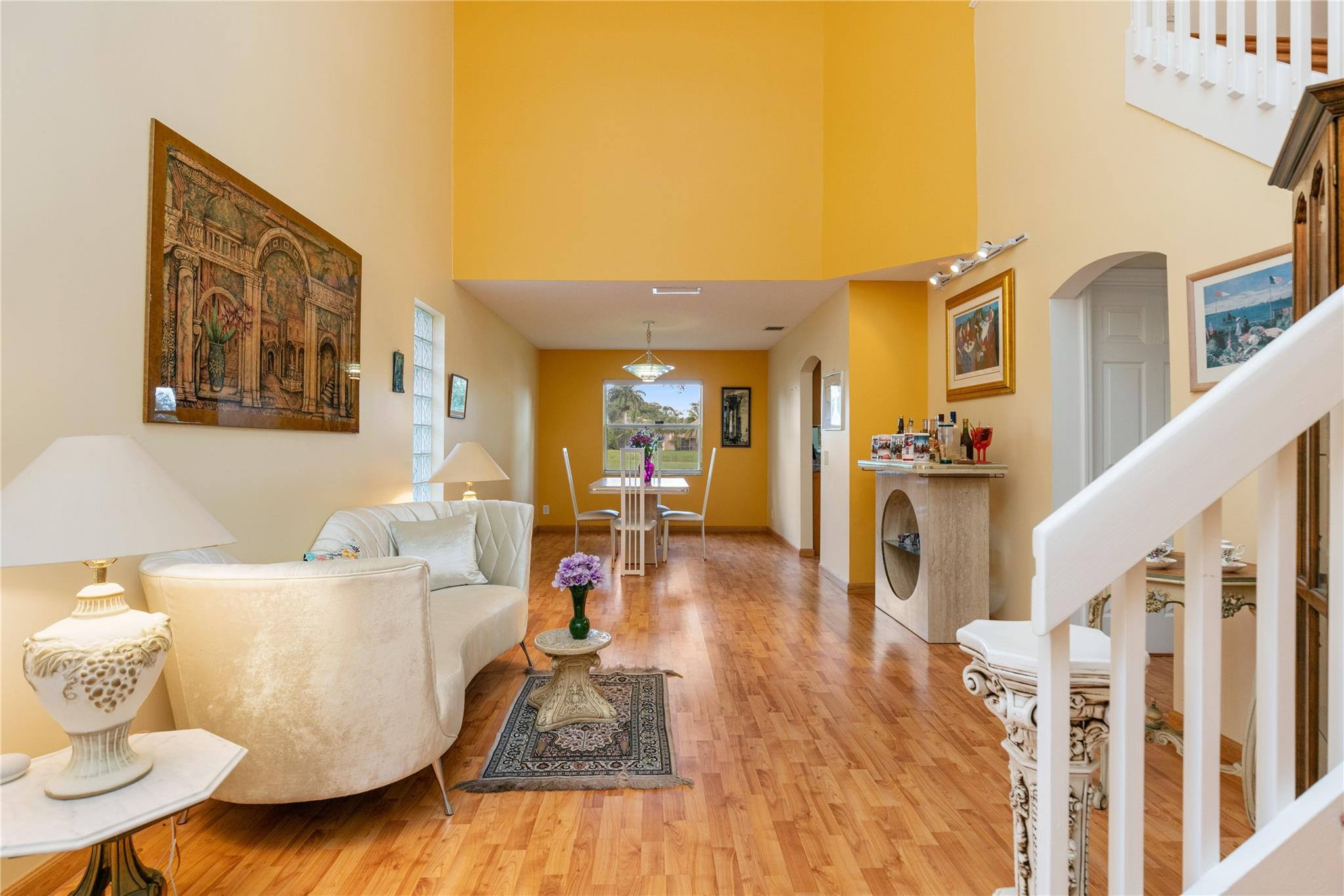 Step inside, & you'll be greeted by the grandeur of 18-foot volume ceilings, while the warm laminate wood flooring adds a touch of sophistication throughout. The heart of the home, an updated kitchen, beckons w/ wood shaker cabinetry, granite countertops, & sleek black stainless steel Samsung appliances. Entertain & unwind effortlessly on your covered patio, overlooking a generously sized waterfront backyard that promises serene moments by the water's edge. Retreat to the upper level, where all bedrooms offer privacy & comfort. The primary bedroom is a true sanctuary, offering scenic water views & an expansive updated bathroom featuring dual vanities, a Jacuzzi tub, & separate shower. Nestled within the gated community of Harbor Island, you'll have access to a community pool & playground.