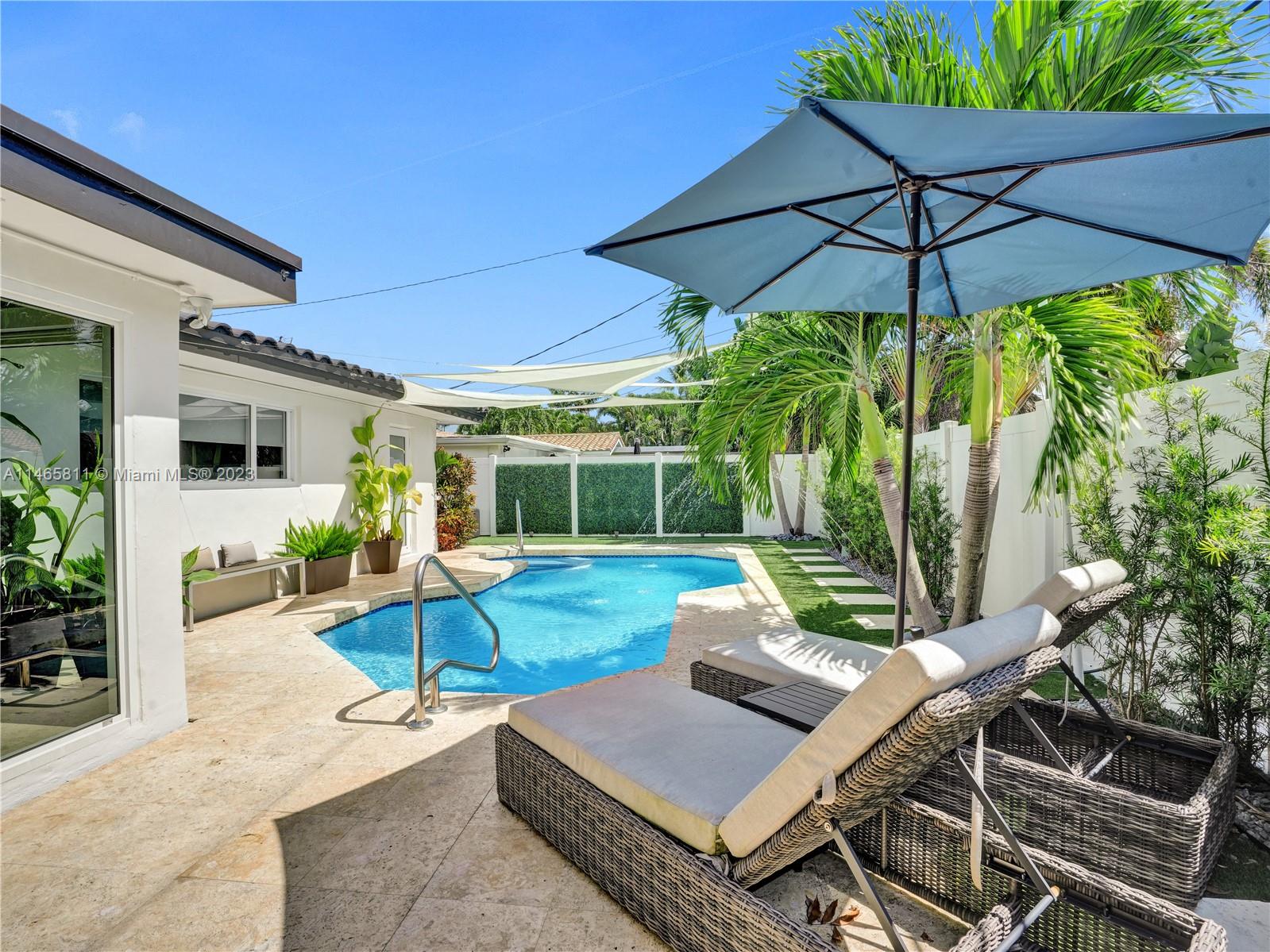 2/2 PLUS office! True tropical indoor/outdoor living in coveted Imperial Point – Minutes to Beaches. Open concept home with stone floors, Huge kitchen w/ quartz counters & separate bar area with 3-zone cooler & glass cabinets.