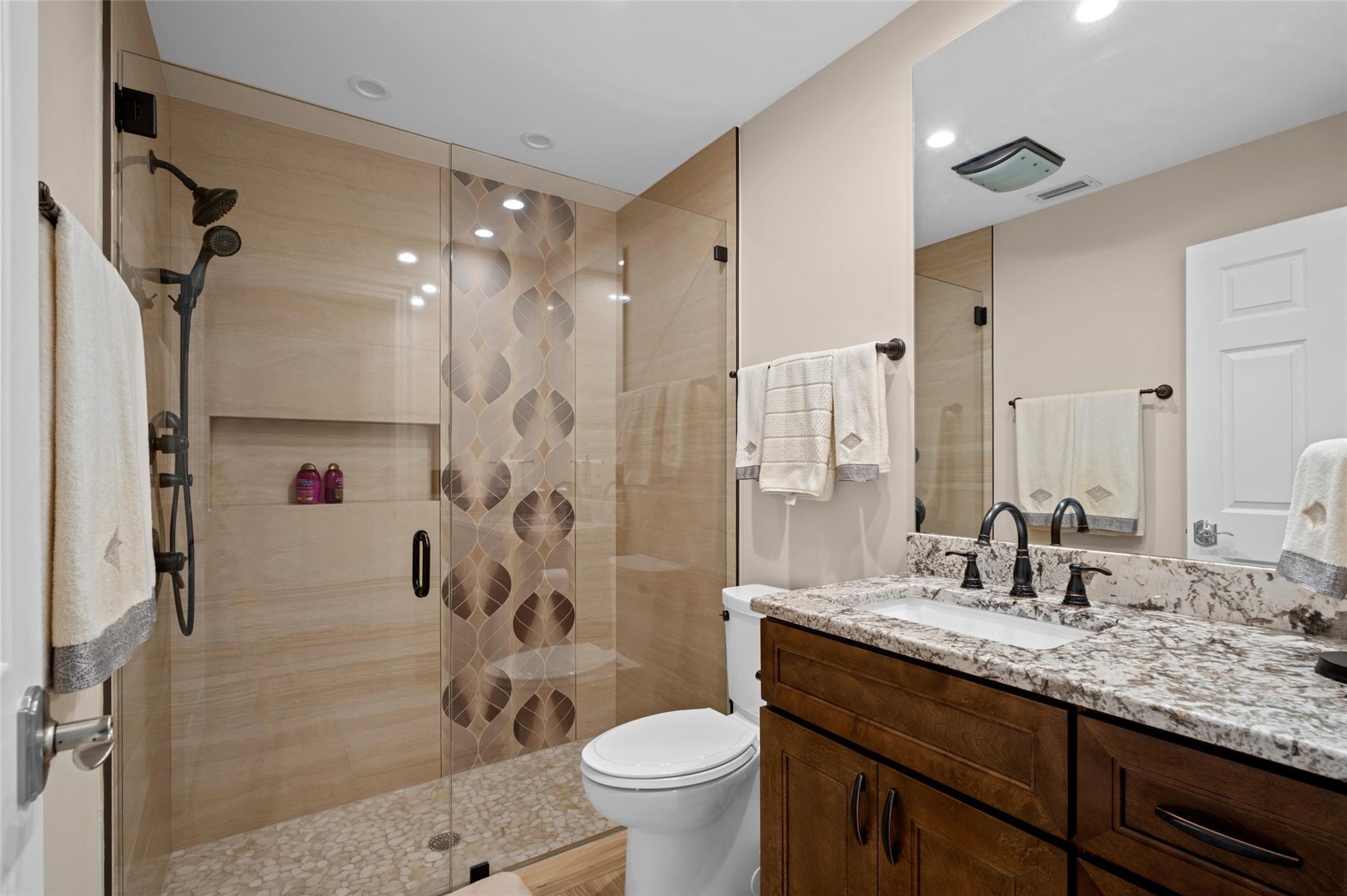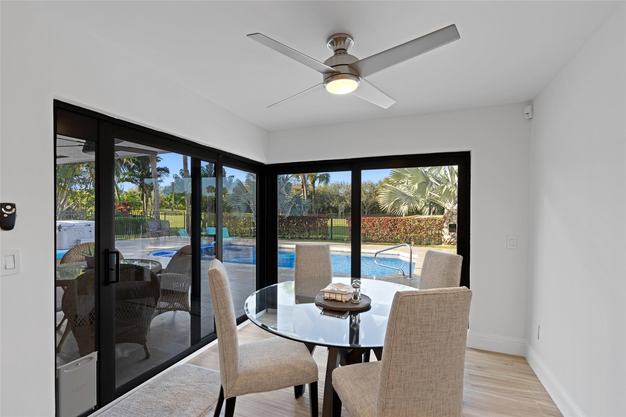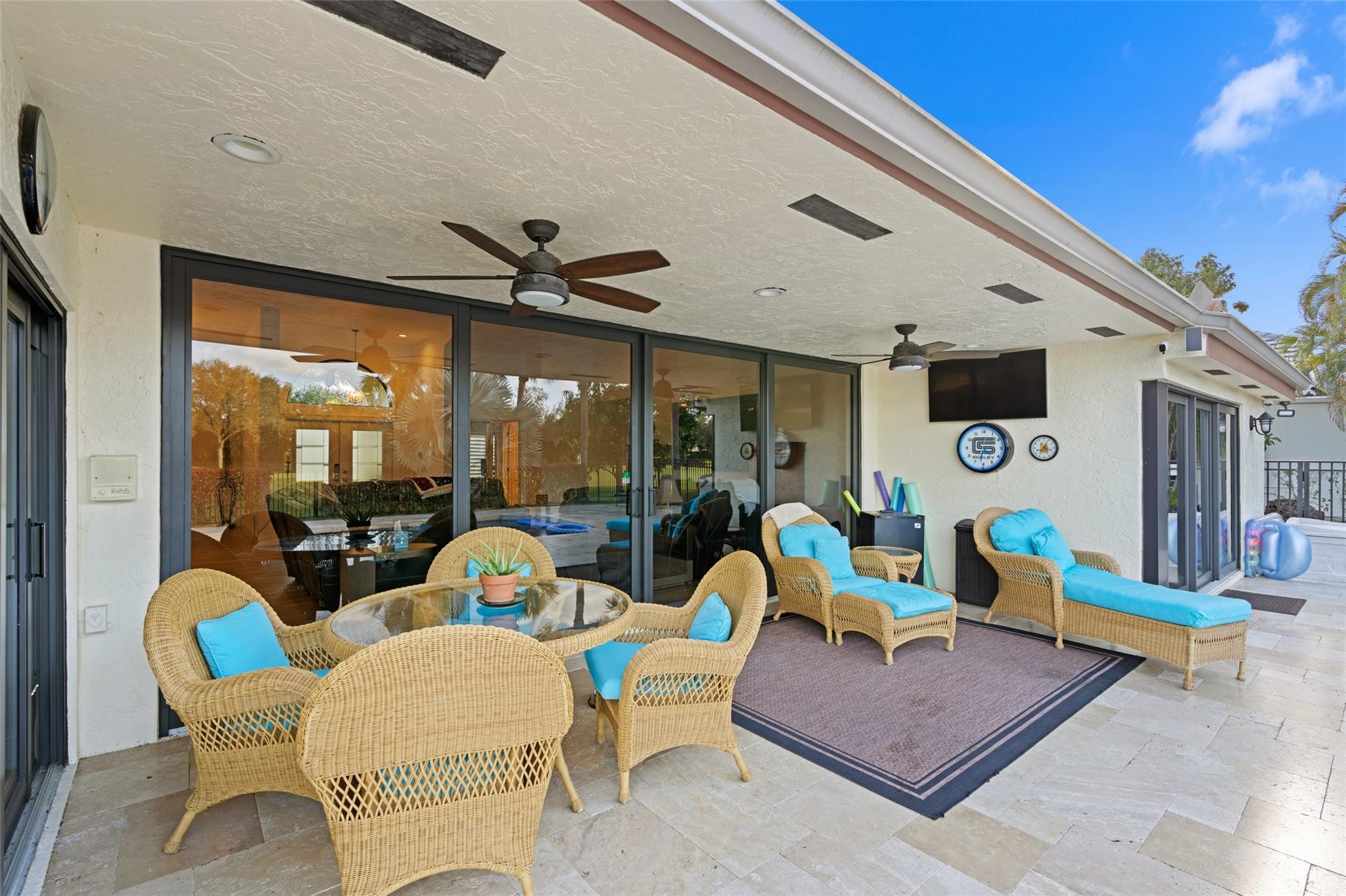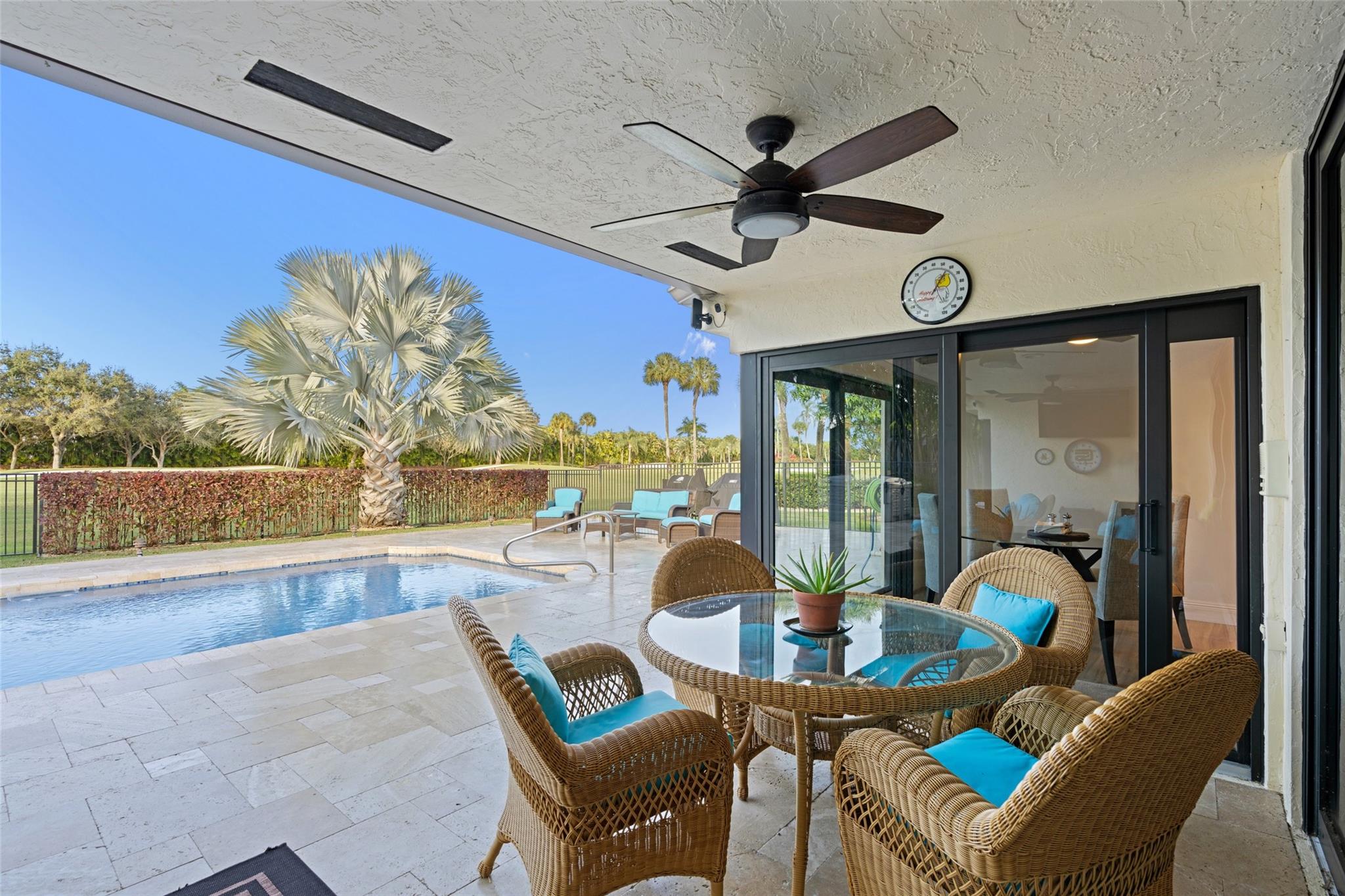 Enjoy the top quality renovation in this extended Brittany model home. This well configured split floor plan has a WHOLE HOME generator, impact windows and doors, 2022 AC. Custom kitchen with Kitchen wine fridge, 5 door refrigerator, double oven, ceramic cook top and dishwasher. Custom cabinets in all bedroom closets, 3 bedrooms (plus office, which has a closet) 3 full bathrooms. Large laundry room with LG pedestal appliances. A paved circular driveway, allows access to an immaculate garage, with tiled floors and custom cabinets. Huge patio with large undercover area. Beautiful golf views. Travertine paving surrounds the saltwater pool, which has updated automation, and custom landscape lighting. A state of the art security system completes this wonderful home.