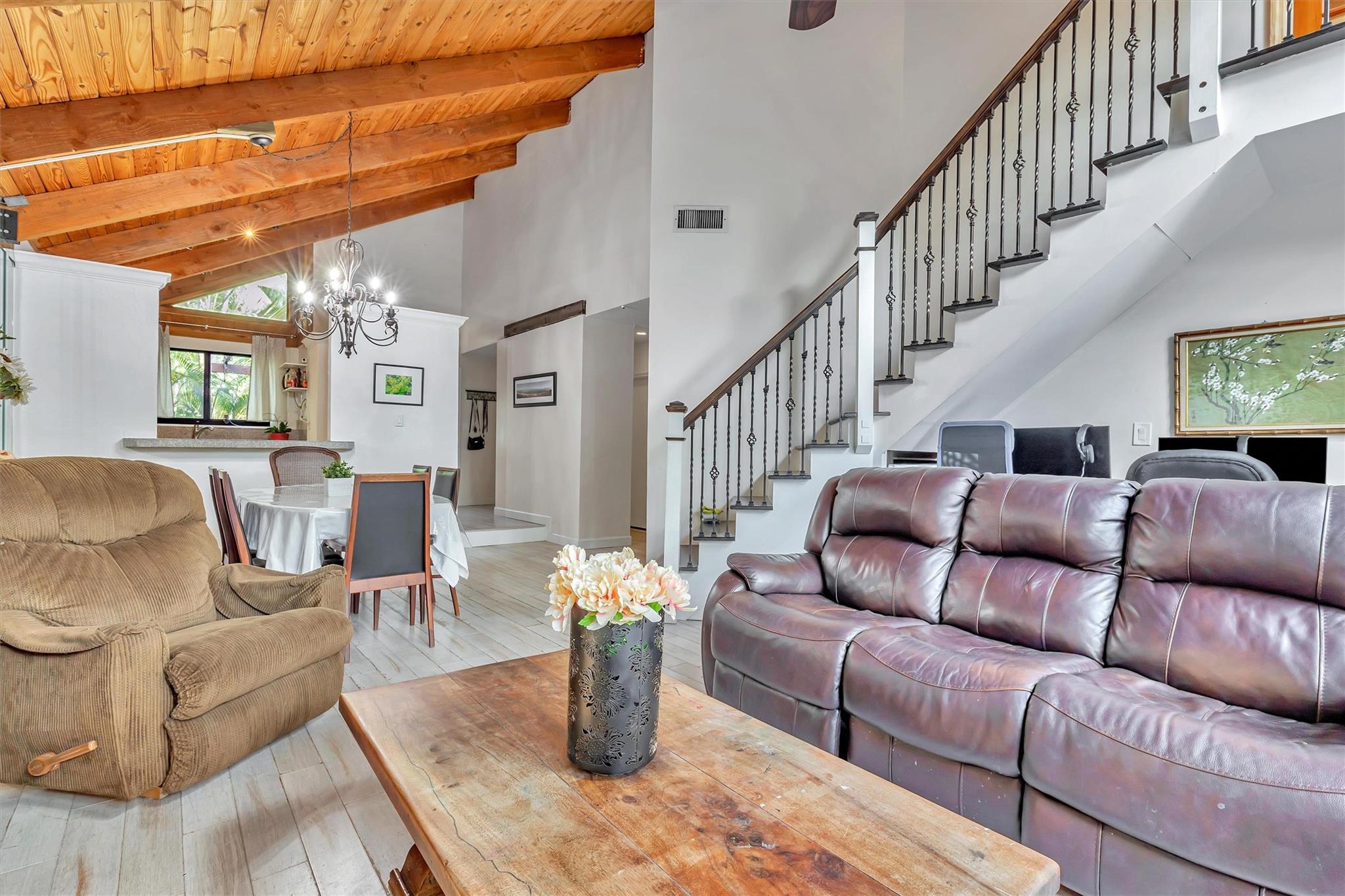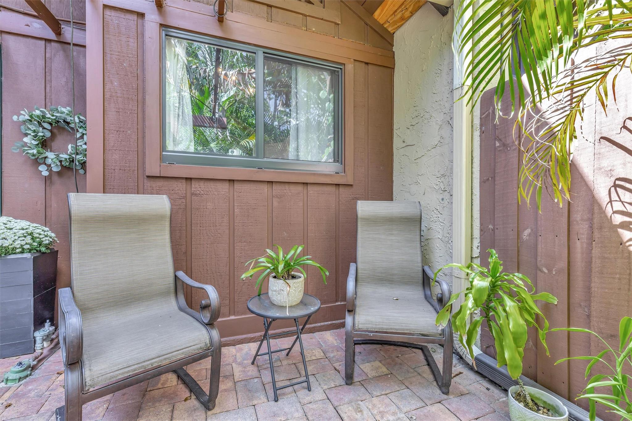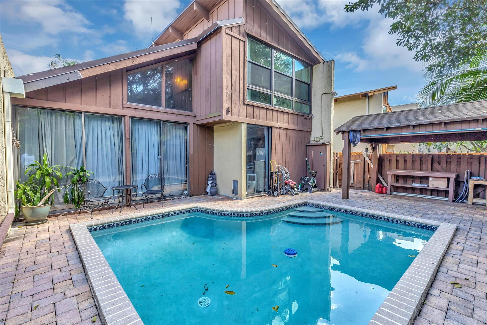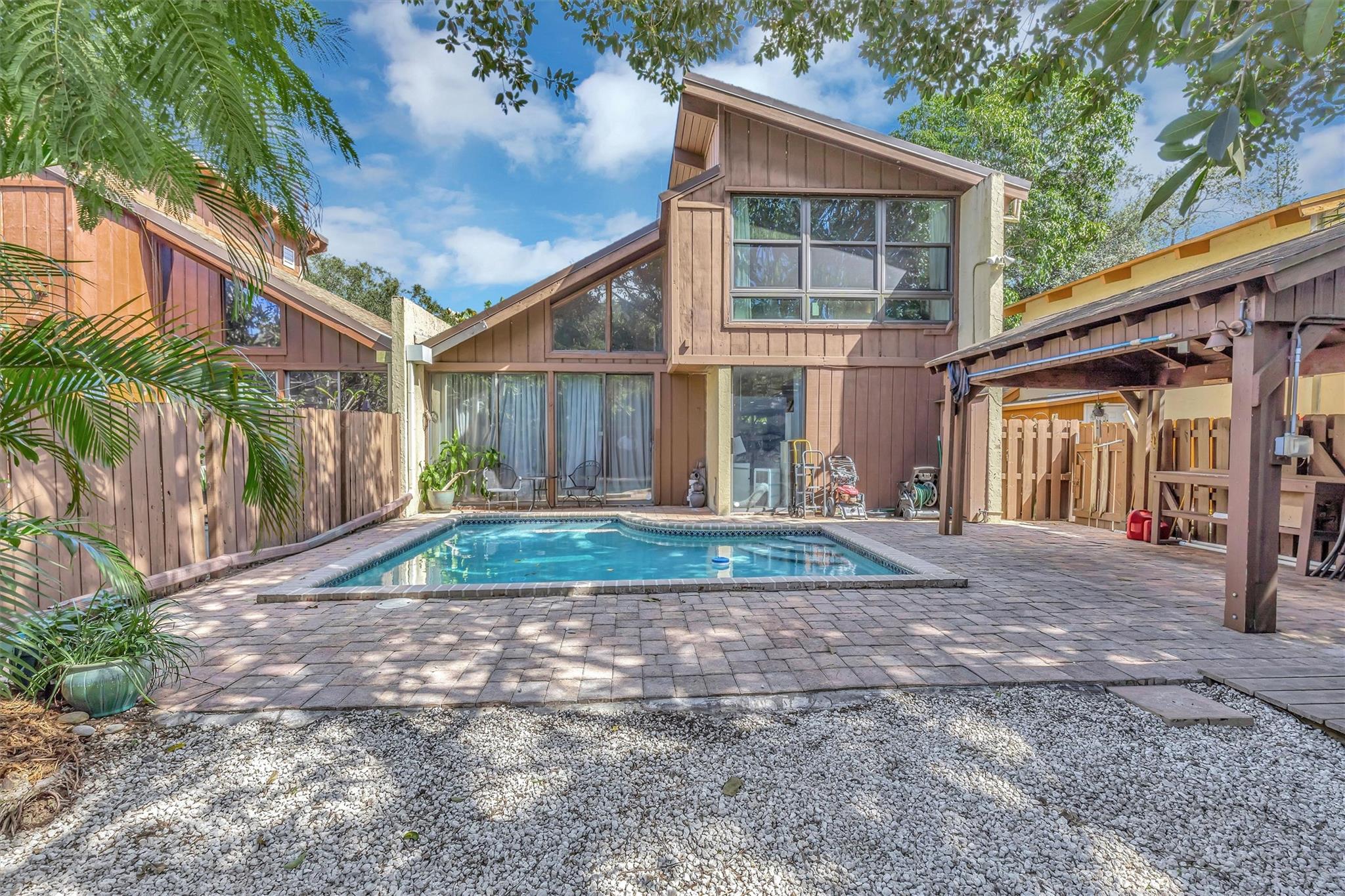 Distinctive and unique corner unit townhome has a single-family home feel! This hidden gem is located on a Cul-de-Sac in beautiful Palm Aire. Open concept floor plan has 3 bedrooms and 2 baths. Primary bedroom and loft are located on the second floor. The bedrooms have ample closet and storage space. The loft can be used as an office, playroom or nursery! The living area is light and bright and accentuated with vaulted and wood beam ceilings. Enjoy Florida outdoor living on the large, screened patio that's perfect for entertaining! Backyard bonus is your very own Private Swimming Pool! The property has a beautiful view of the nature preserve and the yard is fenced. Community is Pet Friendly! Roof 2022, Partial Impact Glass 2022, Electrical Panel 2022! Welcome Home!!!