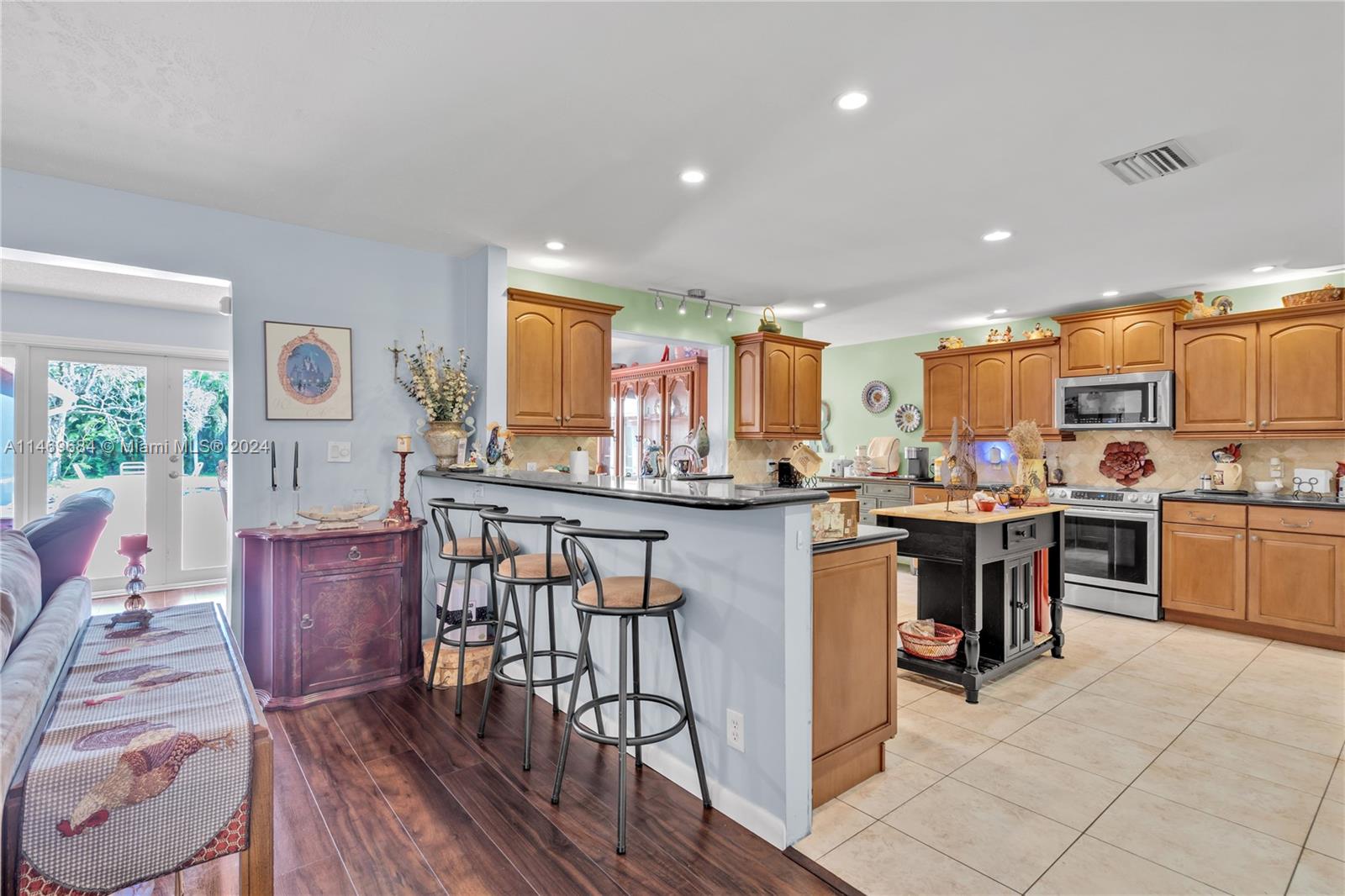 A hidden gem nestled on a private 1.05 acre lot. This spacious 5 bedroom 4 bath split floor-plan POOL home features three bedrooms with their own private en-suite and two guest rooms. Beautiful porcelain tiles in the kitchen and foyer & beautiful dark wood like flooring in the family and dining room. The kitchen was tastefully updated with real wood cabinetry, granite countertops & stainless steel appliances. The roof was replaced in 2017, the home has a large laundry room under air with a washer/dryer, 2nd fridge & freezer, 2 car garage, and new impact windows & doors (December 2022) throughout. This home is within walking distance to Hawkes Bluff Elementary School AND has NO HOA!!