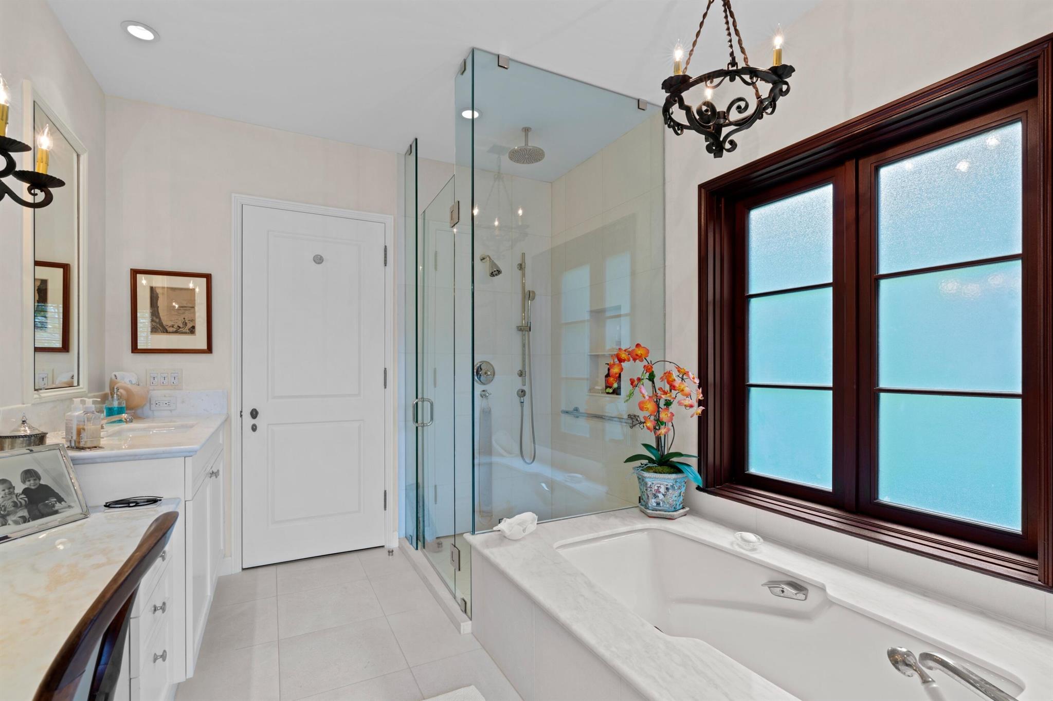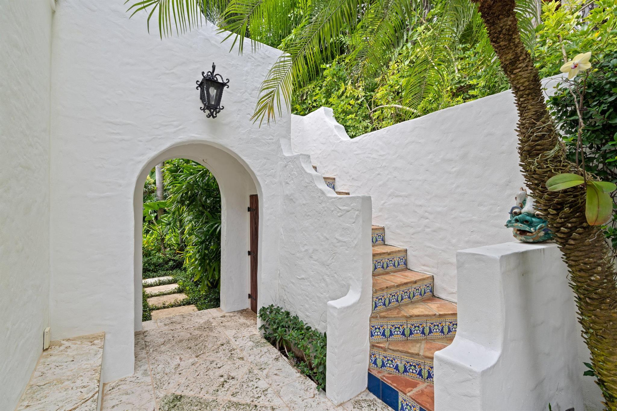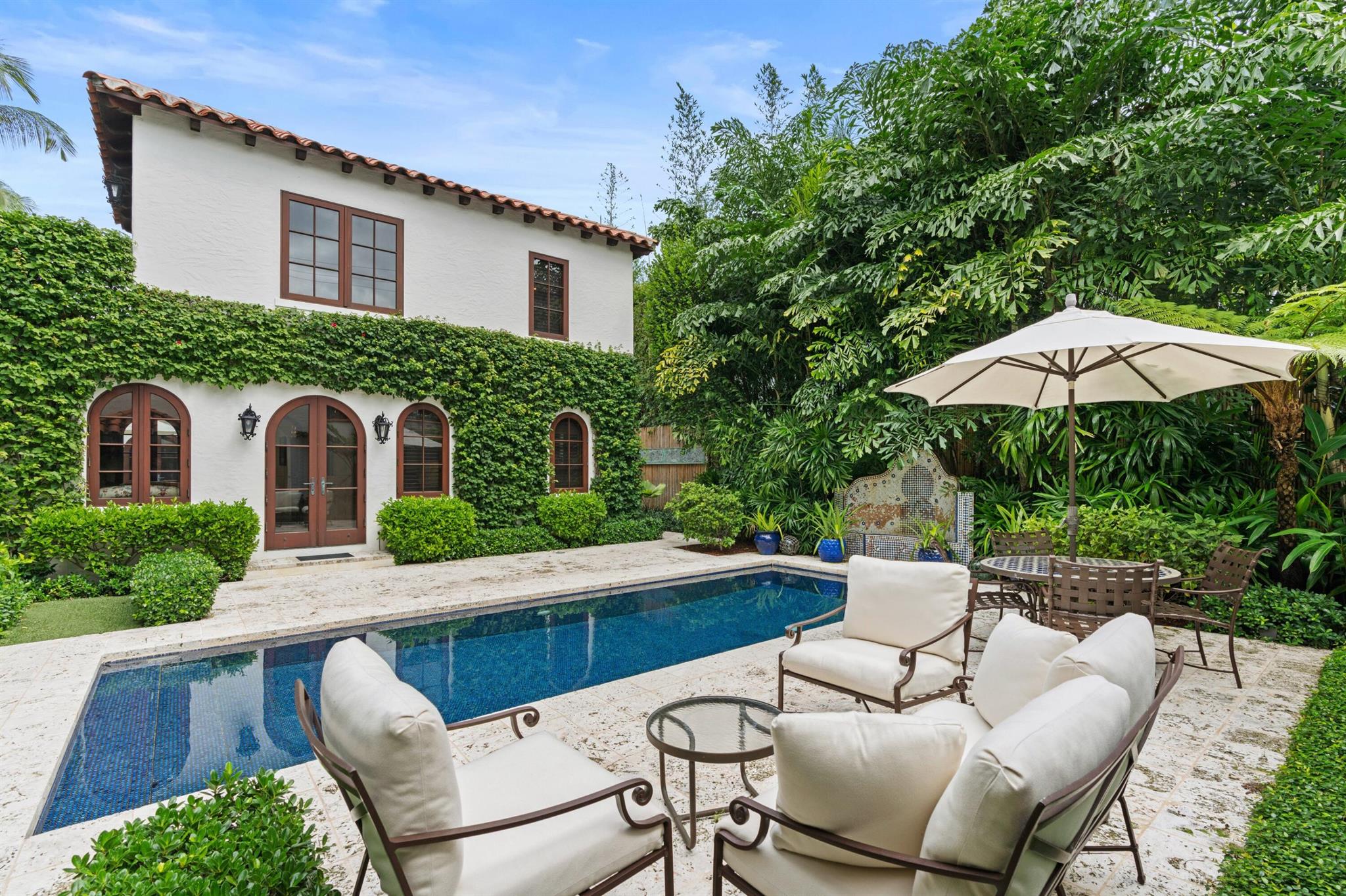 Winner of 2014 Polly Earl Award from the Preservation Foundation of Palm Beach, this rarely available single-family home designed by master architect Maurice Fatio in 1924, sits a half-block from the new Town Docks, on one of Palm Beach's most coveted mid-town streets. The property includes three private courtyards with coquina stone terraces, two fountains and a 10' x 25' heated pool. Meticulously and expertly restored, expanded and renovated, the house reflects a seamless combination of original details and modern conveniences, including the highest level of finishes, impact doors and windows.An arched entry foyer with powder room leads to a stunning living room with vaulted pecky cypress ceiling, original tile floors, and a gas fireplace with mantle fabricated by Herpel.