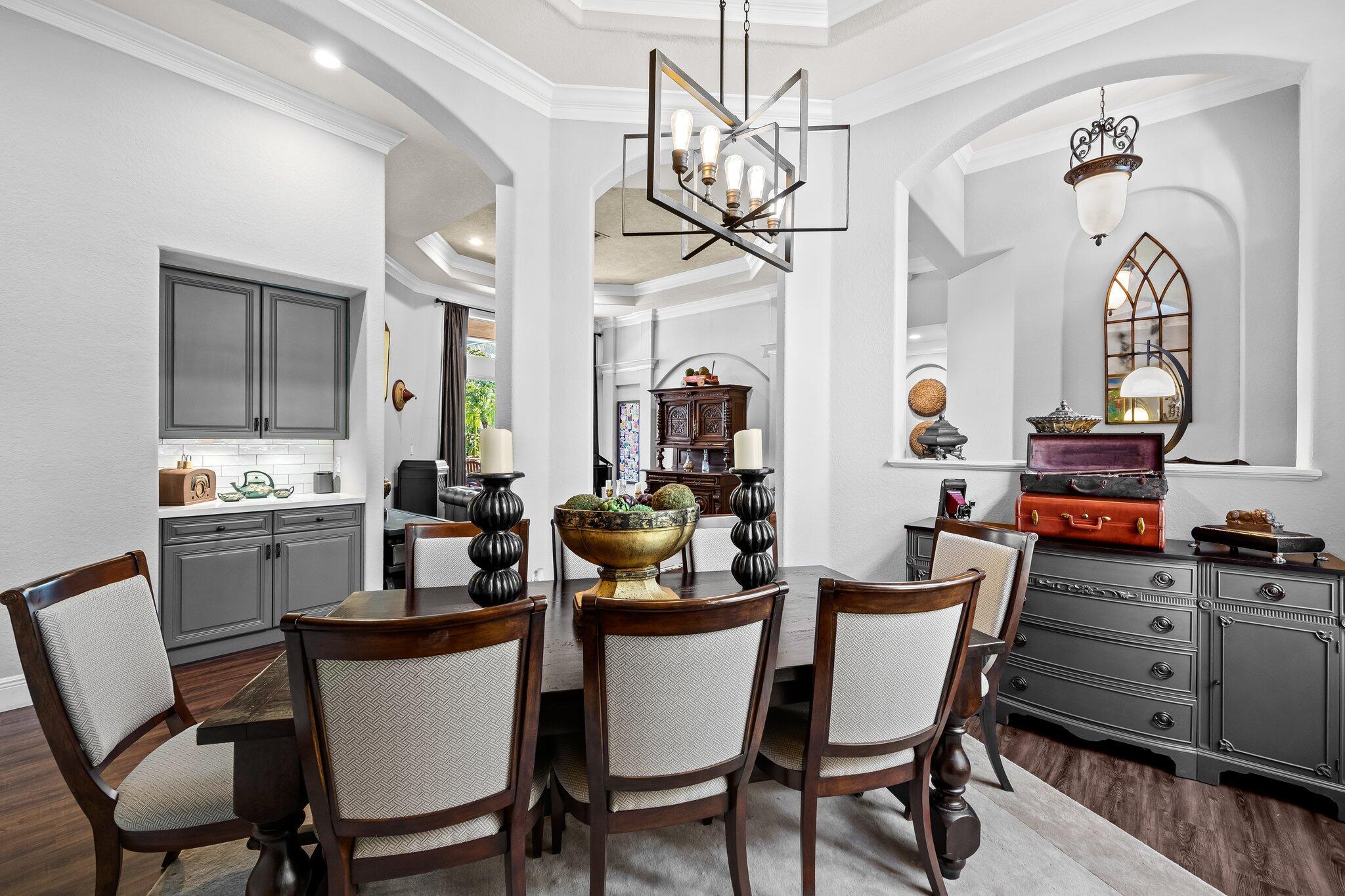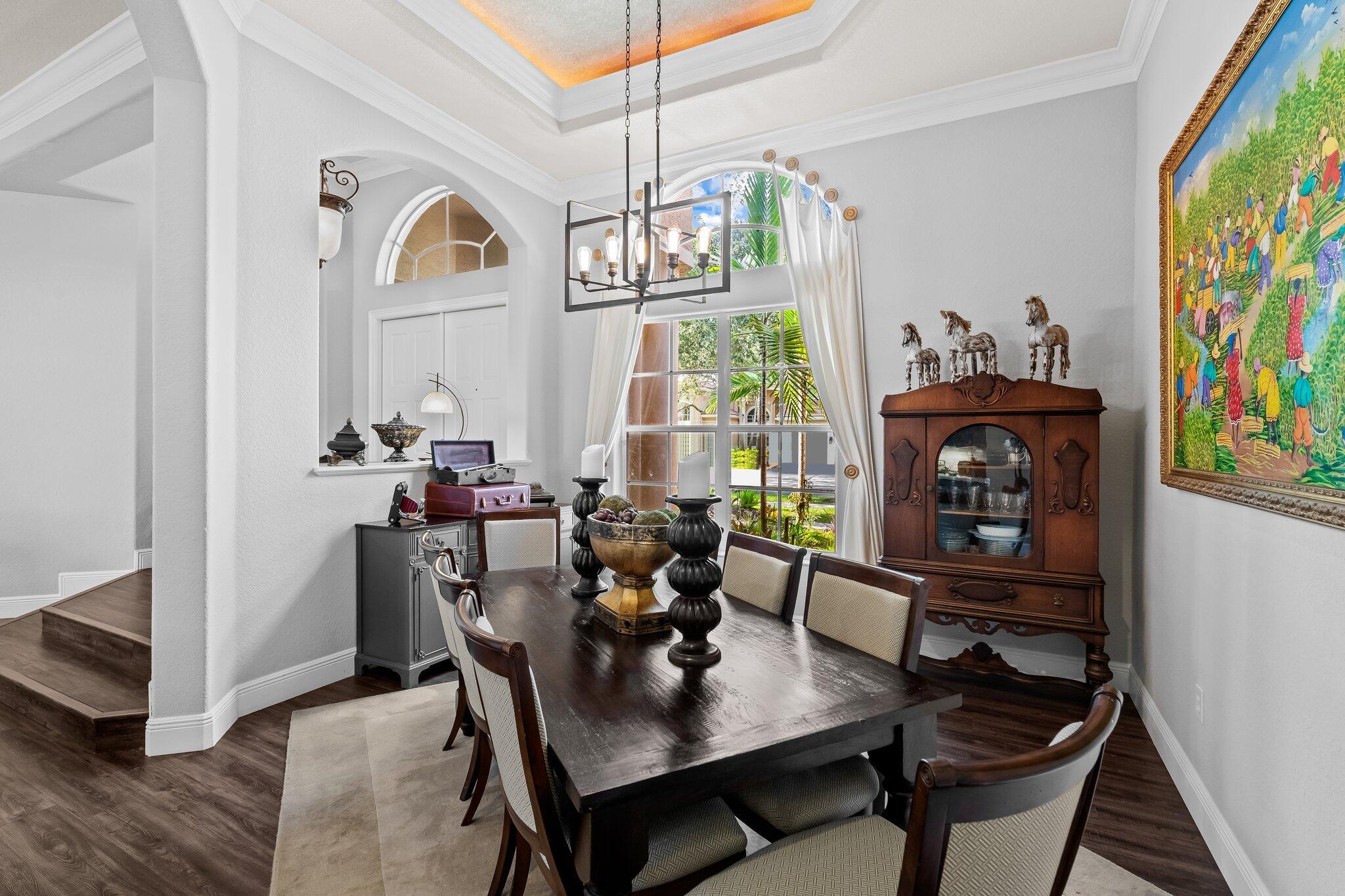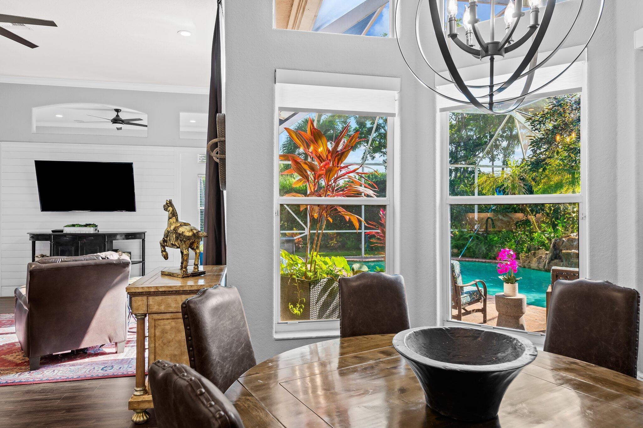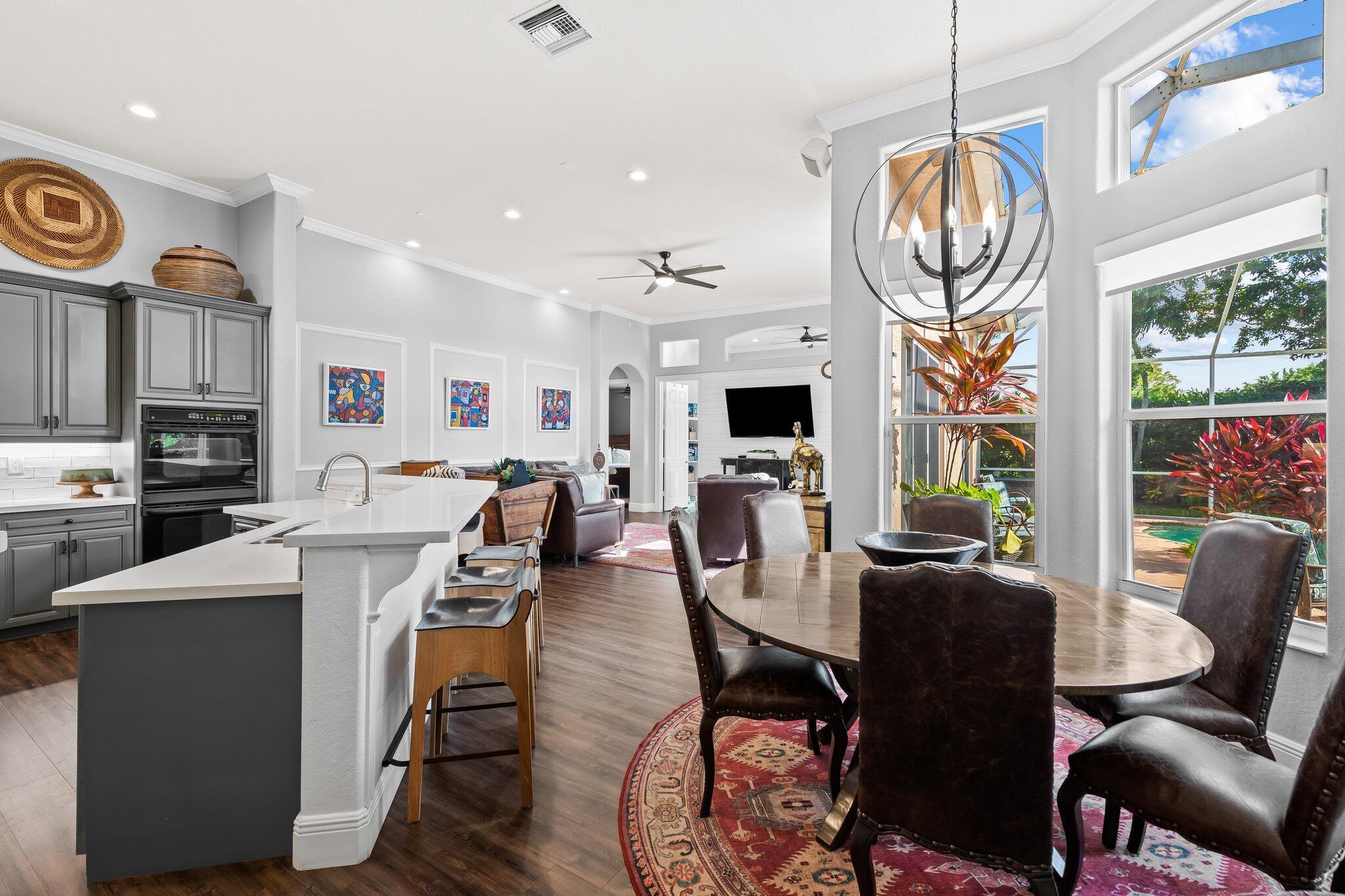 Beautiful one story Raphael model with 5 bedrooms, 3 full baths plus bonus room. This home is located on a quiet tree lined street in highly sought after Saturnia. This three way split floor plan with soaring ceilings, large foyer, luxury wood-look vinyl floors & lots of windows overlooking the pool & patio. Kitchen features wood cabinets, island for additional prep area, quartz countertop & counter height bar overlooking the family room. A walk in pantry for extra storage. Additional breakfast nook located off kitchen. Large family room perfect for entertaining. The bonus room is oversized making an awesome playroom, craft area or office. A peaceful primary suite with large windows overlooking the pool & patio with sitting area, two large custom built-in closets & double vanities
