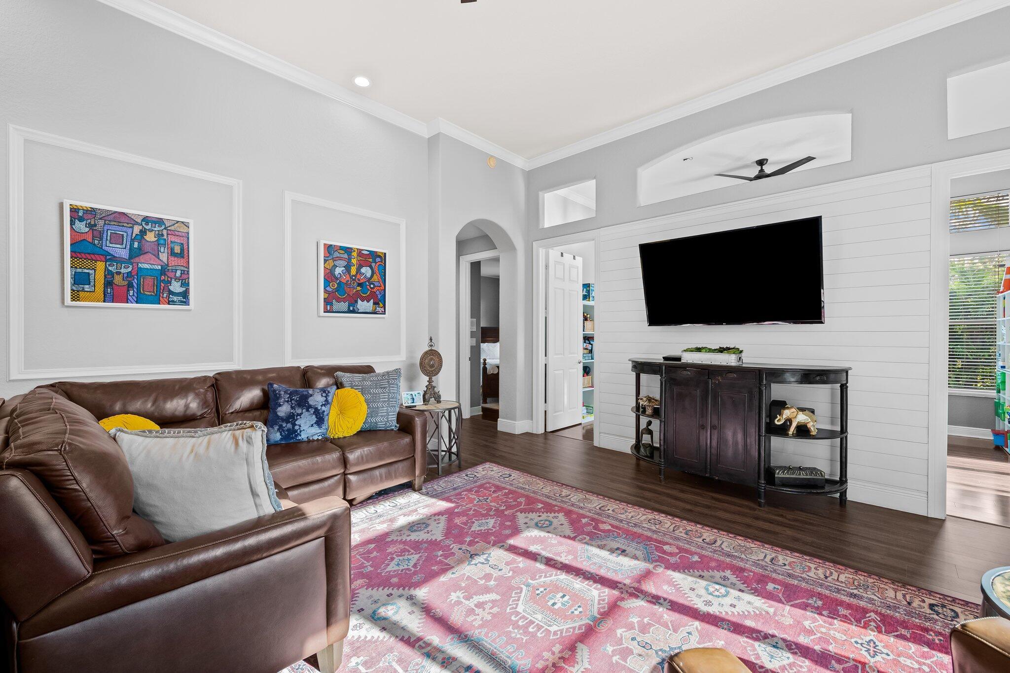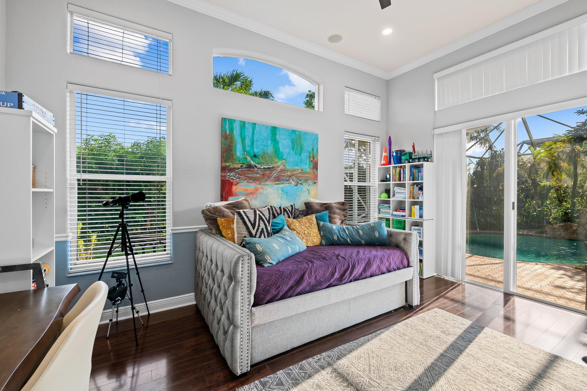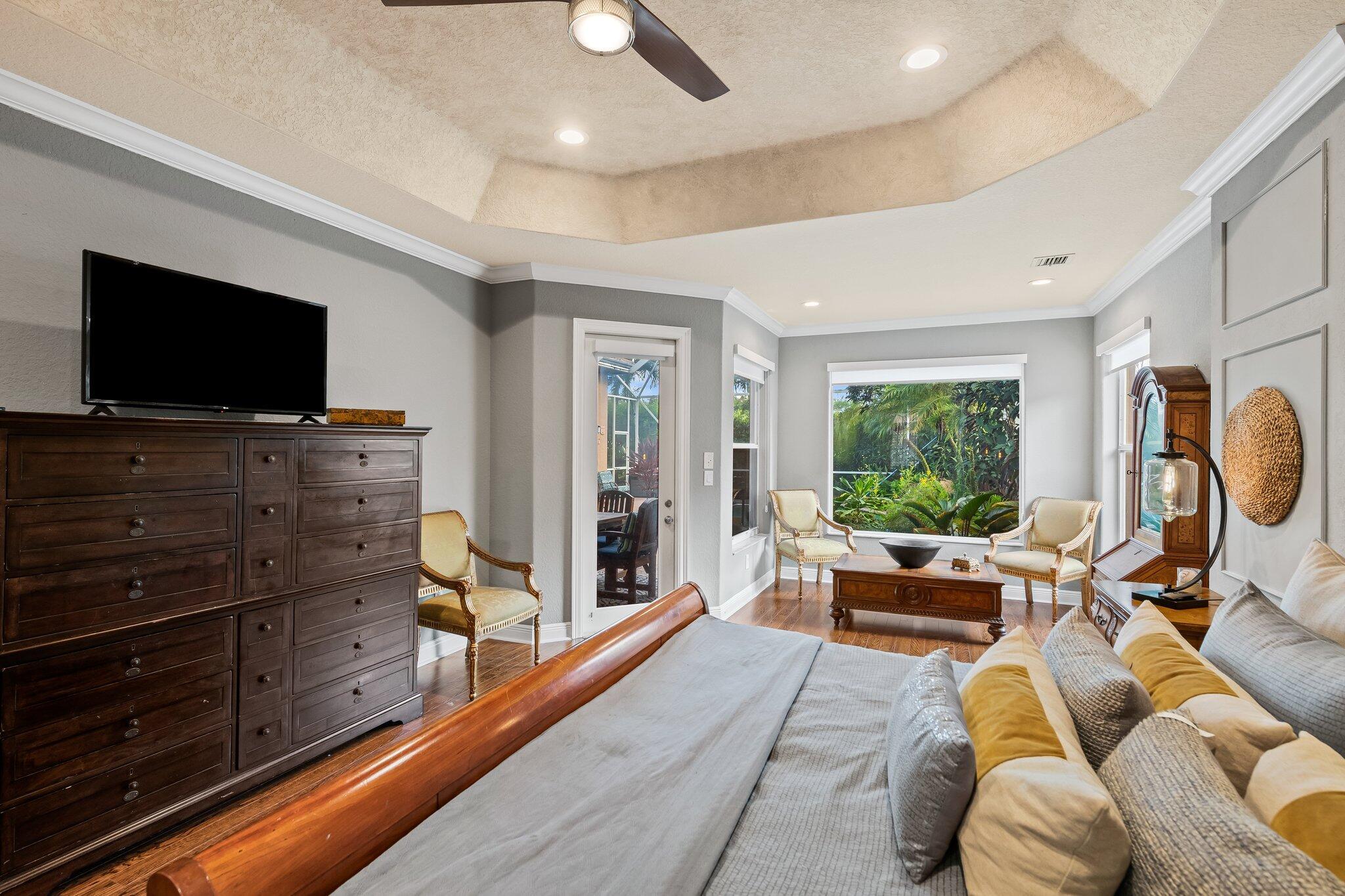Beautiful one story Raphael model with 5 bedrooms, 3 full baths plus bonus room. This home is located on a quiet tree lined street in highly sought after Saturnia. This three way split floor plan with soaring ceilings, large foyer, luxury wood-look vinyl floors & lots of windows overlooking the pool & patio. Kitchen features wood cabinets, island for additional prep area, quartz countertop & counter height bar overlooking the family room. A walk in pantry for extra storage. Additional breakfast nook located off kitchen. Large family room perfect for entertaining. The bonus room is oversized making an awesome playroom, craft area or office. A peaceful primary suite with large windows overlooking the pool & patio with sitting area, two large custom built-in closets & double vanities