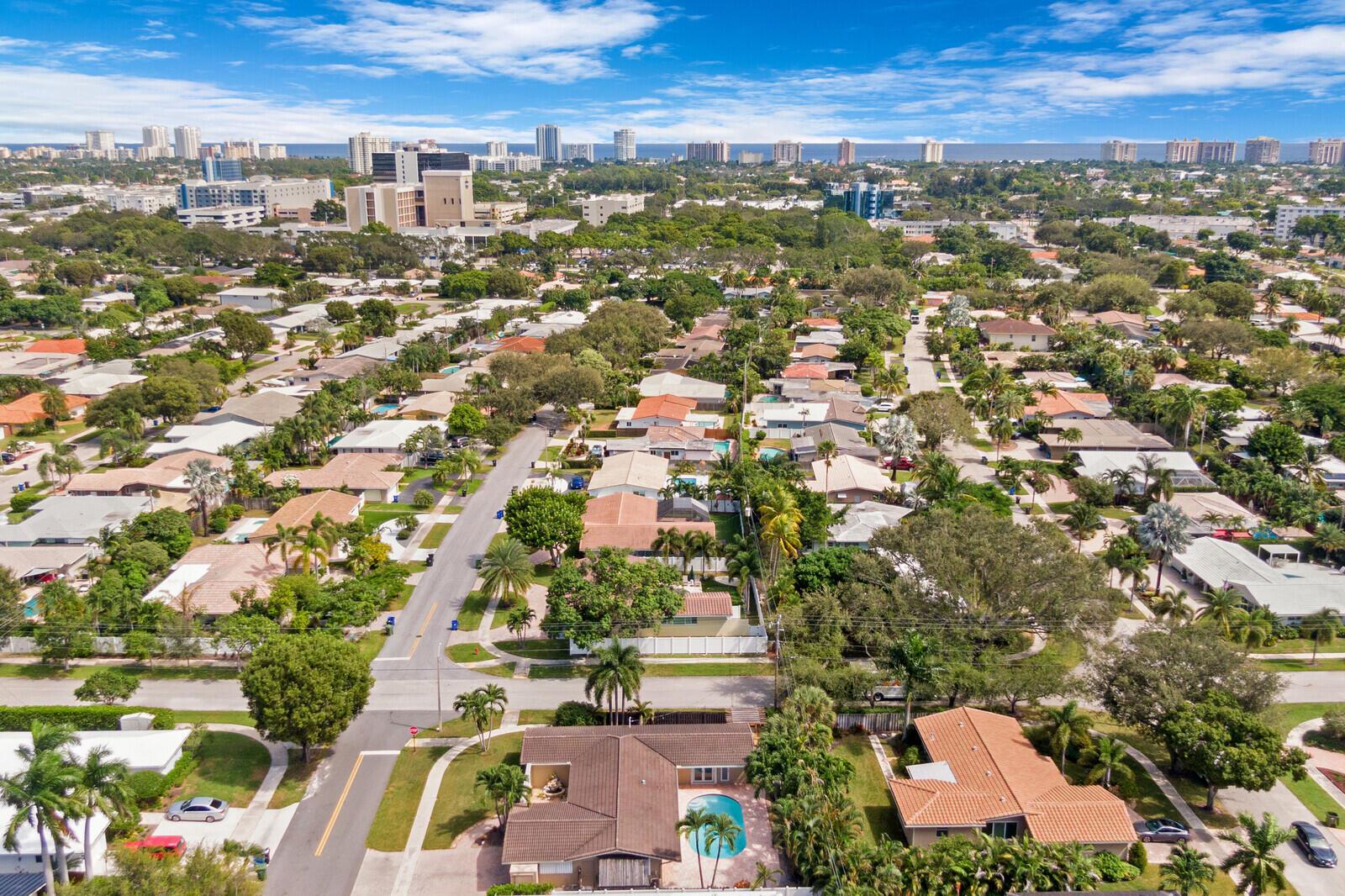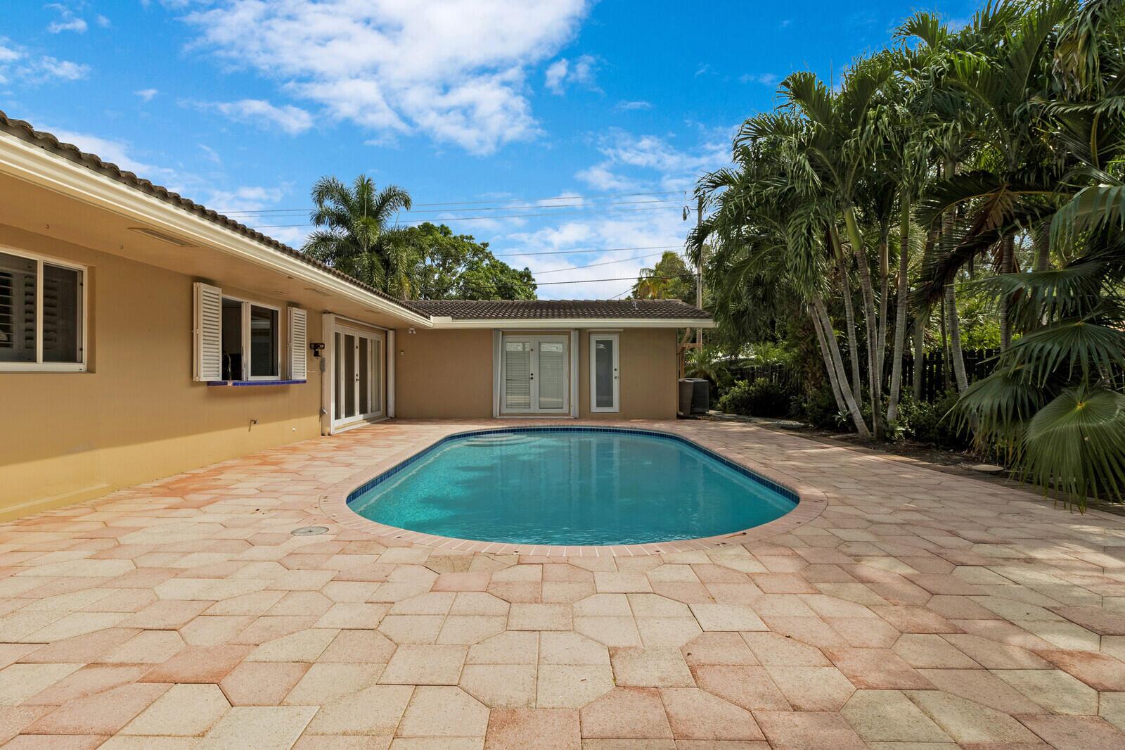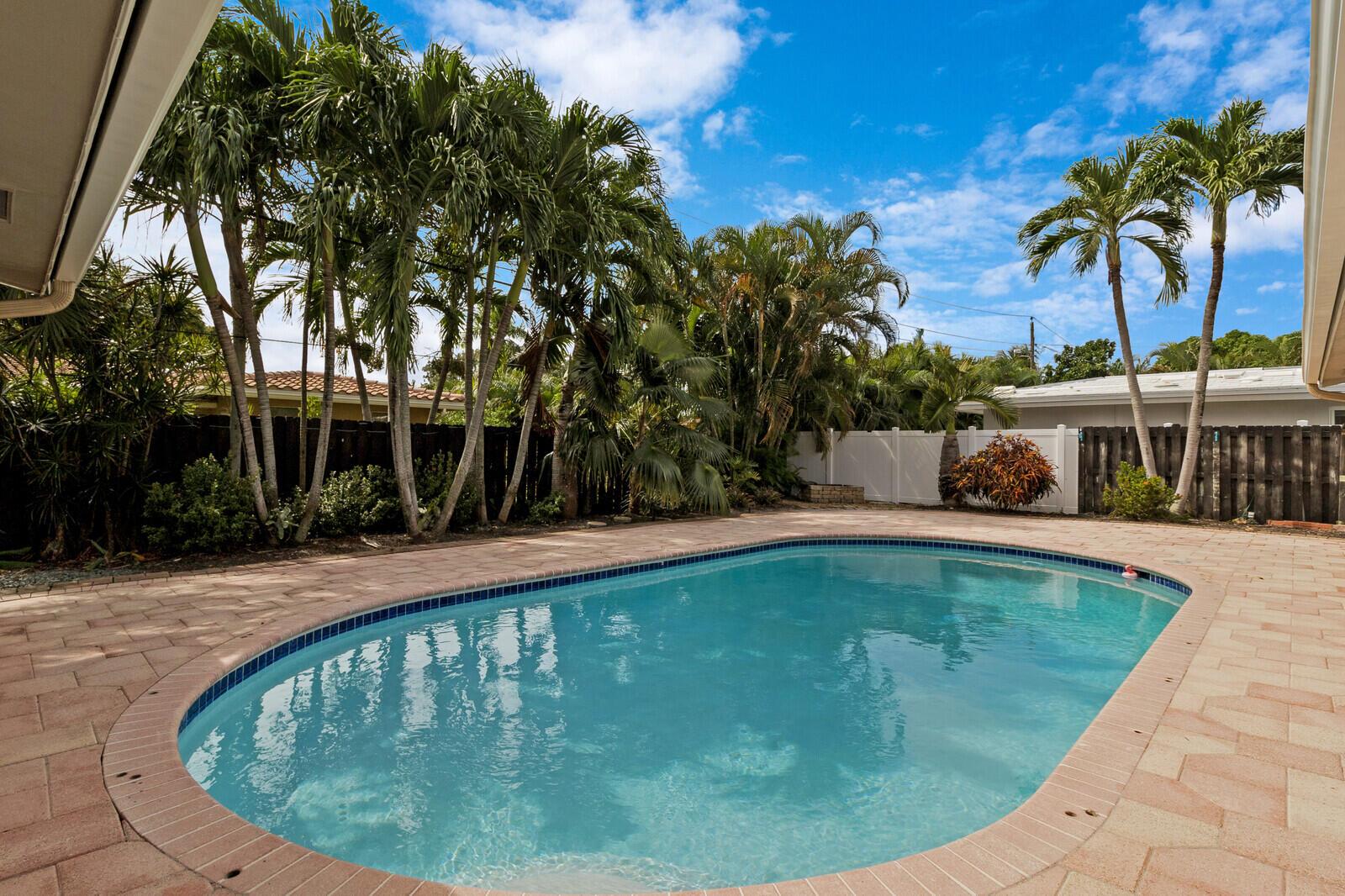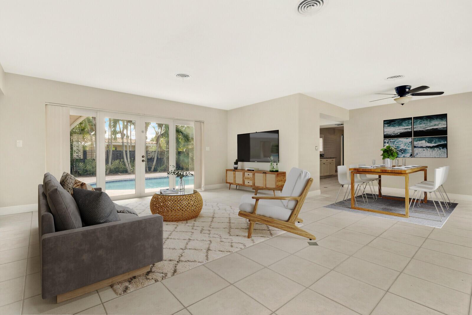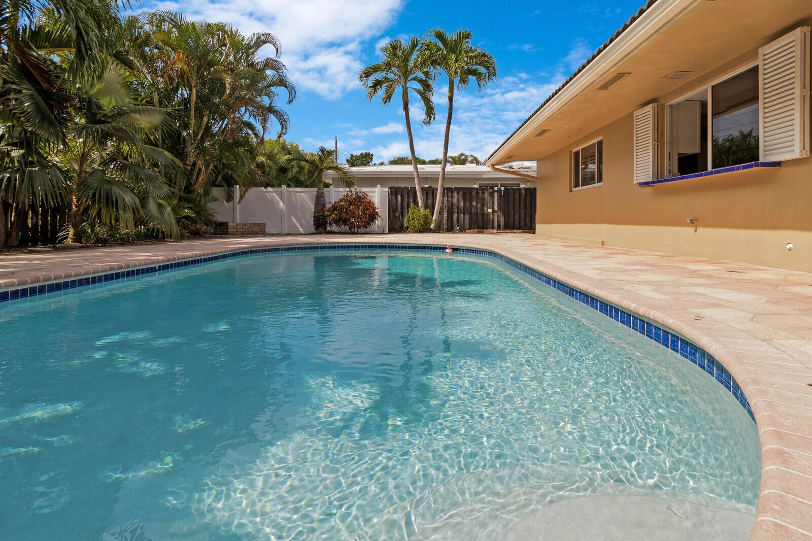 FOUR (or 5) BEDROOM + OFFICE IN IMPERIAL POINT ! 2 MILES TO THE BEACH. Some photos have been staged. This seldom available floor plan is what you have been waiting for. CORNER LOT. NO PET OR RENTAL RESTRICTIONS, 2 car garage, GORGEOUS POOL w/HUGE non-slip POOL DECK and 2 SIDE YARDS. Now that i have you attention, let me explain more fully. The first thing you will love is the Courtyard Entry, which can be gated so NO ONE CAN KNOCK ON YOUR DOOR unless you let them in. This 25x14 feature offers extra privacy and security: as a sitting area or designed for children and/or pets to be outside and NOT by the pool. When you step into the large family room (20x17), you have the pool view and OPEN CONCEPT to the dining room and into the kitchen.