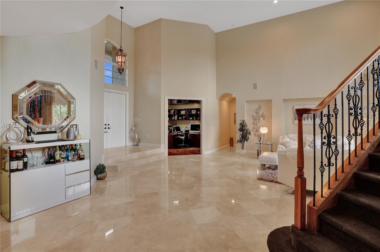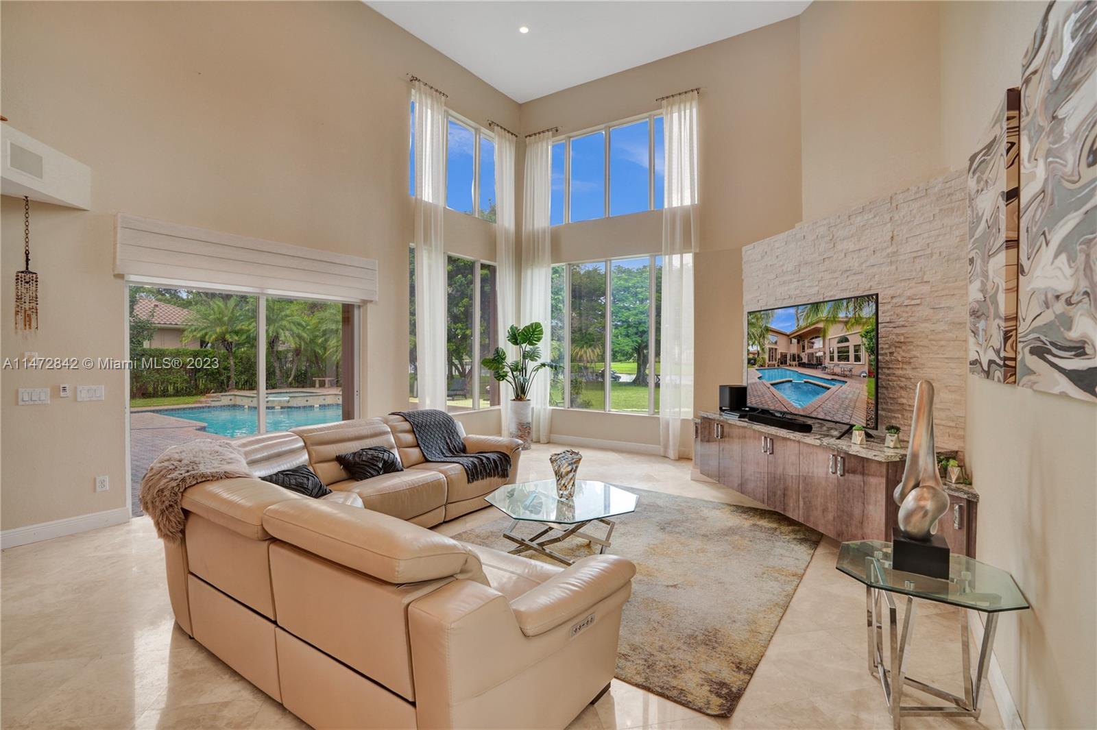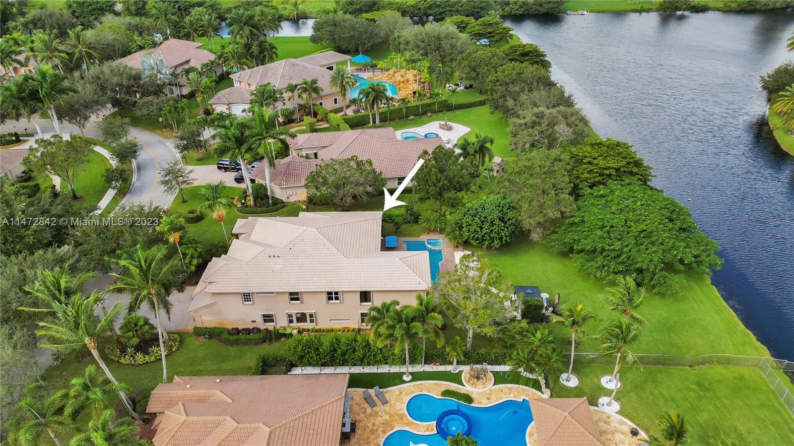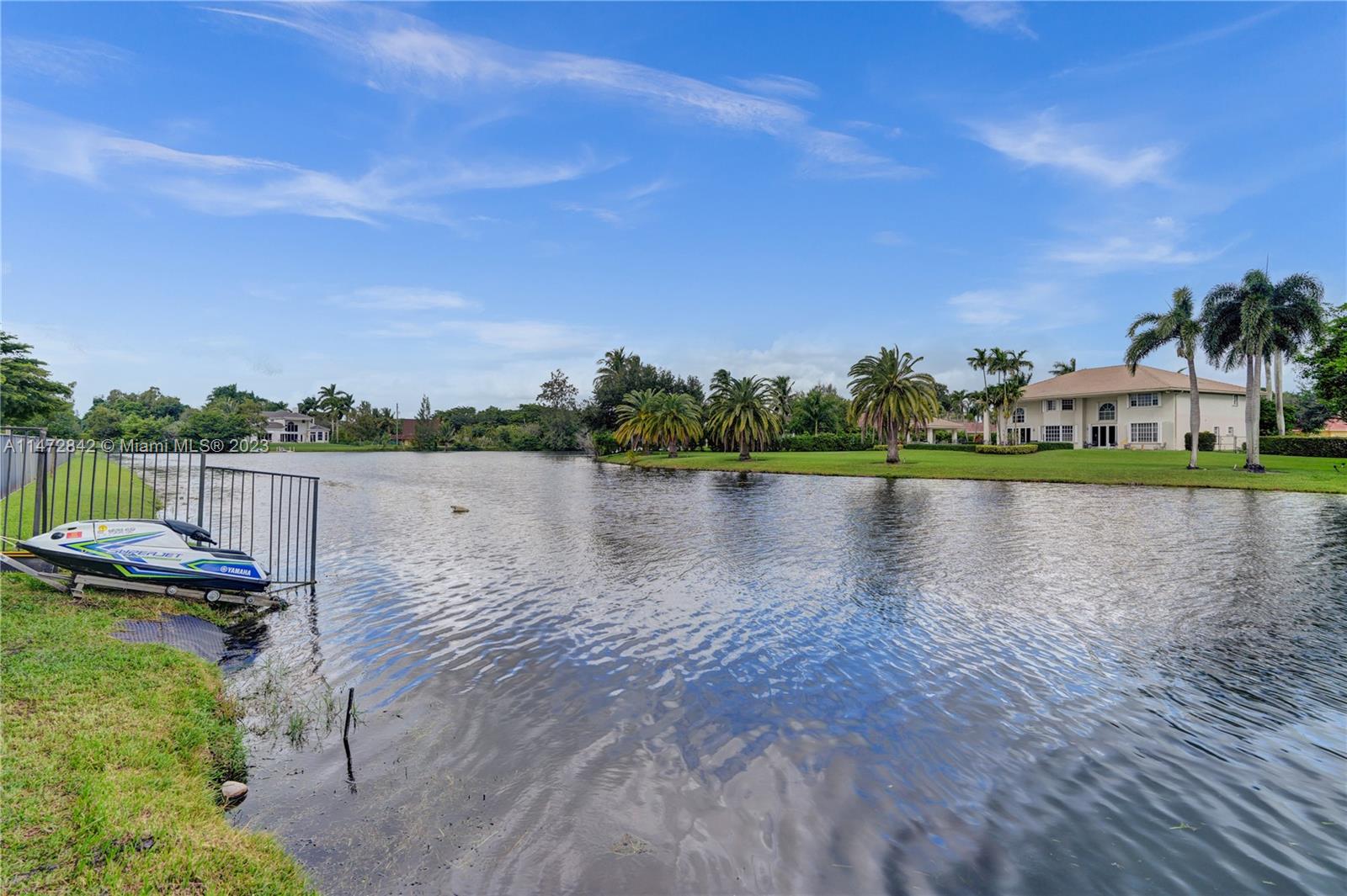 Exquisite lake home situated in the prestigious gated community of Long Lake Estates. Breathtaking views of the lake where you can enjoy waterskiing, this 5 bedroom 4.5 bath plus a dedicated office space complete with stylish built-in furniture, showcases soaring tray ceilings throughout the living spaces, elegant marble floors, situated in an oversized lot. This beautiful turnkey home offers a host of luxury elements including a grand entrance, a newly renovated kitchen with white quartz countertops and high-end stainless-steel appliances, a luxurious main bedroom, impact-resistant windows and doors, and a three-car garage. Outdoor Florida living with a resort style heated pool. The community features a tennis court and basketball court. ONLY NAVIGABLE LAKE/CANAL IN TOWN.