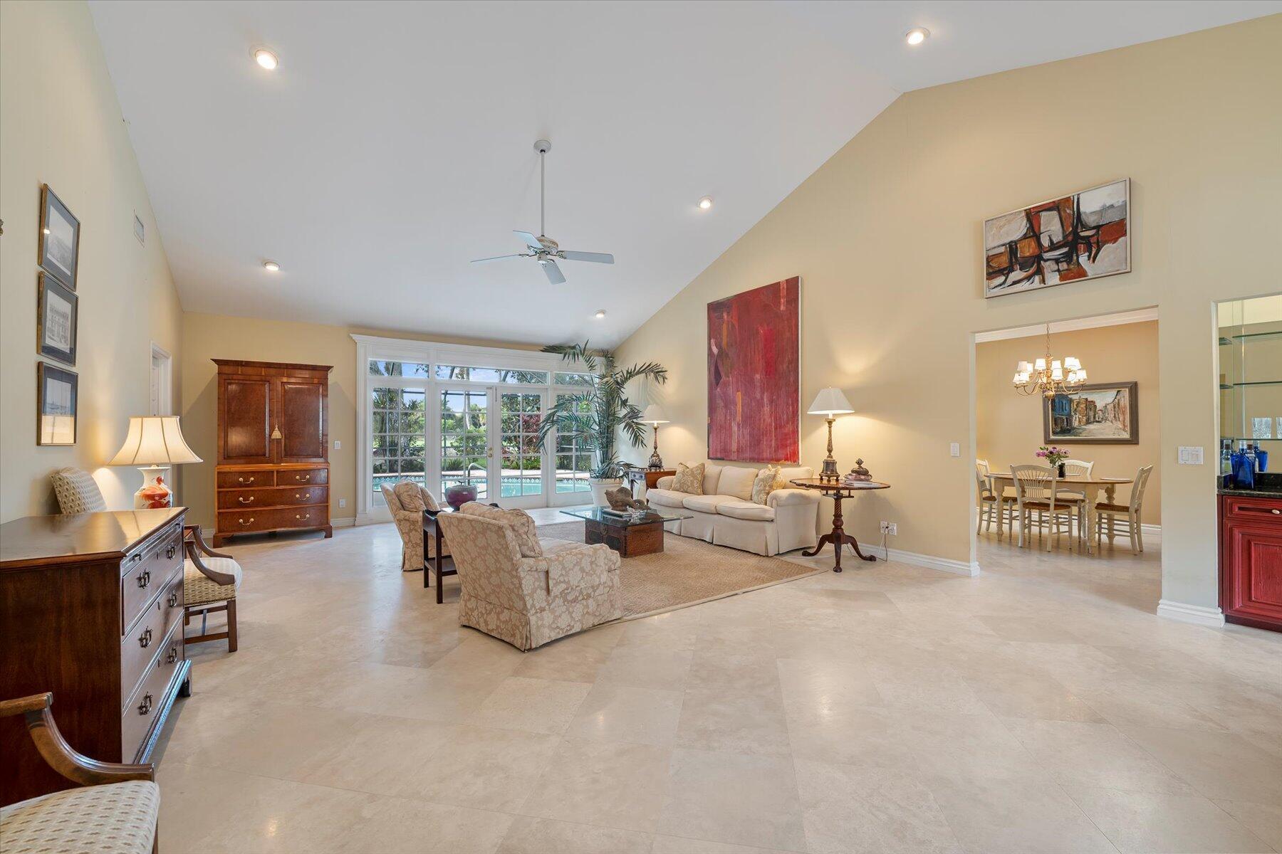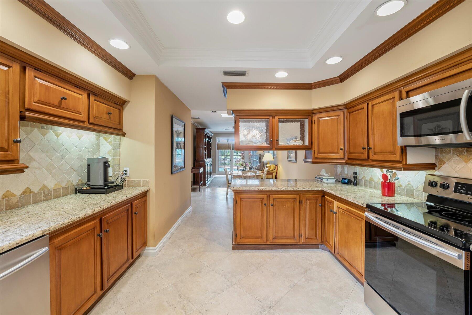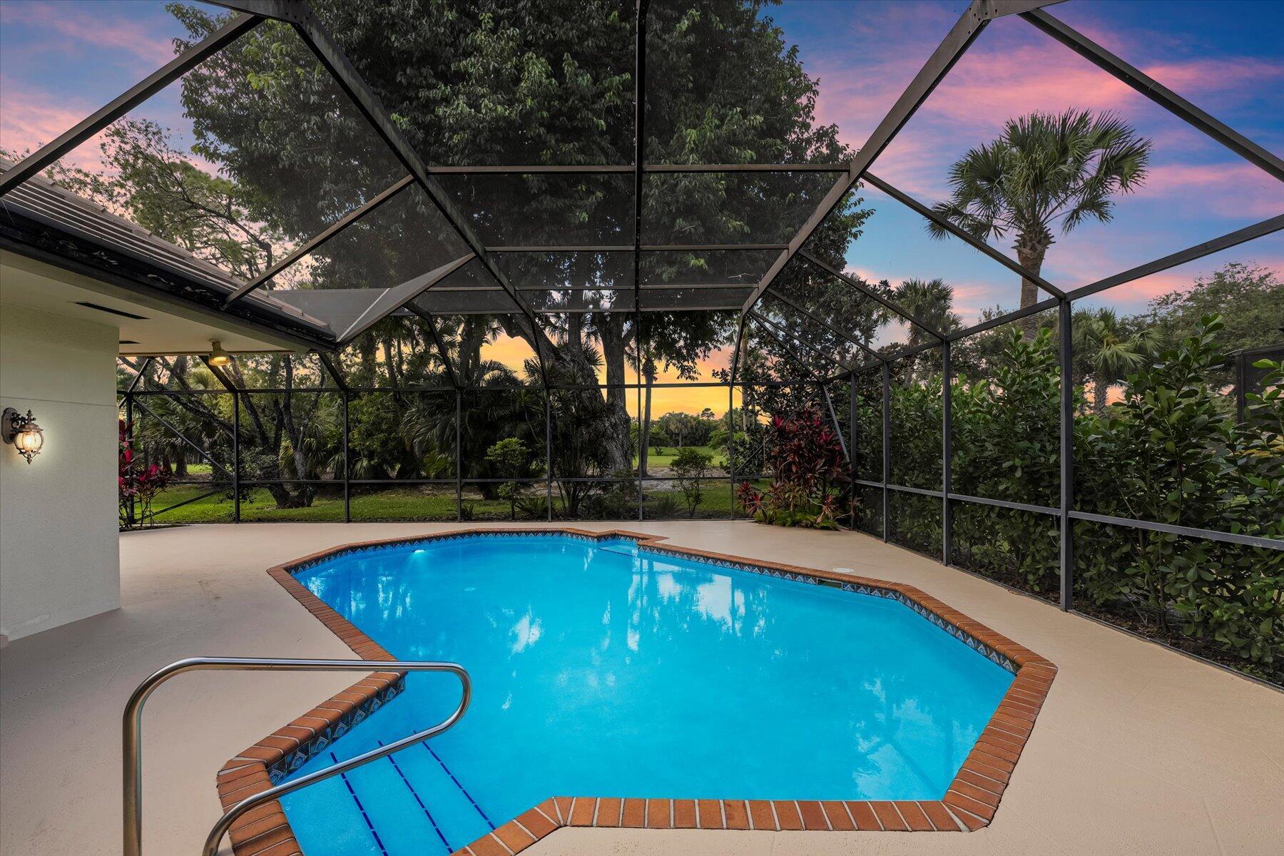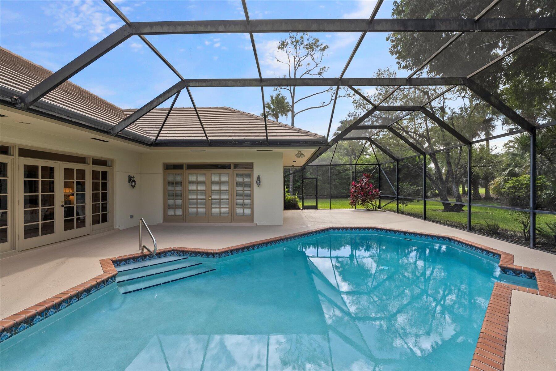 Located in one of West Palm Beach's premier guard gated communities of Breakers West, this spacious 3 Bedroom, 2 Bath, 2-car garage home boasts a screened pool and patio along the 13th fairway of Mayacoo Lakes Golf Course. This property also adjoins a 20ft grassed easement area on the side, affording additional privacy & space. With 2,614SF of living area, this one-story home features a Great Room with marble flooring, vaulted ceilings and French doors opening to the pool. Dining Room has tasteful recessed wet bar and wainscot molding. Large 18'x11' kitchen has granite counters, stainless steel Samsung and Bosch appliances and adjoins Breakfast area & Family Rm overlooking the pool. Spacious Primary Suite has crown molding, French doors opening to the pool, 2 custom fitted walk-in