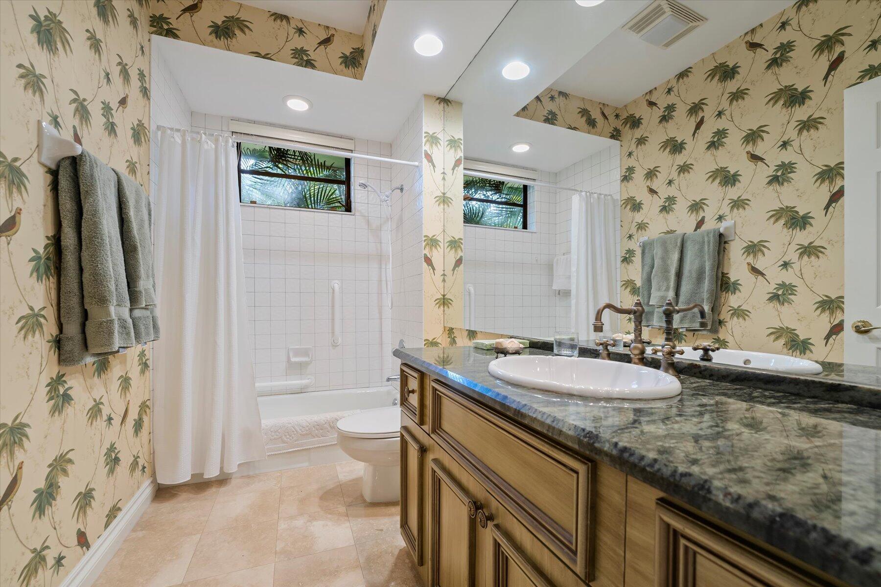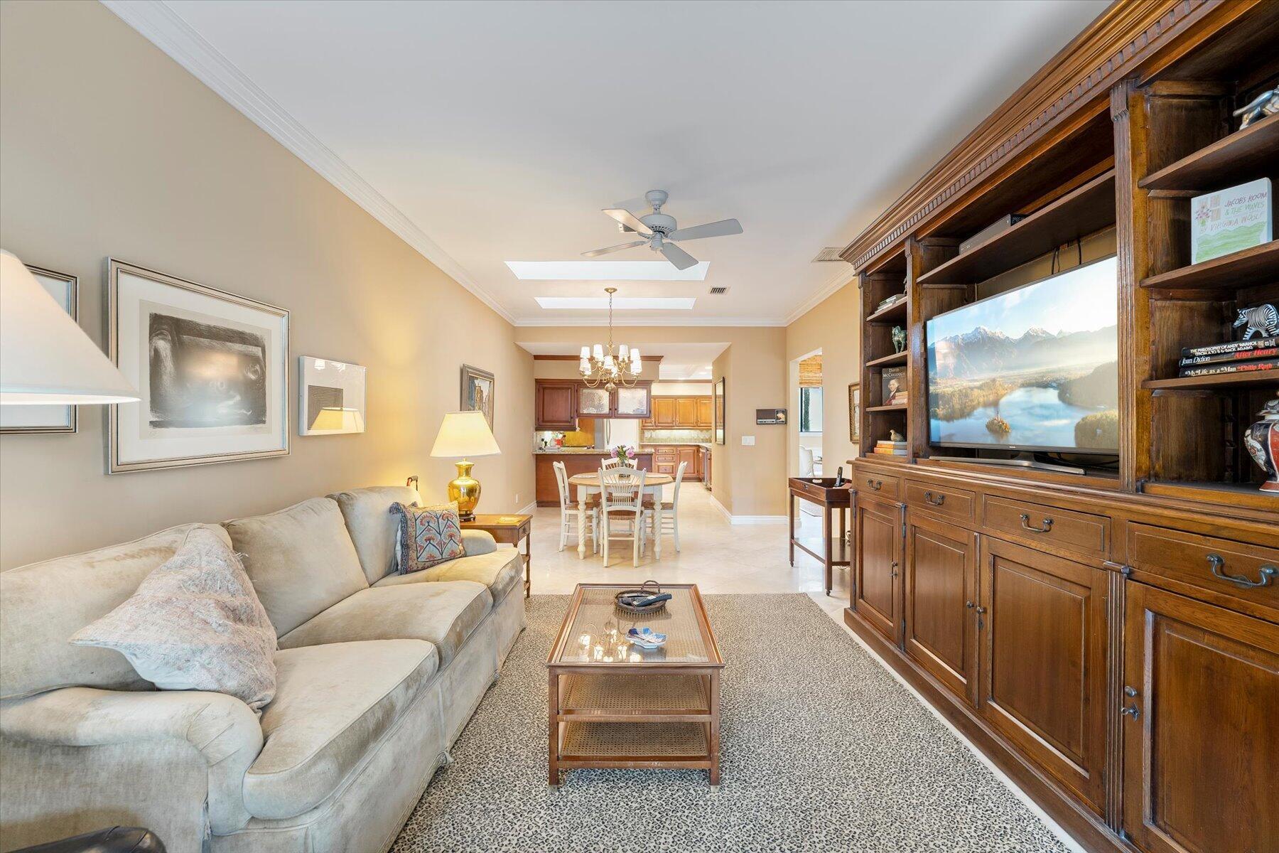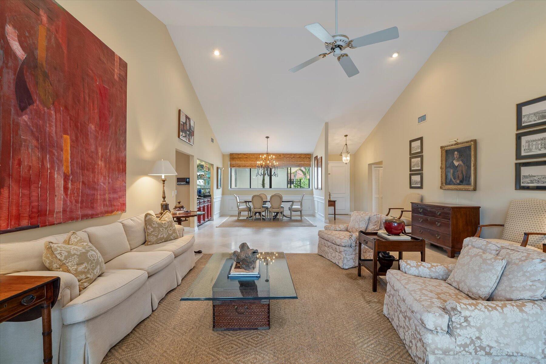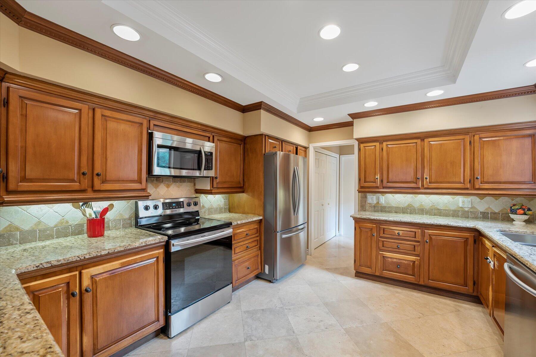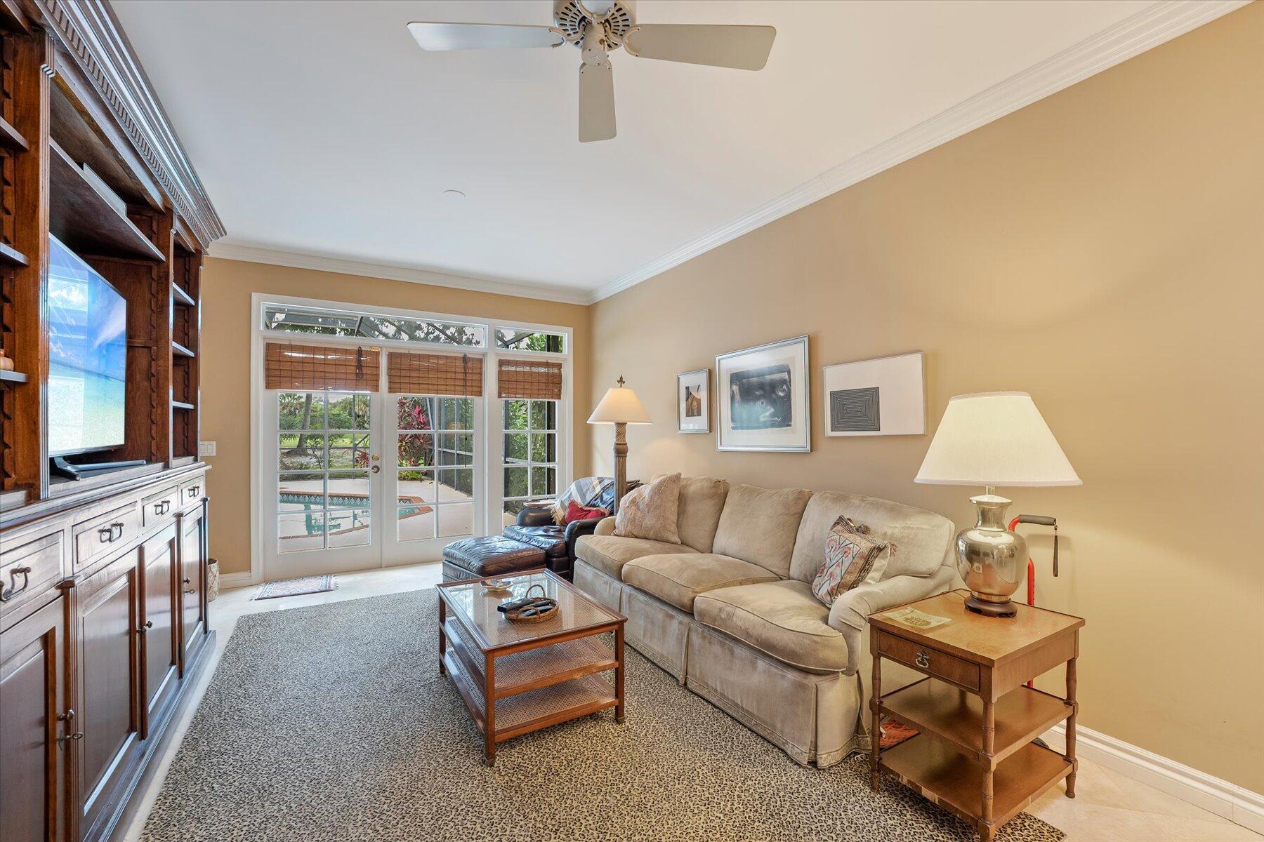 Located in one of West Palm Beach's premier guard gated communities of Breakers West, this spacious 3 Bedroom, 2 Bath, 2-car garage home boasts a screened pool and patio along the 13th fairway of Mayacoo Lakes Golf Course. This property also adjoins a 20ft grassed easement area on the side, affording additional privacy & space. With 2,614SF of living area, this one-story home features a Great Room with marble flooring, vaulted ceilings and French doors opening to the pool. Dining Room has tasteful recessed wet bar and wainscot molding. Large 18'x11' kitchen has granite counters, stainless steel Samsung and Bosch appliances and adjoins Breakfast area & Family Rm overlooking the pool. Spacious Primary Suite has crown molding, French doors opening to the pool, 2 custom fitted walk-in