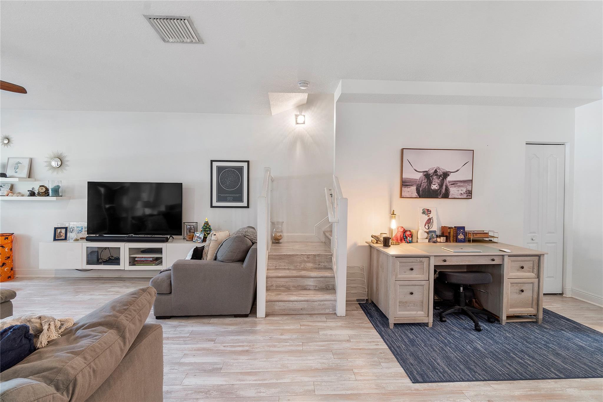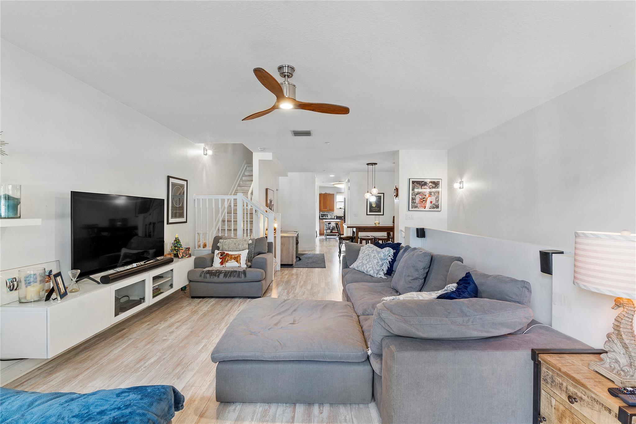 This spacious and bright 2BD + Den, 2.5 BA townhouse is located on a quiet tree-lined street in the cozy Sailboat Bend neighborhood, walking distance to Downtown FTL. Unit features upgraded beachwood flooring, high ceilings, impact windows, and newer AC. First level features upgraded kitchen with subway tile backsplash, wood cabinetry and SS appliances, large living room and formal dining area, half bath, walk-in laundry room, and large balcony. Second level has a den perfect for a home office, 2 large bedrooms with ensuite baths, and private balcony in primary. Pet-friendly community w/ Key West-style architecture & tons of nearby parks. Prime location near I-95/595, shopping, dining, beaches, & Las Olas. One assigned parking spot w/ plenty of street & guest parking, can rent first year.