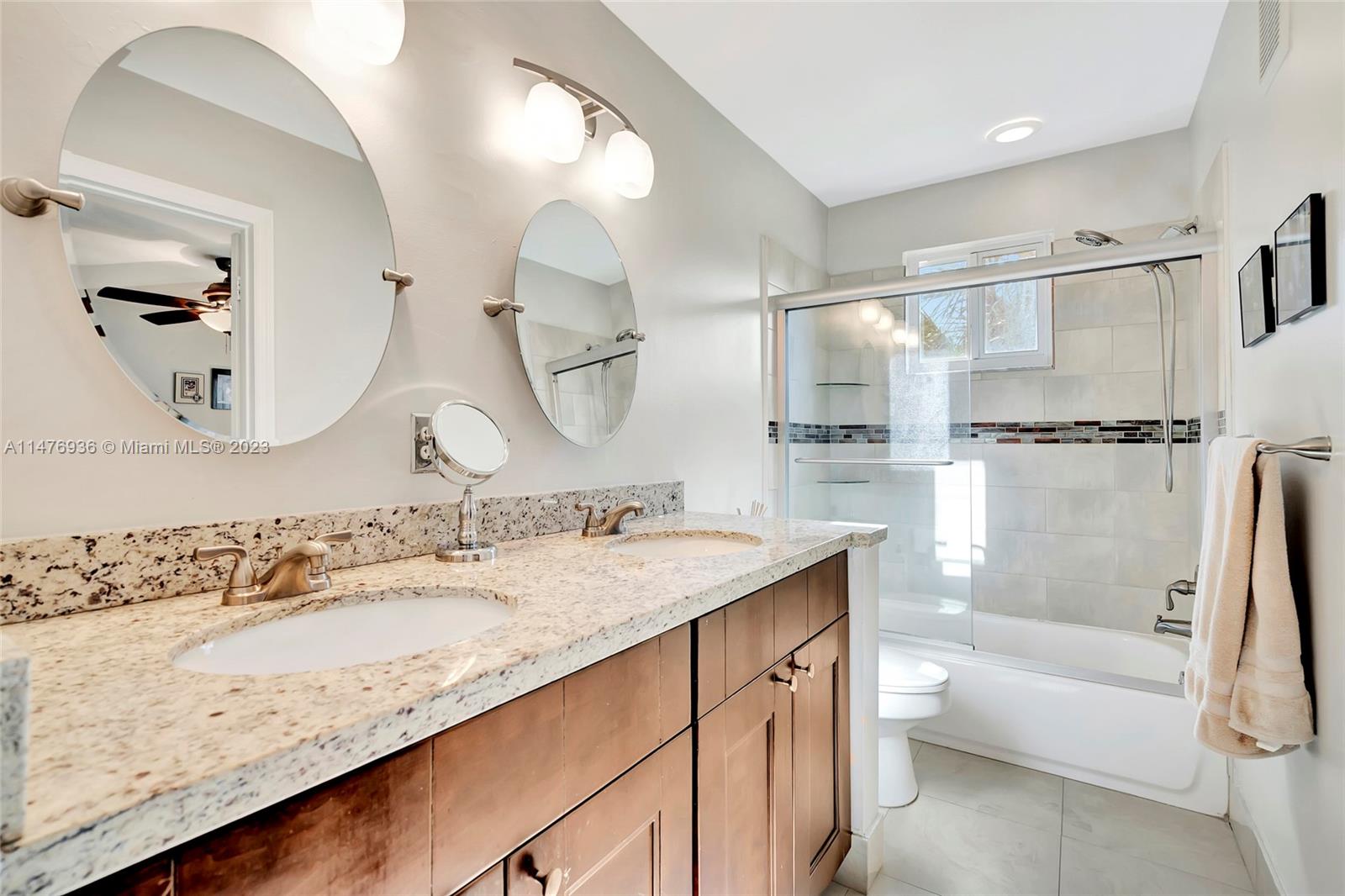 Pelican Pointe 3 Bed 2.5 Bath 2 Story Town Home in Pembroke Pines - INTERIOR FEATURES: 24x24 Porcelain Tile Floors Throughout Lower Level•6" Baseboards•Thru Front Door to WIDE OPEN Kitchen/Family Area•Stainless Steel Kitchen•Stailess Vent Hood•Quartz Tops•Updated Dark Wood "Shaker" Style Cabinets•Custom Tiled Back Splash•Soft Close Cabs•Updated Lighting&Plumbing Fixtures•Crown Moldings•Recessed Lighting•Updated Powder Room & Under Stair Storage•Wood Floors on Stairway & Entire Upper Level•Both Upstairs Bathrooms w/Cabinetry Matching Entire House/Dual Sinks/Upgraded Plumbing/Lighting/Shower Tiles & Granite Tops••EXTERIOR FEATURES: IMPACT WDWS/DOORS THROUGHOUT•Screened Back Porch overlooking Green Space•Extended Driveway•Electric Car Charger•Rain Gutters•Cmmty Pool & Tennis•