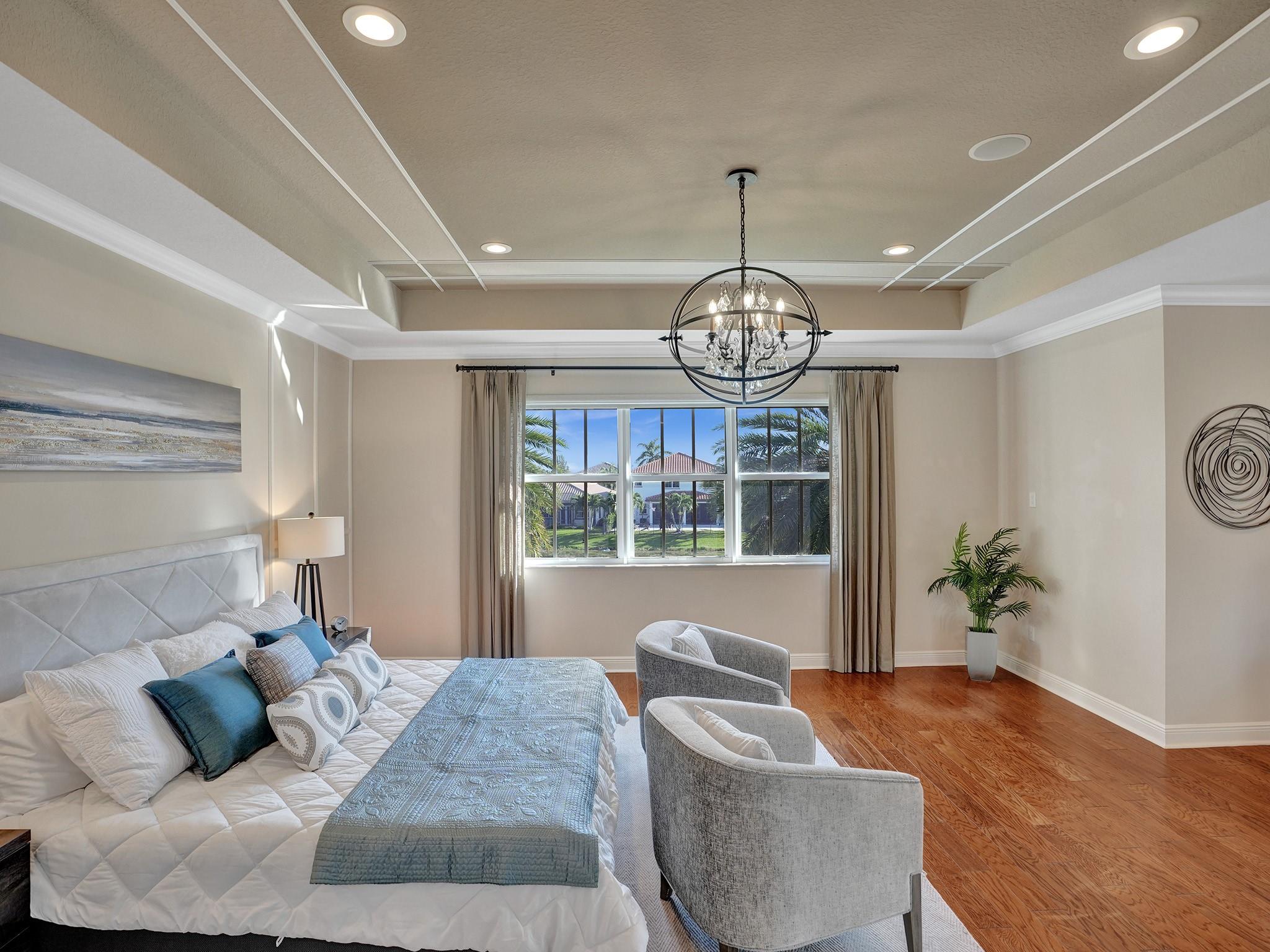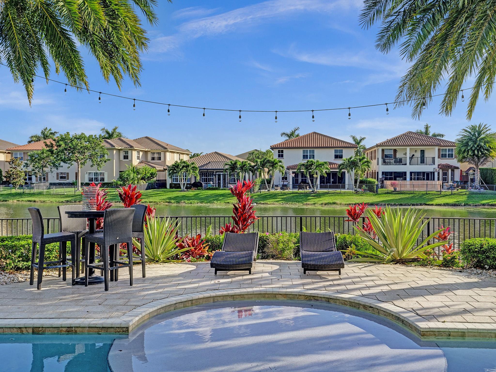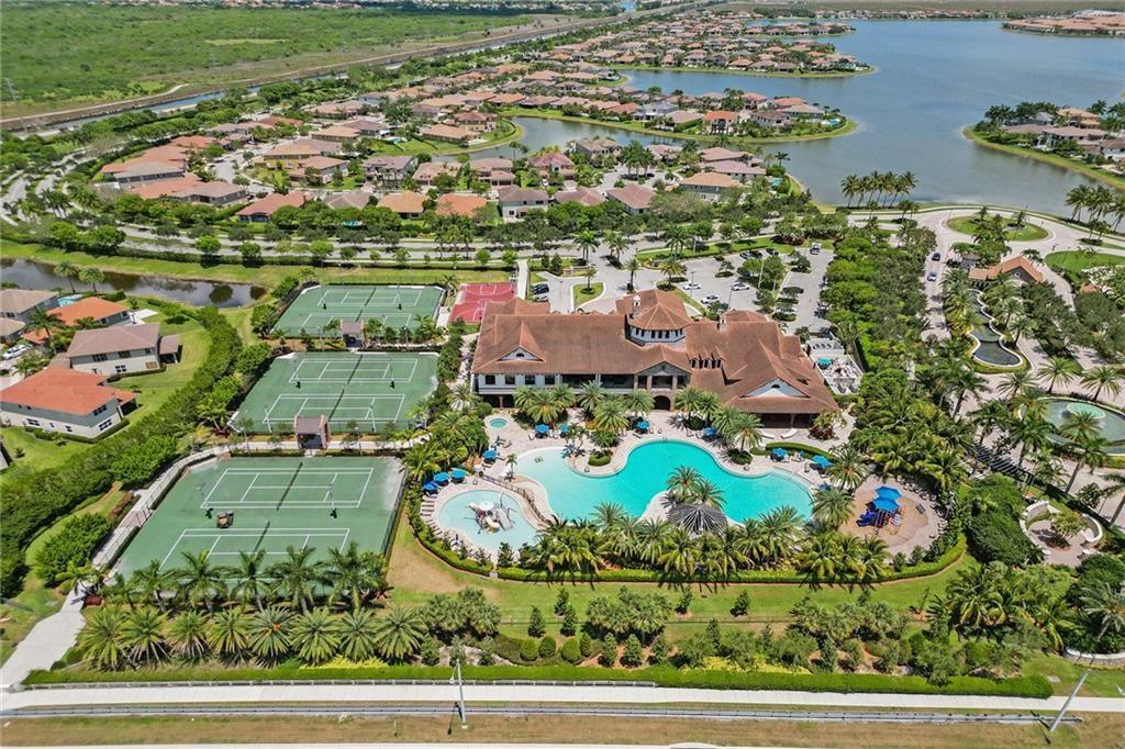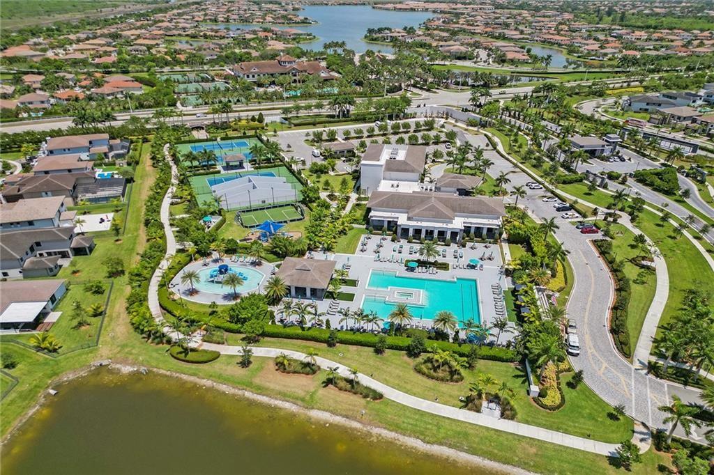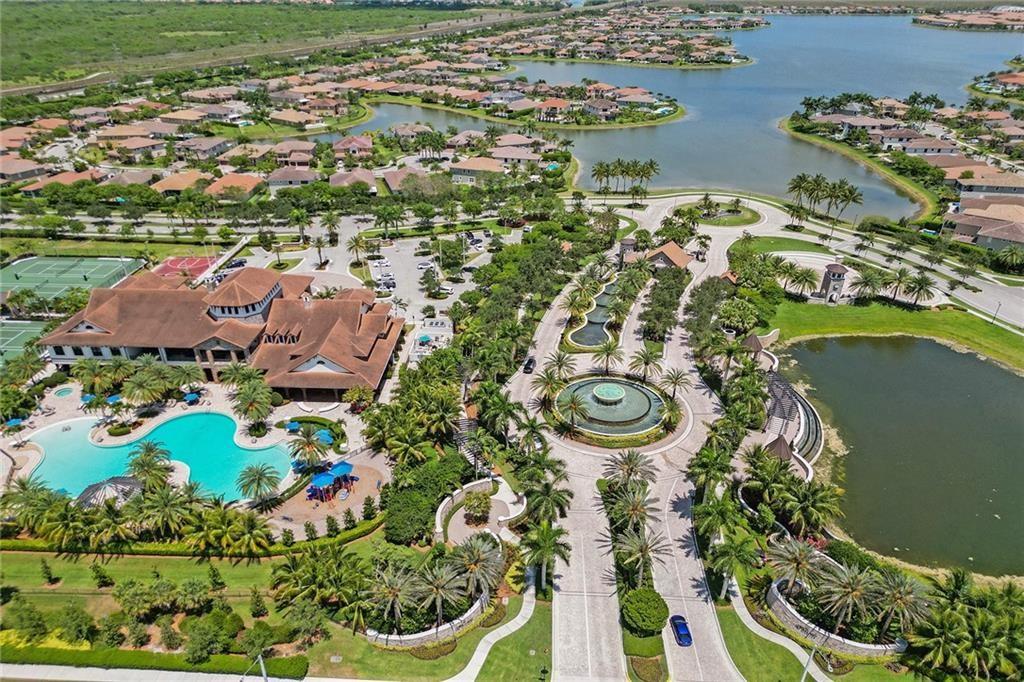 Gorgeous former stunning model! This Waterton over 4,064 square feet is largest home in the Executive collection on a point water lot on model row in beautiful MiraLago. This home is superbly upgraded with all the bells and whistles, has 5 Bedrooms (one down) and 4 full baths. Large living room, formal dining, built in bar and family room make this the perfect home for entertaining. Large primary suite with sitting area. Very generous sized upstairs game room. Enjoy sunrise and sunset in your backyard sanctuary on over 110 feet of lake frontage. Spectacular pool with separate spa and several seating areas, outdoor kitchen and green spaces. Amazing gated community; resort-style amenities, including gyms, tennis, spin room, basketball, billiards room, tot lots, kids Water Parks and ballroom.