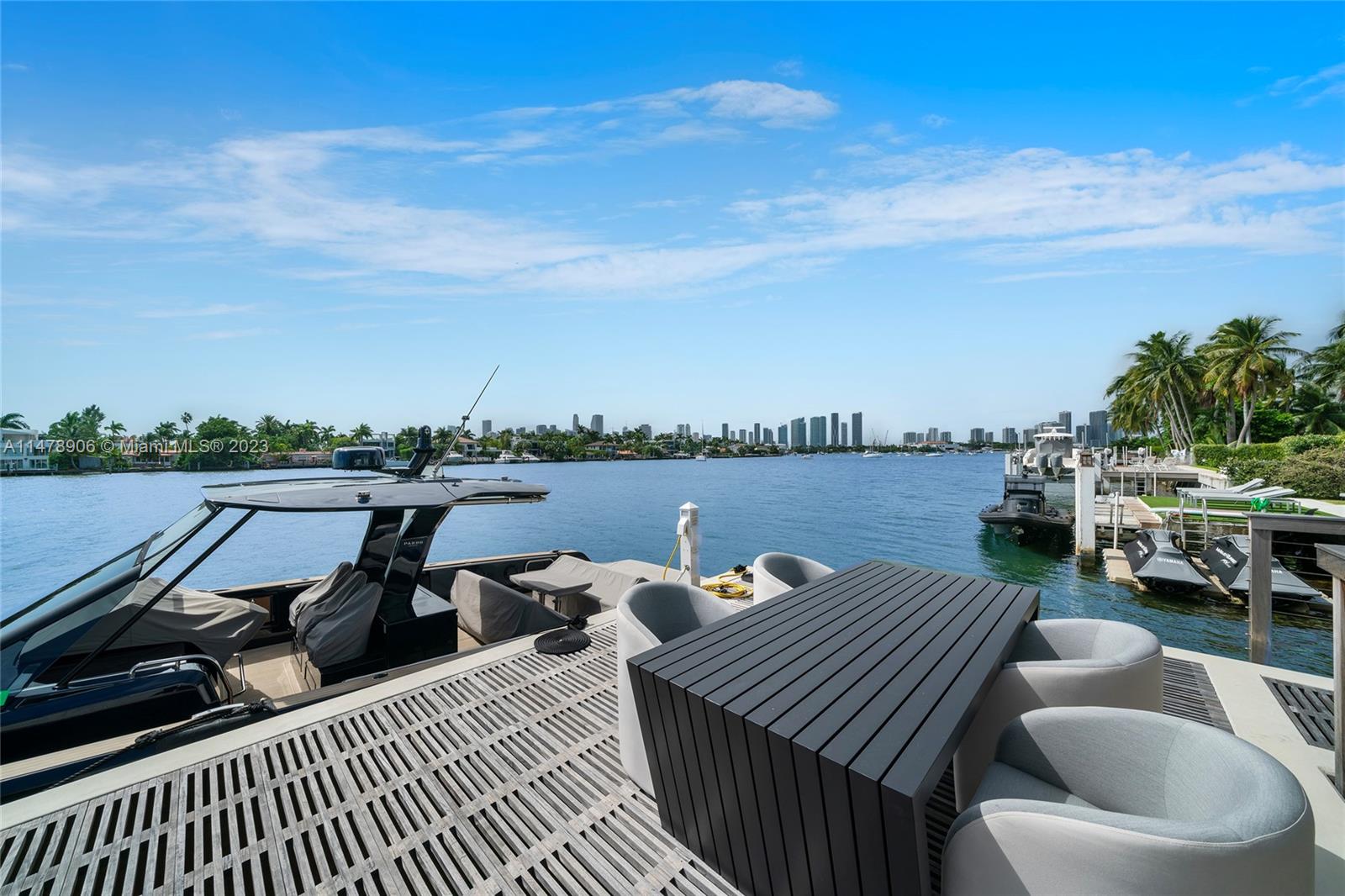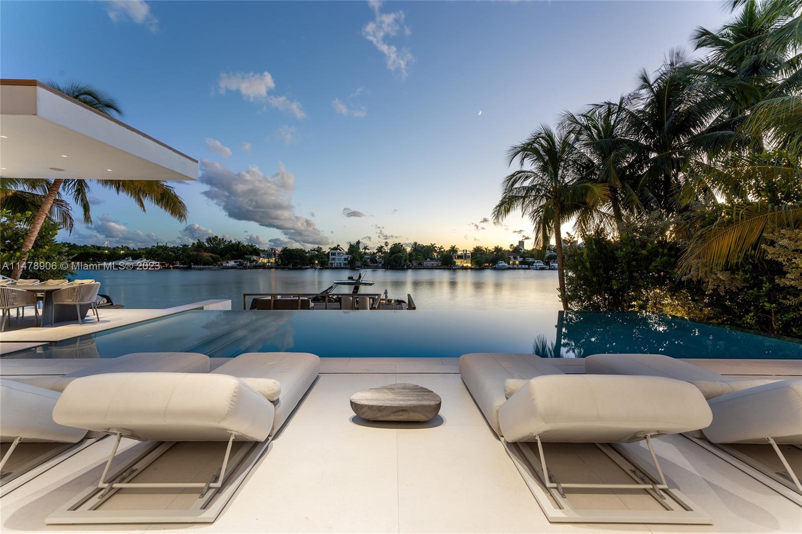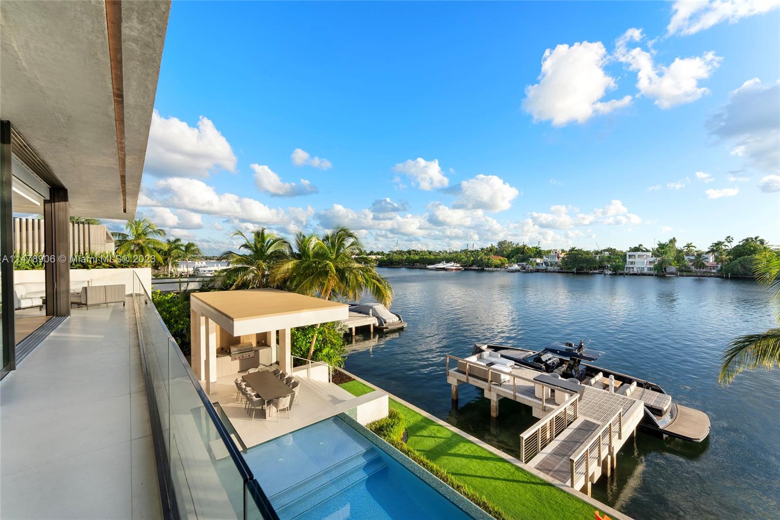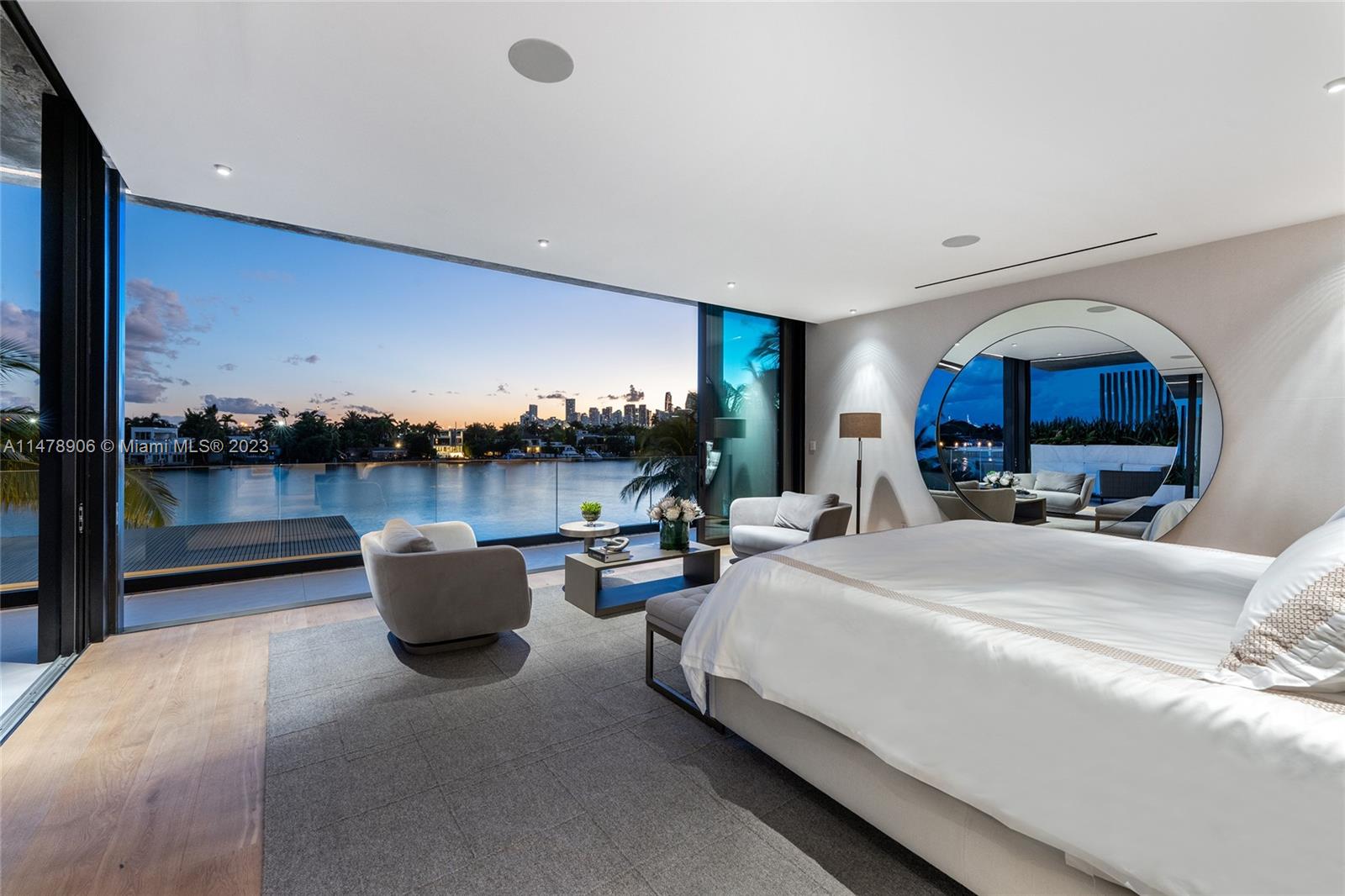 This 2-story, Ralph Choeff designed waterfront estate on guard-gated Hibiscus Island truly epitomizes luxury living in Miami Beach. Property boasts 7BR/7+1BA, sitting on a meticulously landscaped 15,750 SF lot, w/panoramic vistas of the iconic Miami skyline. Inside, the residence showcases impeccable interior design, soaring ceilings, & floor-to-ceiling telescoping glass doors that flood serene natural light while bringing the outdoors in. The expansive Great Room seamlessly integrates a family/media room, dining area, & chef's kitchen, all w/captivating water views. The 2nd story principal suite offers a terrace overlooking the waterway with city views and a beautiful plunge pool/spa. Outdoor spaces are a tropical oasis w/infinity pool, private dock for large vessels & easy ocean access.