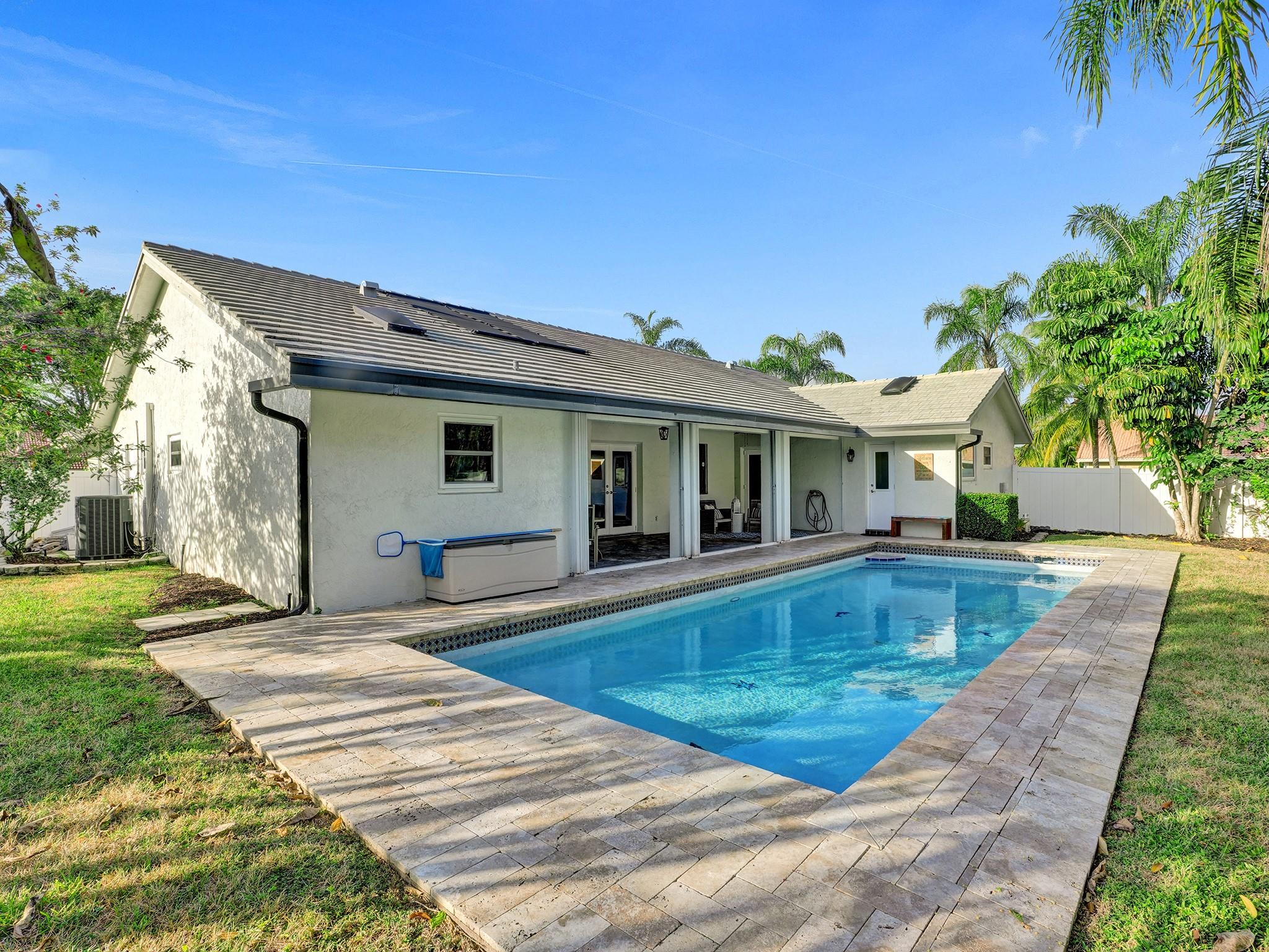 You will love the light, airy, immaculately maintained 3 bed, 3 bath pool home with vaulted ceilings, on a large corner lot in beautifully maintained Weston. Improvements in 2023 include new paint, new bathroom renovation, new flooring, popcorn ceiling removal, new window treatments, interior and exterior lighting improvements, & newer Trane AC (2020). A high fence around the beautifully landscaped pool area provides privacy, and impact windows and doors provide peace of mind. For only $340 a year, Bonaventure Towne Center Club amenities include 2 pools, a wonderful gym, bowling, billiards, tennis, pickleball, basketball, skating rink, fitness/lifestyle classes, & recreational programs for kids and adults. Value, privacy, security, and amenities galore…this home has it all. Come and see!