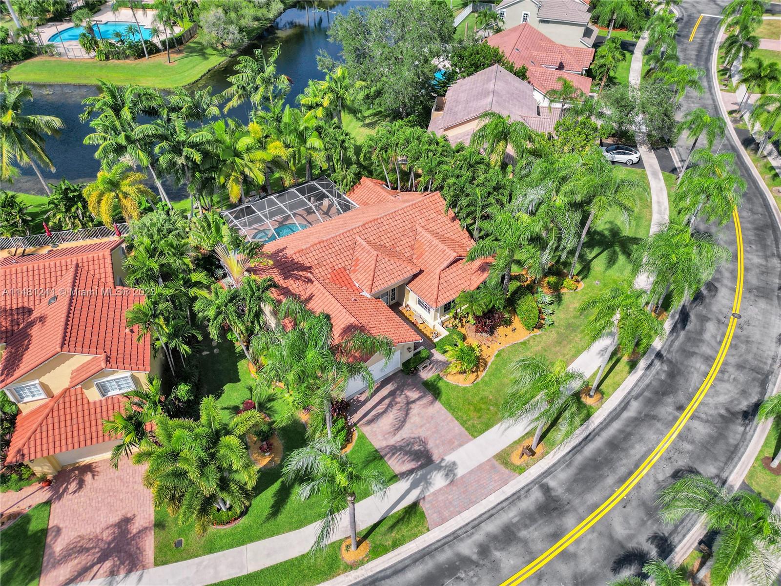 Nestled in a tranquil cul-de-sac, this vibrant waterfront gem is one of just 106 homes in an intimate enclave. Impeccable, cozy New Orleans-inspired haven offering peaceful views & lush tropical surroundings. Updated interior, including tile/ porcelain floors & designer bathrooms. Roomy kitchen with plenty of storage & work space, wood cabinetry, stone counters, wine-cooler & stainless appliances. Outdoor living at its best, sparkling heated pool and spa, surrounded by over $60,000 in professional landscaping & outdoor lighting. Charming brick pavers and brass lanterns compliment the exterior. Updated pool equipment, A/C, water heater, storm-rated garage door & lake-fed irrigation. Community pool and clubhouse. Convenient to schools, parks & houses of worship. The roof was replaced 2006.