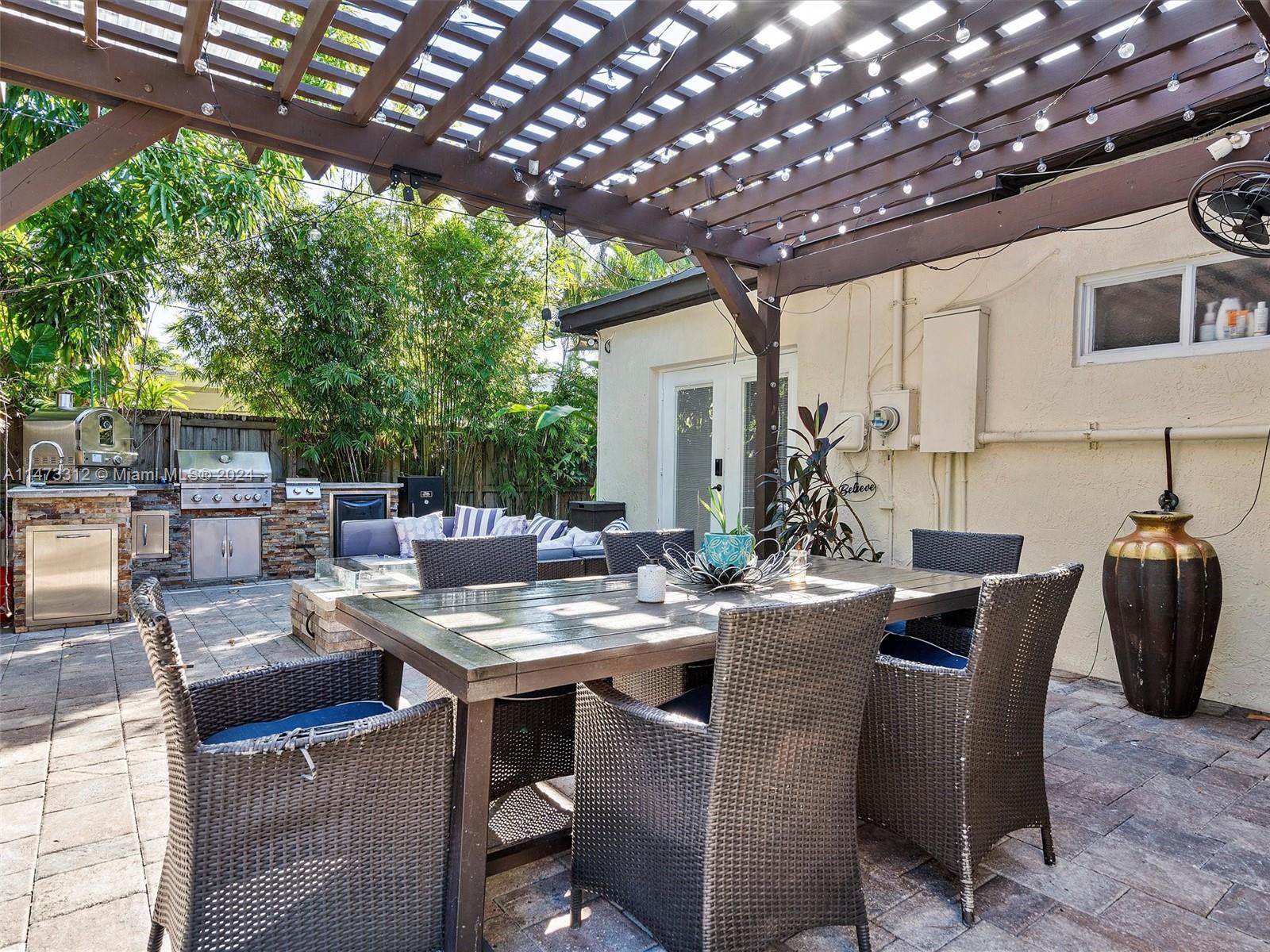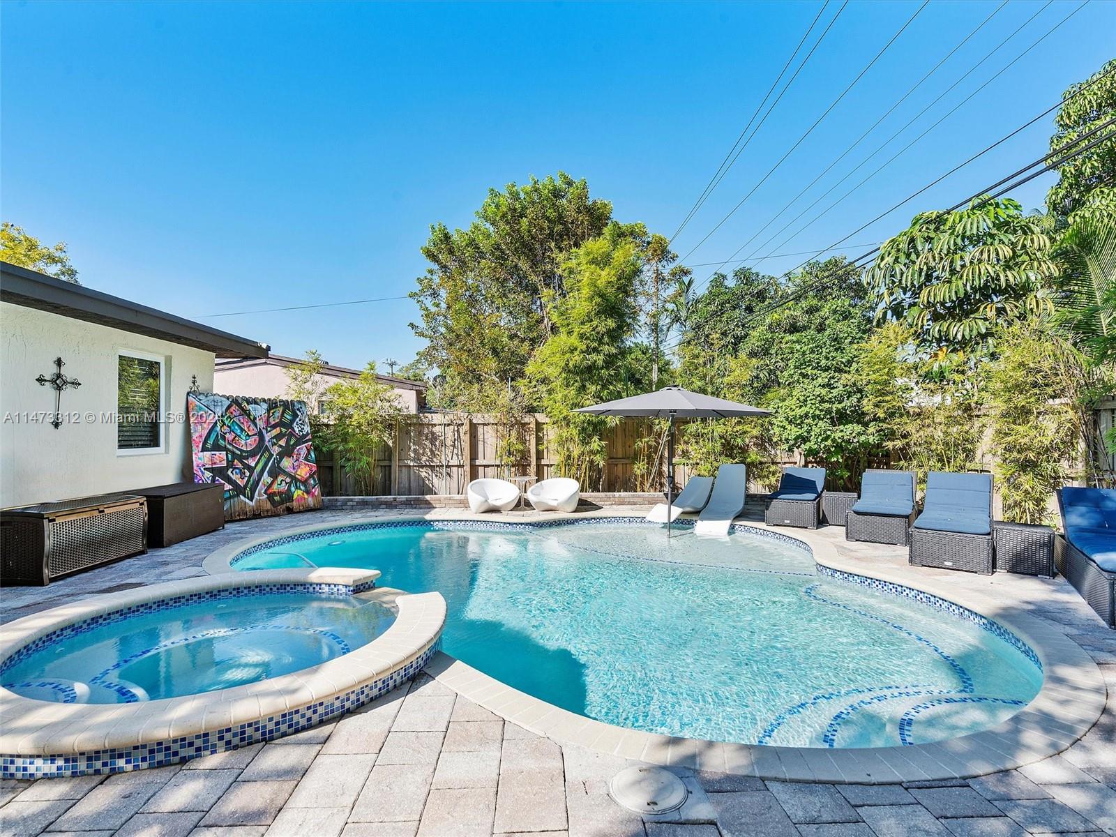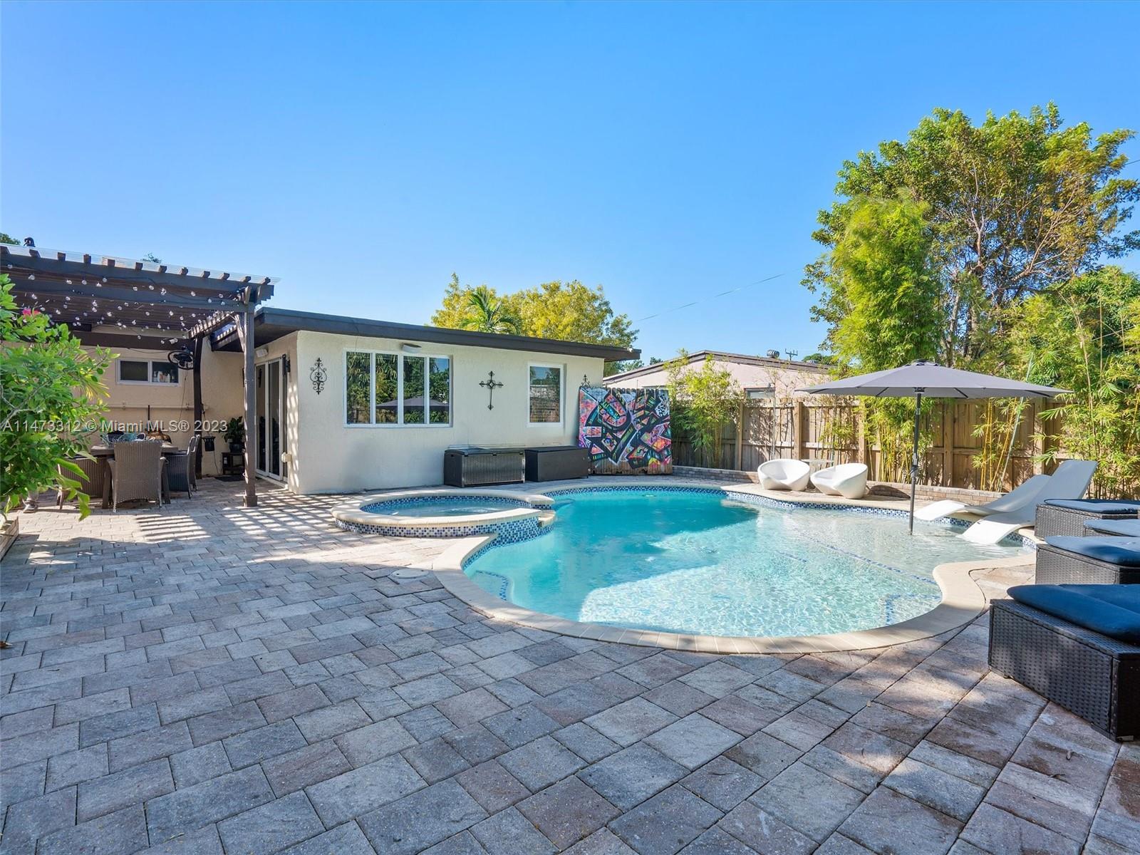 Welcome to this exquisite private residence for outdoor enthusiasts. Arrive at a fully secured front yard adorned with artistic pavers and a tranquil water fountain. Step inside to discover a welcoming, sunlit space that beckons you to make it your own. With 3 spacious bedrooms and 2 1/2 well-appointed bathrooms, this home offers both privacy for remote work and ample room for entertaining. The backyard is the crown jewel of this property, featuring a generous freeform pool and spa at its heart, complemented by a charming trellis-style lounge area and a dining space adjacent to the built-in outdoor kitchen, perfect for grilling enthusiasts. Located in the sought-after North Miami area, a mere 15min drive from the beach, making it an ideal destination for both relaxation and convenience.