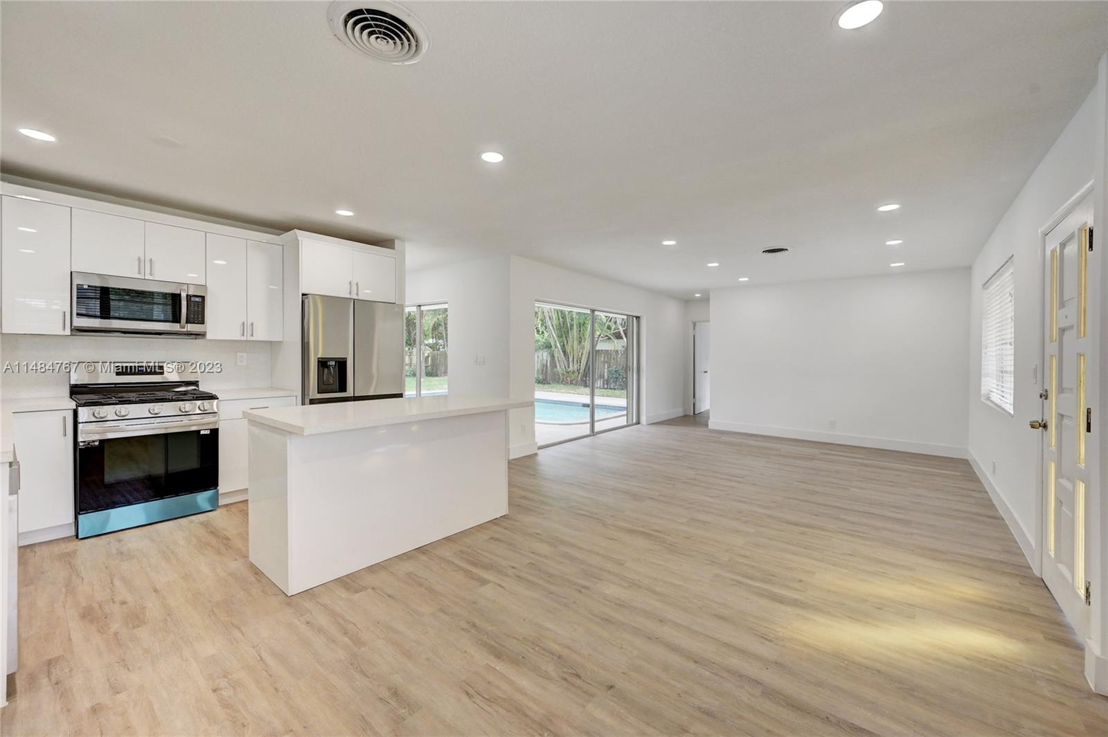 Experience the essence of Florida lifestyle in this newly renovated pool home located in the vibrant Bel-Ter neighborhood of Riverland, Fort Lauderdale. This home features an open floor plan with 3 ample bedrooms, 2 modern bathrooms with smart mirrors, white wood vanities & updated lighting. The heart of this home is the open-concept island kitchen equipped with brand new stainless steel appliances & quartz countertops. Stylish vinyl wood flooring connect every room, each offering a view of the pristine pool & patio, surrounded by lush landscaping. An expansive wood deck sets the stage for private BBQs & entertainment. Ideally situated near major highways, top-notch dining, shopping & entertainment. Just 10-15 minutes away from the beach, airport & Port Everglades.