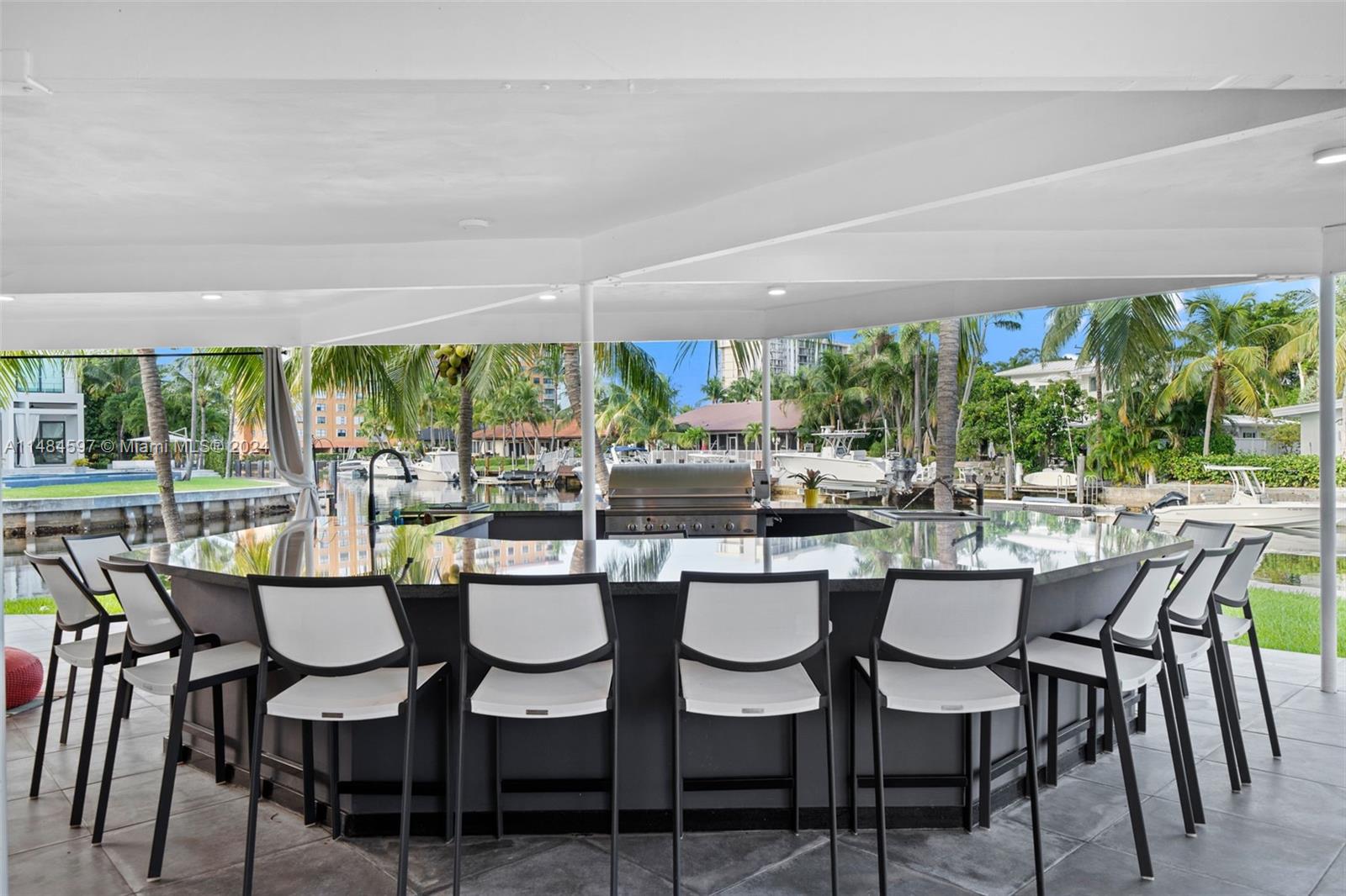 Welcome to the most beautiful backyard in Keystone sitting on an oversized corner lot with rare 189 feet of water, a 60-foot dock and no fixed bridges. Enjoy a cozy sitting area, expansive outdoor kitchen and bar, heated saltwater pool, and multiple fruit trees. Sound system throughout. This home is perfect for entertaining even on rainy days. It was remodeled with Porcelanosa, has a brand-new roof and impact windows and doors. Expansive master suite offers an oversized California walk-in closet, and a bath with a steam shower and vibracoustic spa for two. Open kitchen is equipped with Thermador appliances, including a 48-inch gas stove with grill, steam and convection oven. New generator to power entire house. Tankless water heater and gas dryer. 2015 Searay Venture 370 is also for sale!