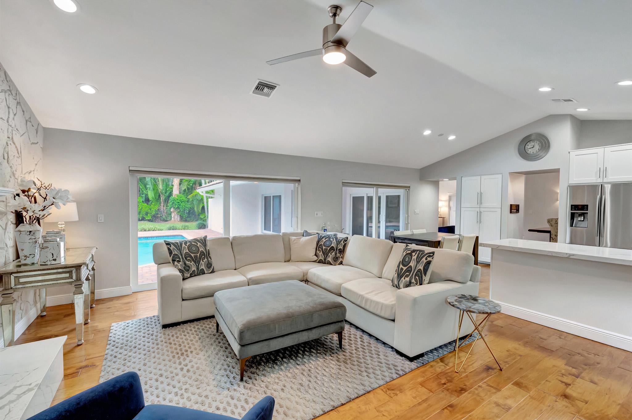 Located in The Colonnade in the heart of Boca Raton, this renovated 4 bedroom, 2.5 bath home, situated on over 1/3 acre lot, is an opportunity you won't want to miss! You'll love the open flow found inside the formal living and dining rooms with over 13 ft ceilings, smooth walls, crown molding, and hardwood floors all protected by impact windows and doors. Designed with entertaining in mind, the gourmet-style kitchen is open to the family room and features quartz counters, stainless appliances & plenty of storage. Enjoy pool views from the primary suite with large walk in closet and relax in the spa like master bath with freestanding tub, marble floors and frameless shower. The brick paved sundeck outback offers