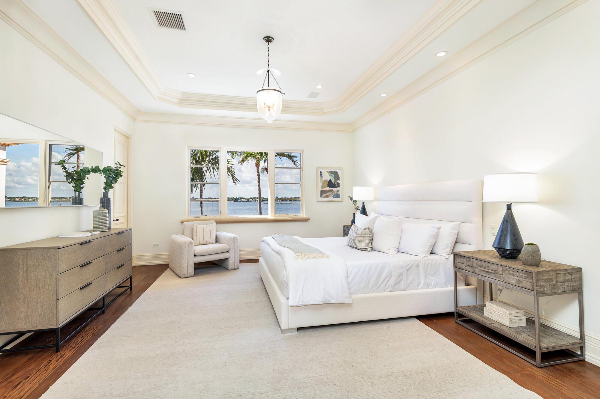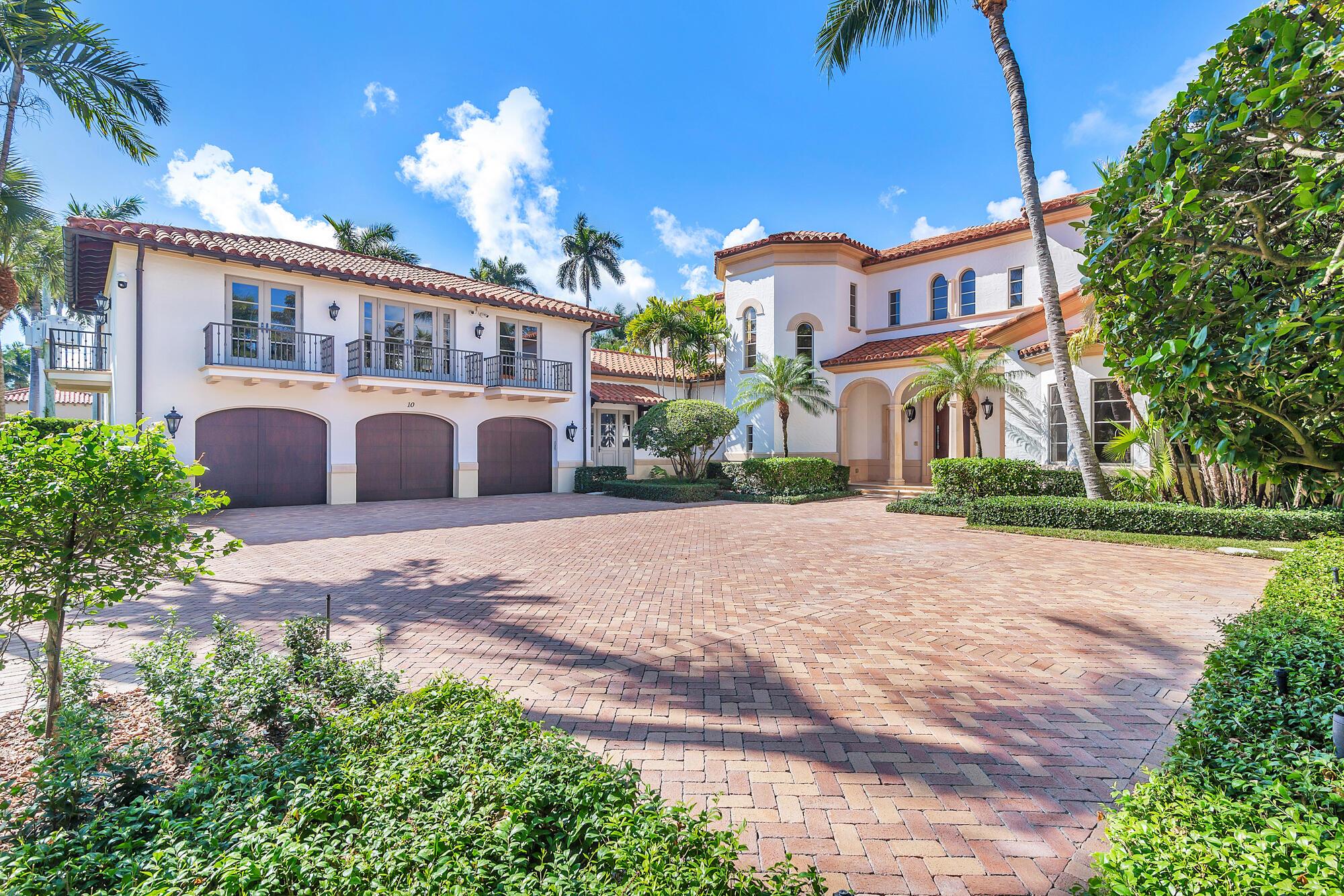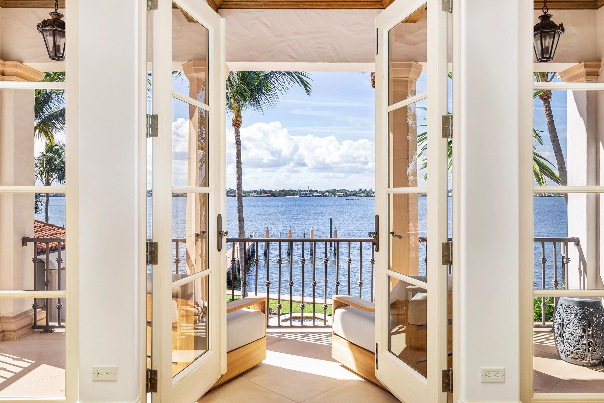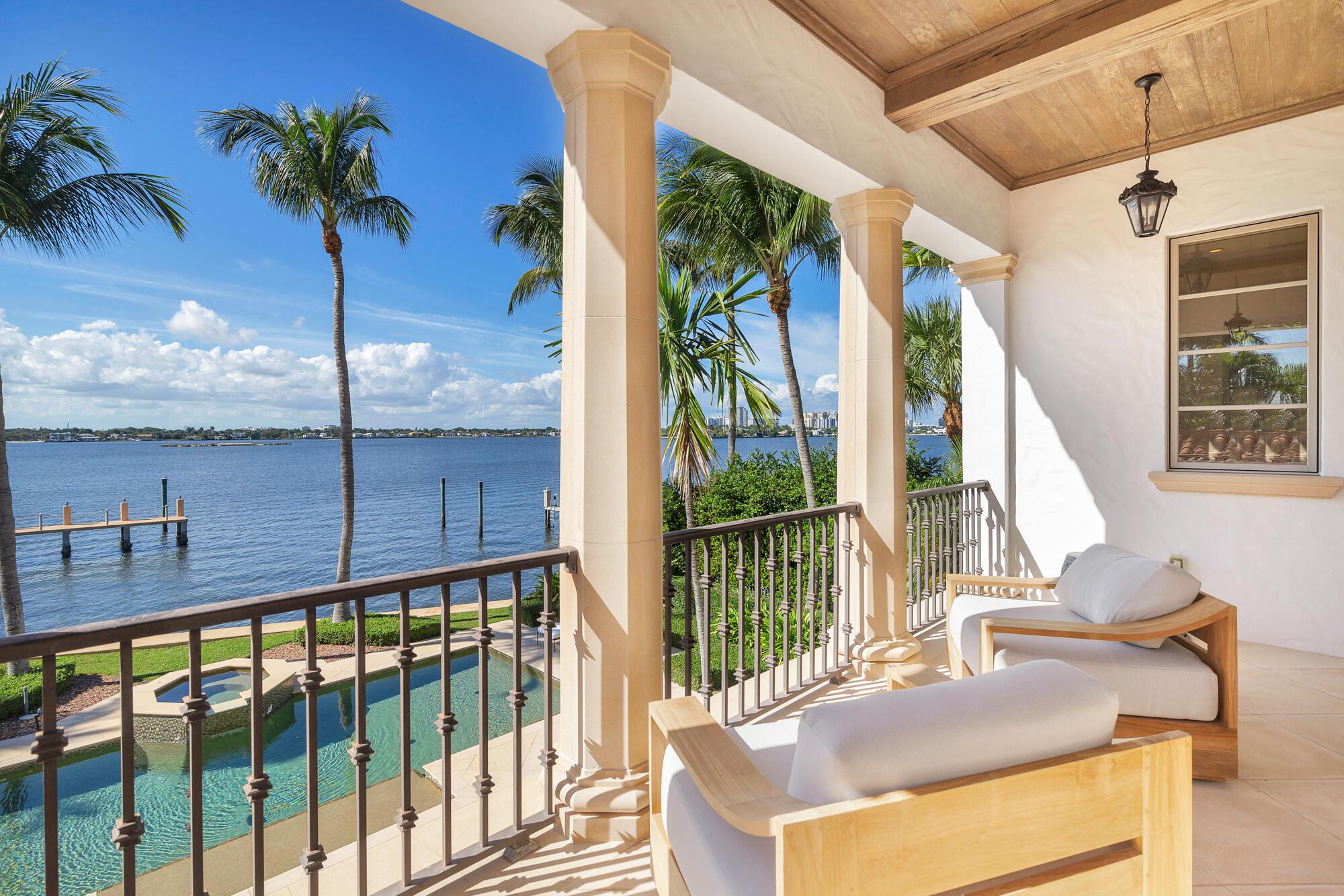 Water, Water Everywhere from the moment you walk in to this magnificent direct lakefront Mediterranean estate on over 2/3 of an acre located in the exclusive Estate Section of Palm Beach. Gated and lushly landscaped, the property is surrounded by mature foliage providing maximum privacy before opening up to 117' of commanding Intracoastal views. The gracious floor plan offers 5 bedrooms/7.5 baths and volume ceilings throughout. Highlights include luxurious second floor primary suite with private balcony and sitting room, chef's kitchen with butler's pantry, wood paneled library, oversized family room, wine cellar, media room, elevator, 100' x 40' concrete dock, full house generator and 3 car garage. Fabulous outdoor spaces with grand covered loggia ideal for dining and entertaining.
