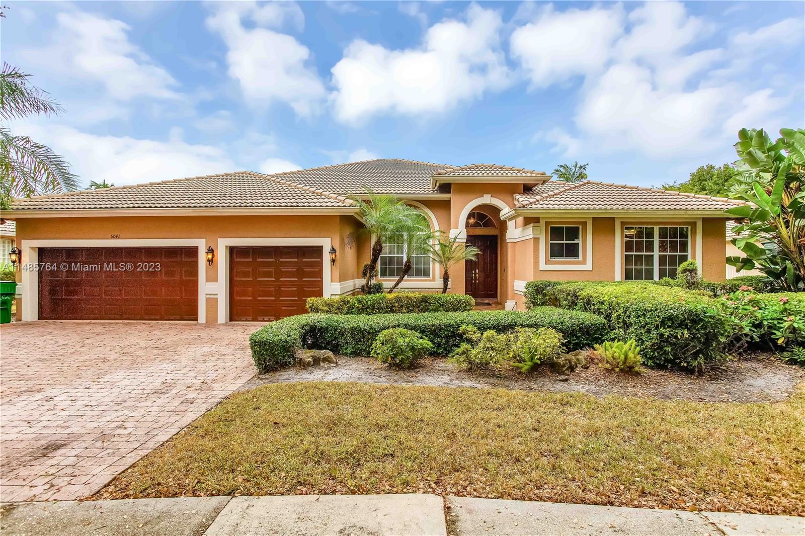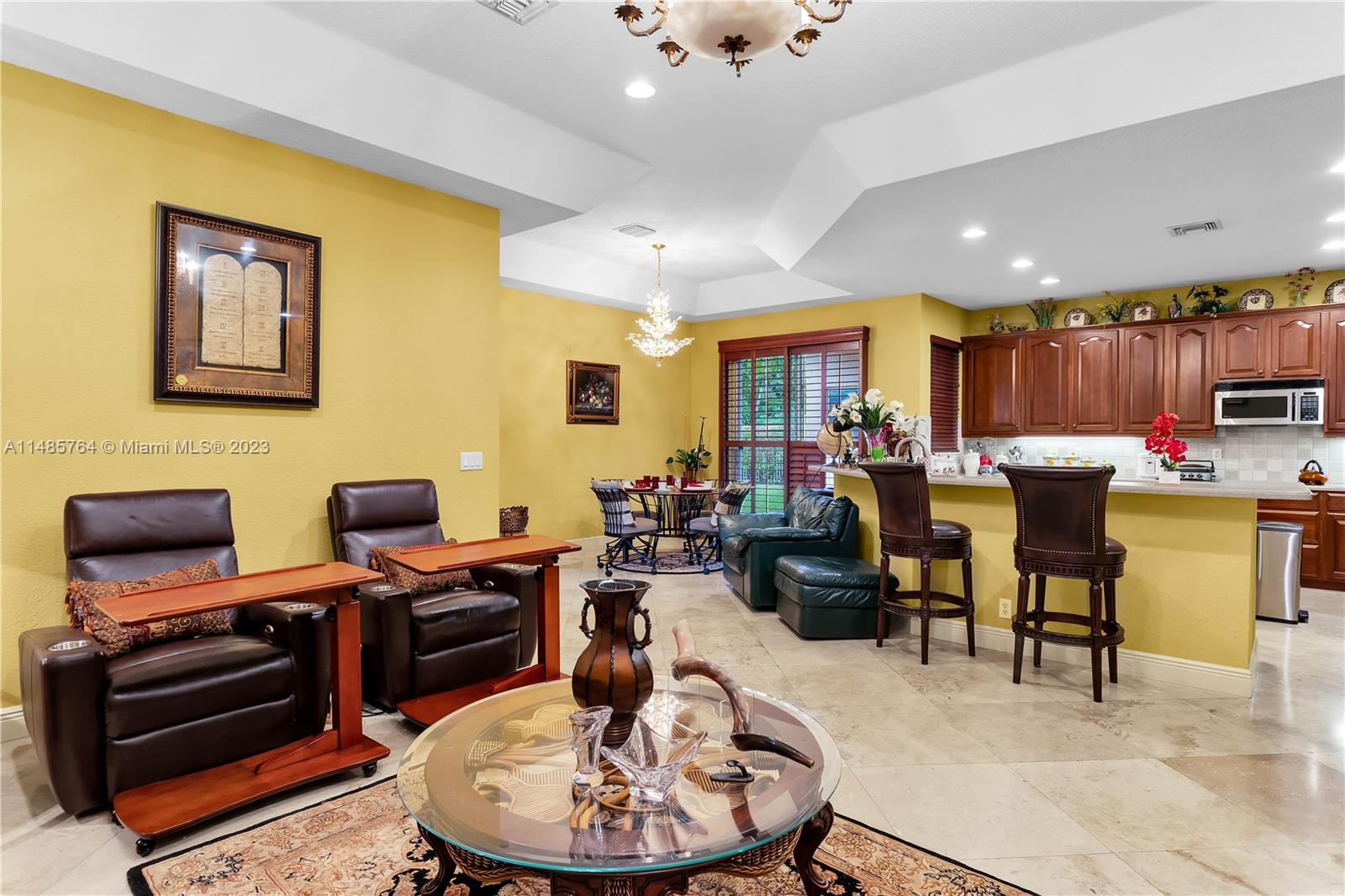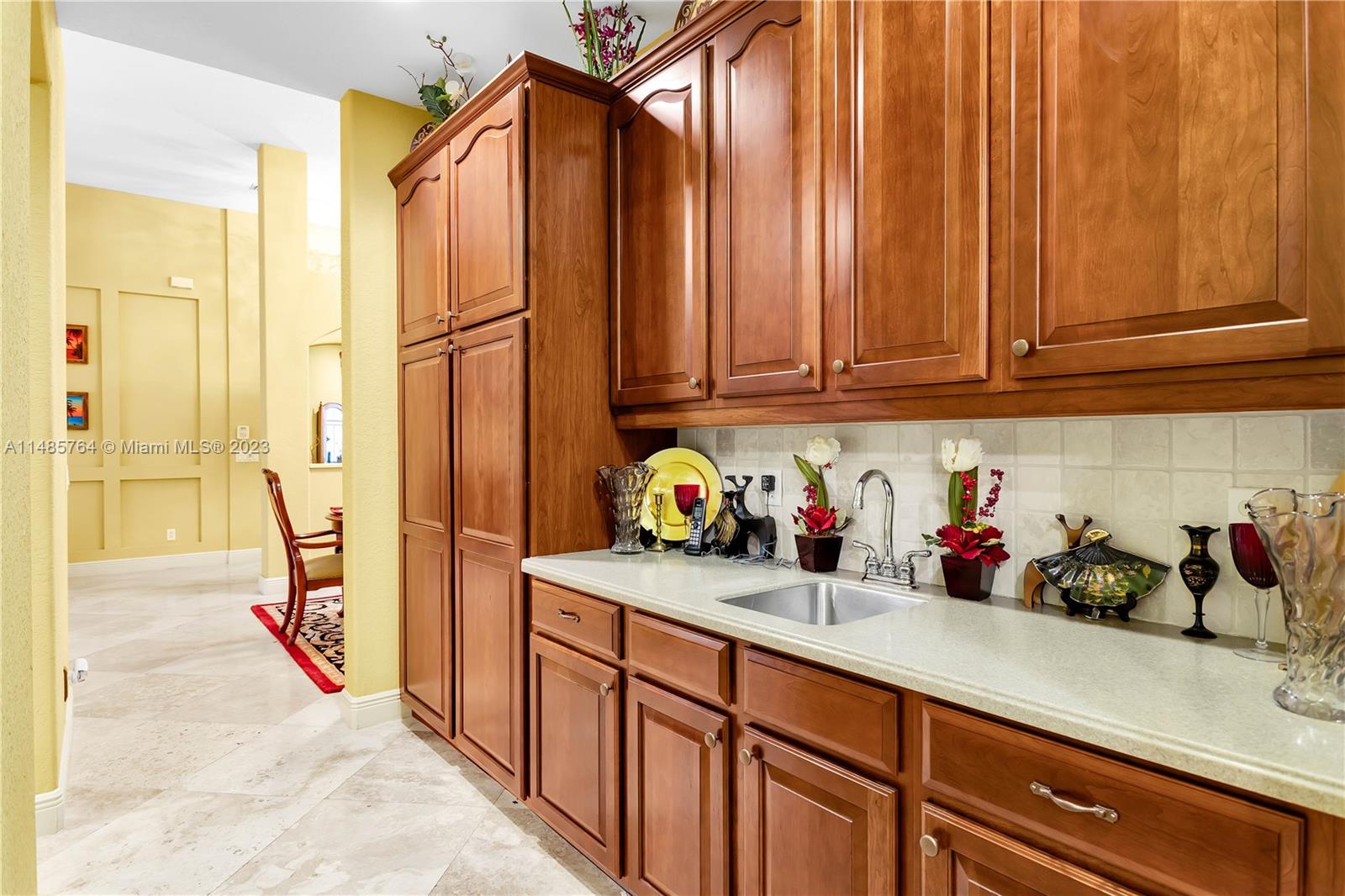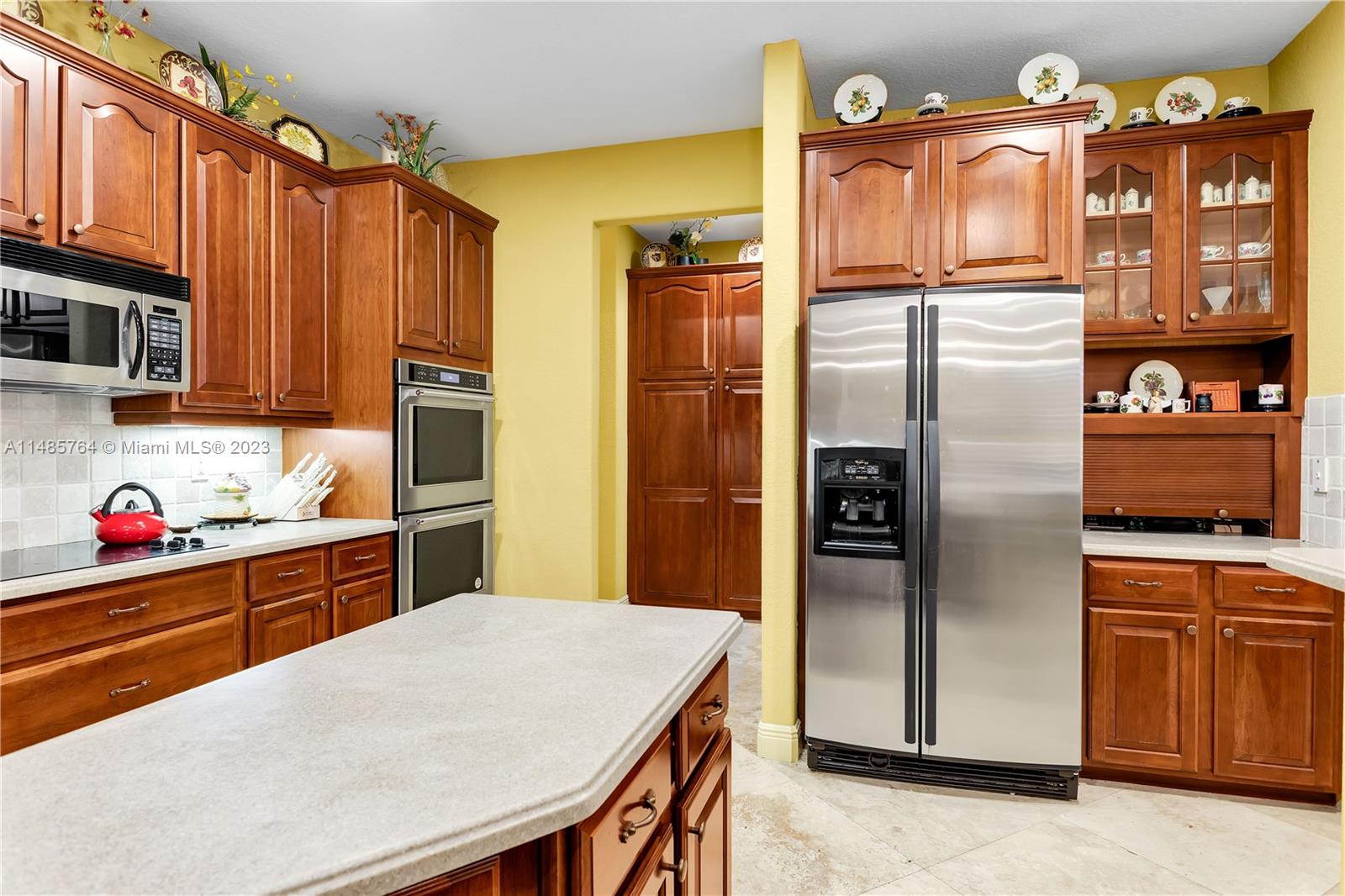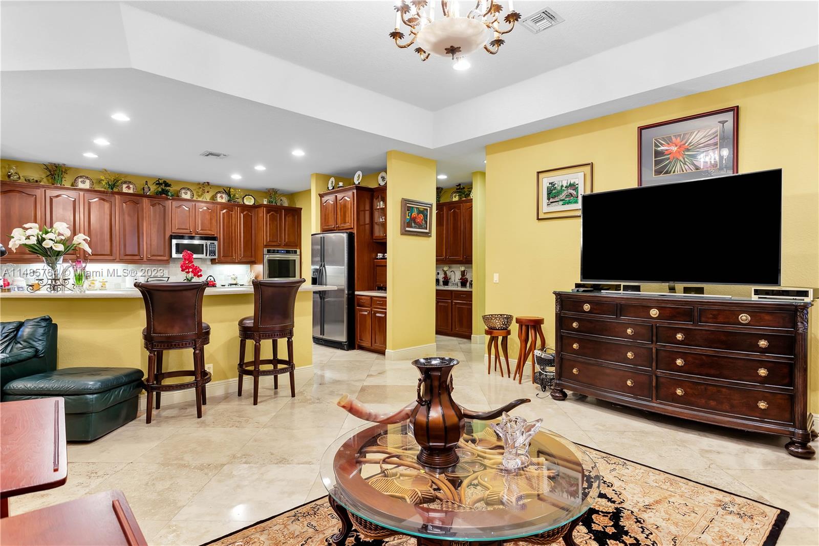 This stunning property features high ceilings, split floorplan, 4 bedrooms + an office, plantation shutters & 2 a/c units. Large windows invite an influx of natural light that amplifies the sense of space, casting a natural glow upon the high ceilings & beautiful travertine tiled flooring adding to the grandeur of the home. The kitchen is well appointed, designed with modern ss appliances, including a double wall oven, an island & a convenient butler’s pantry makes preparing meals a delightful experience. The inclusion of an eat-in counter & eat-in kitchen provide ample room to enjoy meals. The exquisite primary suite boasts a tray ceiling, a walk-in closet, a 2nd closet, wooden flooring, & en-suite bathroom w/2 sinks, walk-in shower & soaker tub ensuring total repose after a long day.
