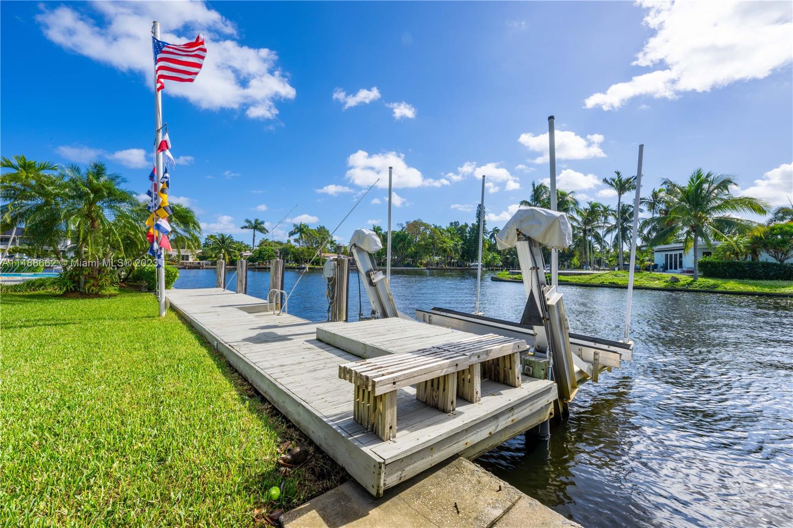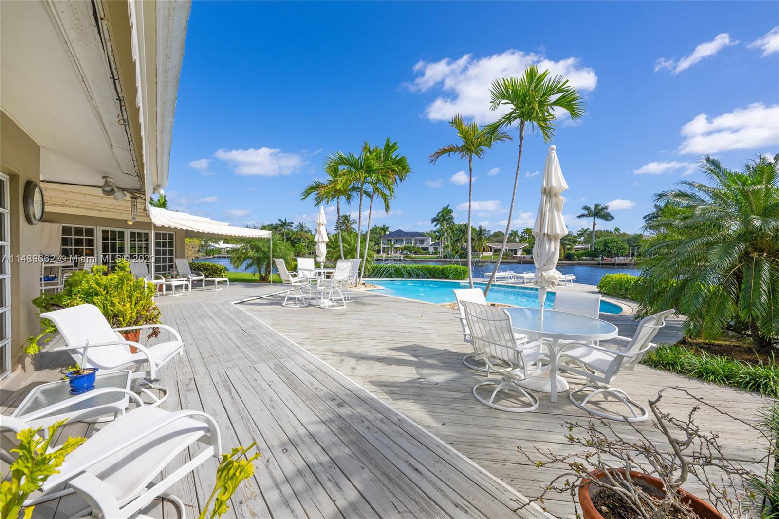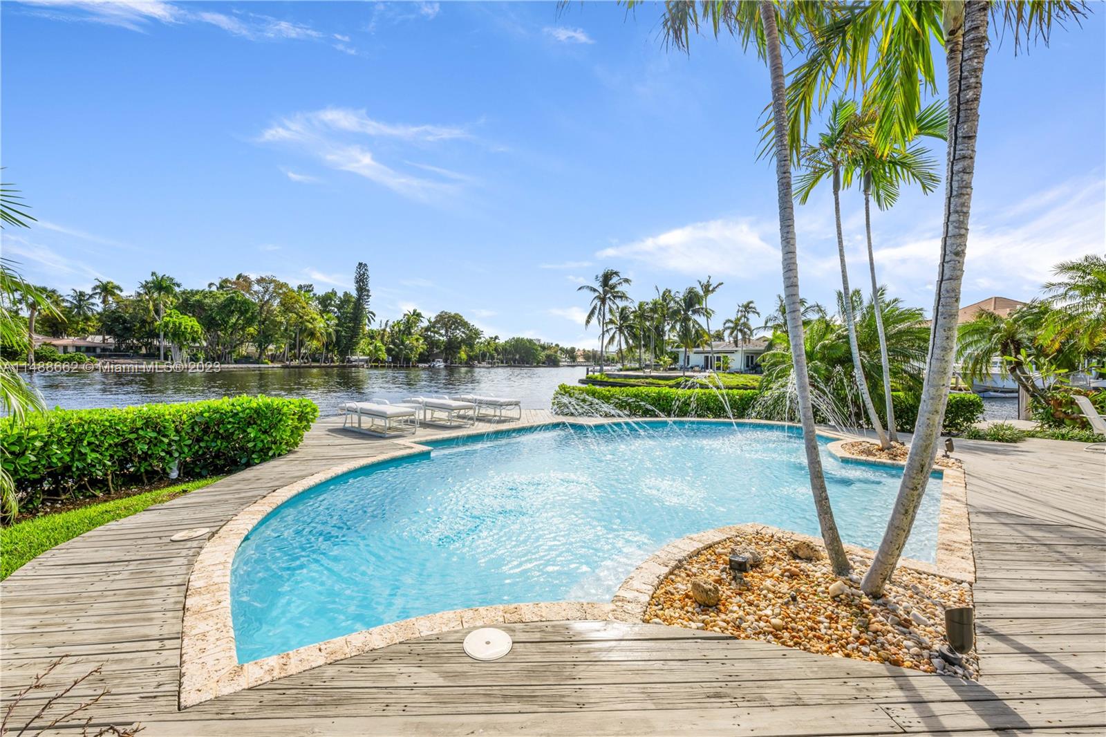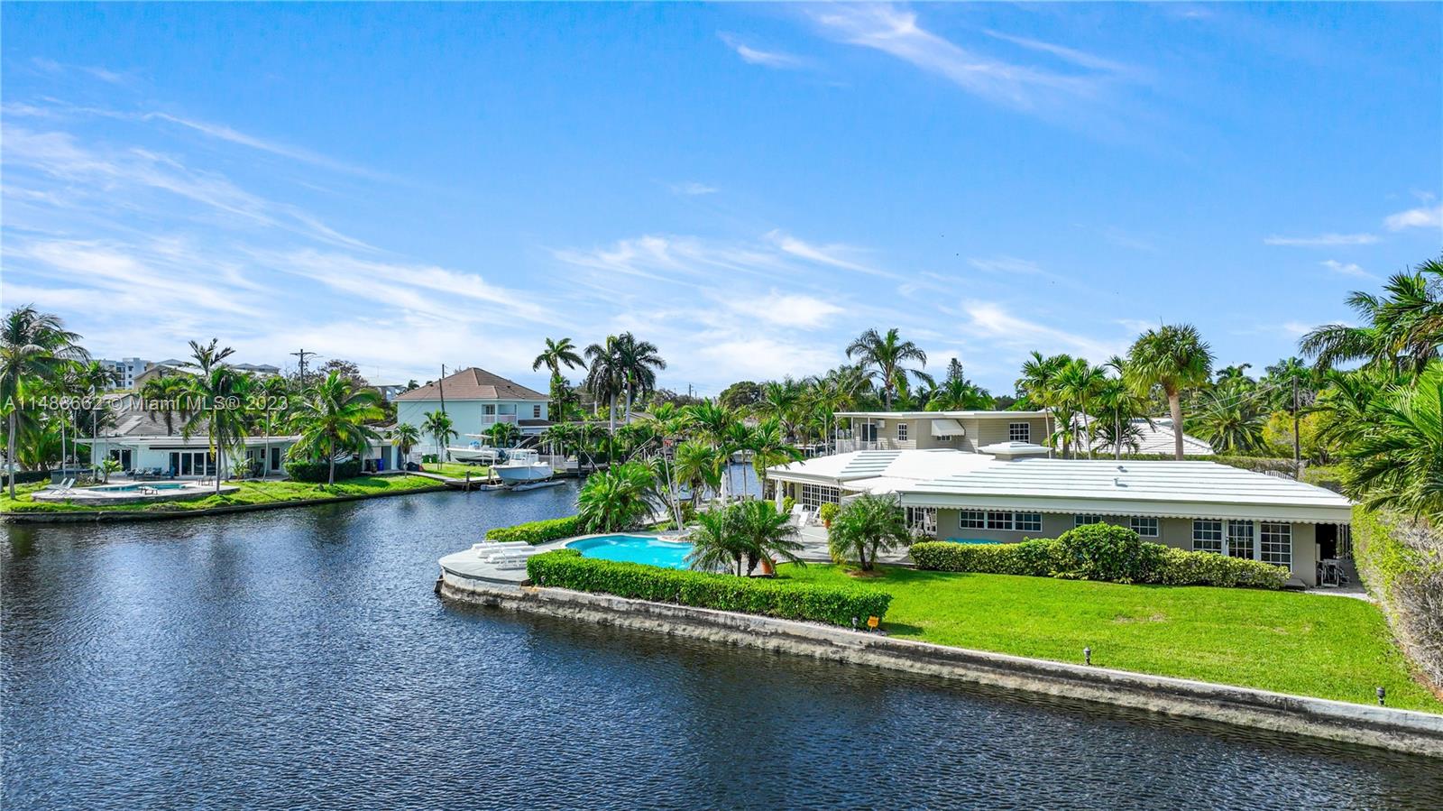 Spectacular find in prestigious Laudergate Isles. Ocean access corner point lot on Middle River, 252 ft. waterfront. Outdoor paradise, thoughtfully designed patio ideal for outdoor gatherings, relaxation, & al fresco dining. Enjoy the Florida sunshine, southern breeze, & infinite N, E & S river views. House sits on 39 pilings, 65 ft deep, 13 for the heated pool, with spa bench, jets & fountains. Wet bar, wine cooler. Jacuzzi in master bath, steam shower, dual vanities, bidet. Blackout shades in media room. Hunter Douglas shades. Tempered safety glass. REME HALO air purification. Alarm, cameras, electric gate, boat lift. Ideal for builders or end users. Highly sought-after neighborhood, enjoy city living, surrounded by water, lush greenery and a peaceful atmosphere