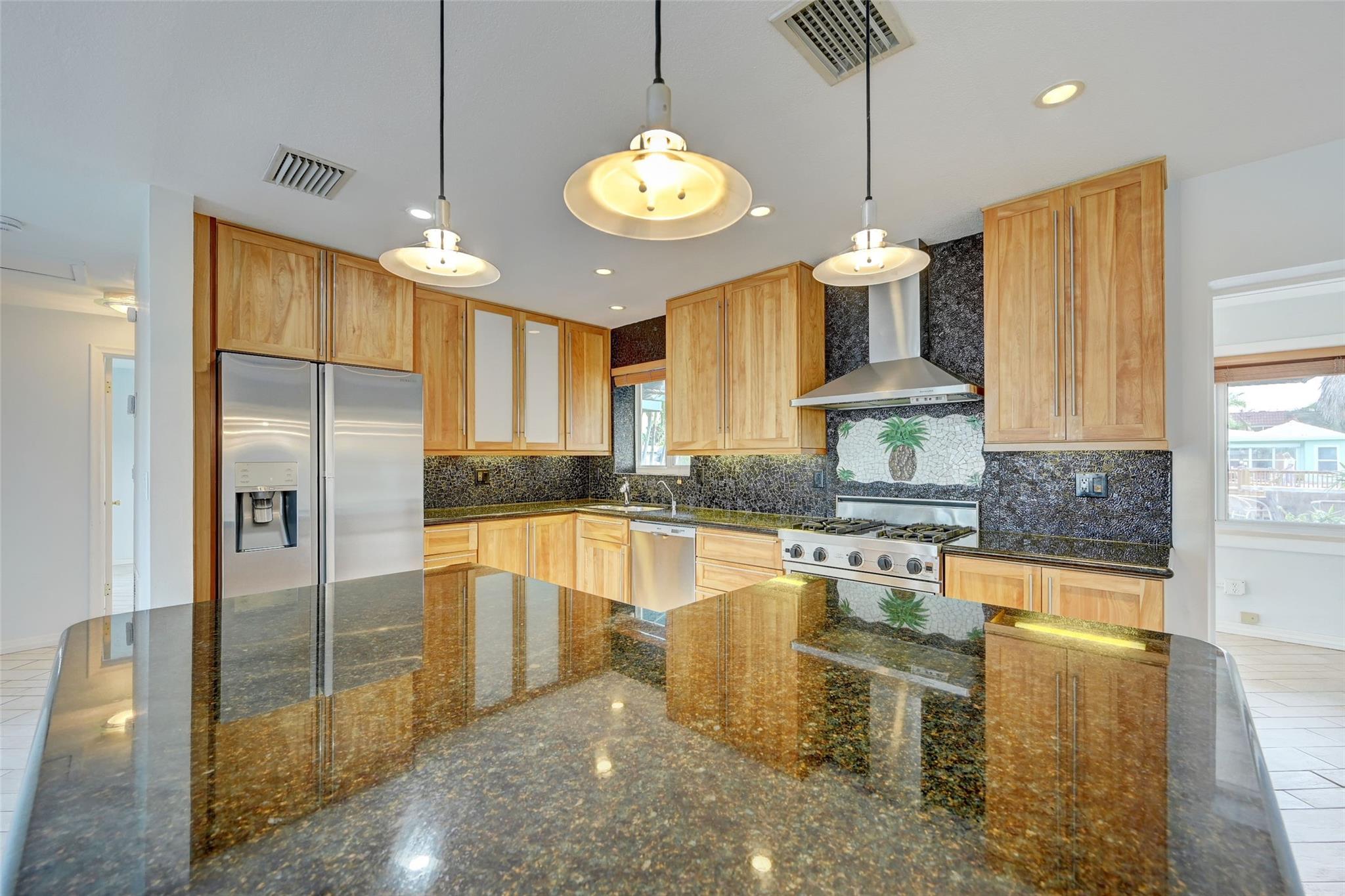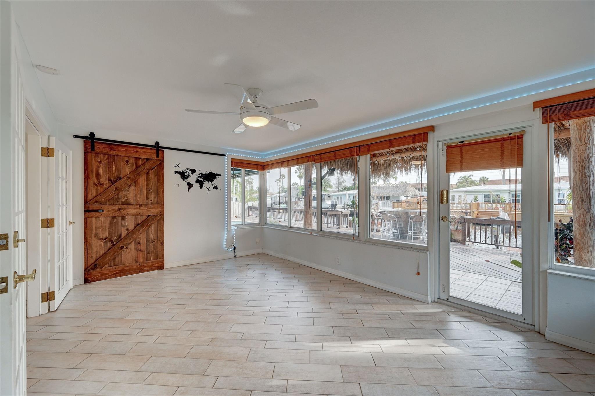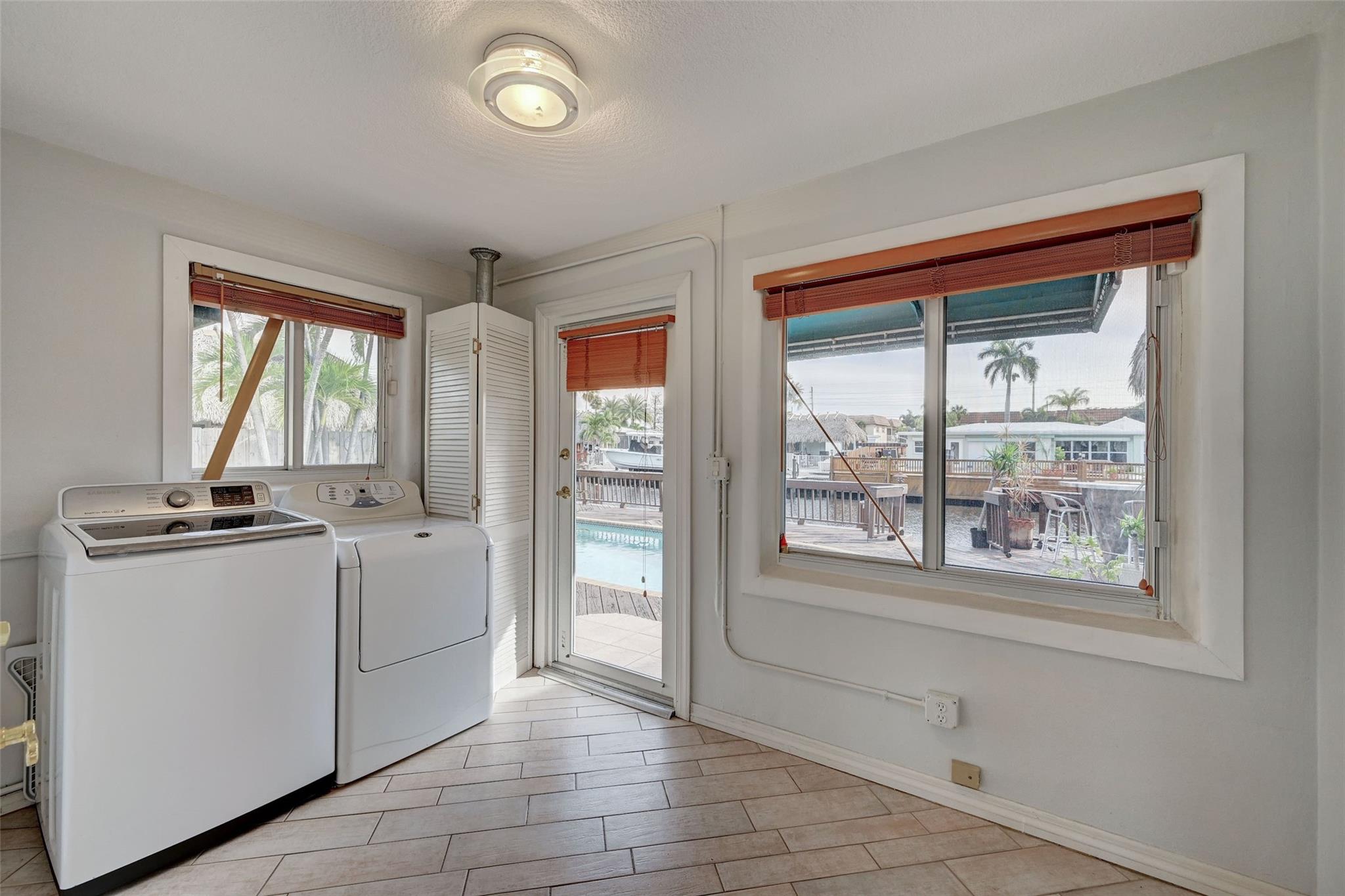Beautiful updated 2 bedroom, 2 bath waterfront home with pool. Very spacious open floor plan with den/office area overlooking canal. Gourmet kitchen with stainless steel appliances and gas viking stove. Impact windows and doors throughout. New A/C. 1 carport and long driveway with plenty of room for parking. Salt water pool with large area for entertaining with tiki hut. Utility room and separate storage room. New electric panel. New pilings. South exposure! Great location close to shopping, restaurants, golfing and the beach! Lowest price waterfront home in Pompano with only one fixed bridge, federal highway.