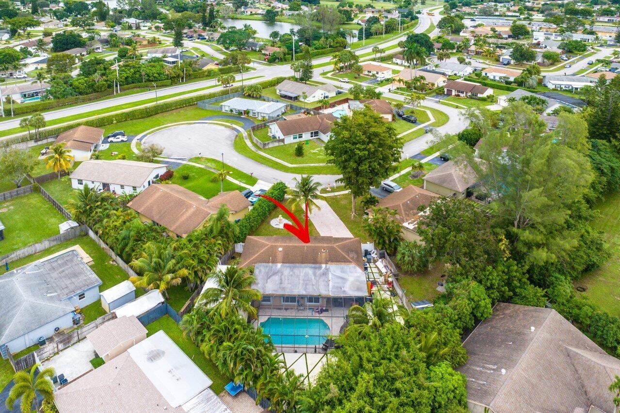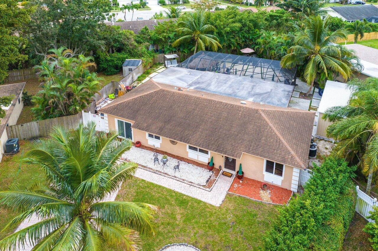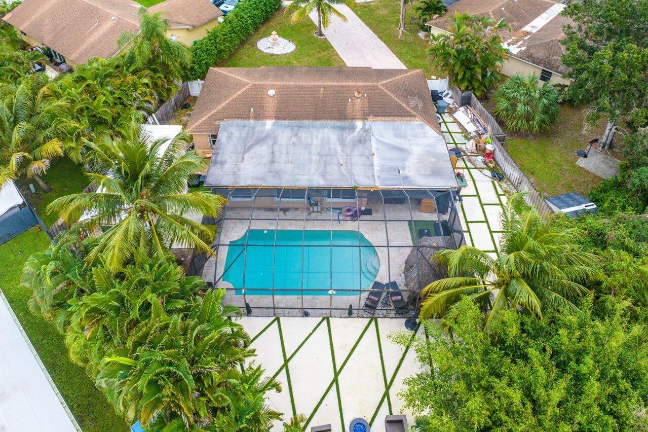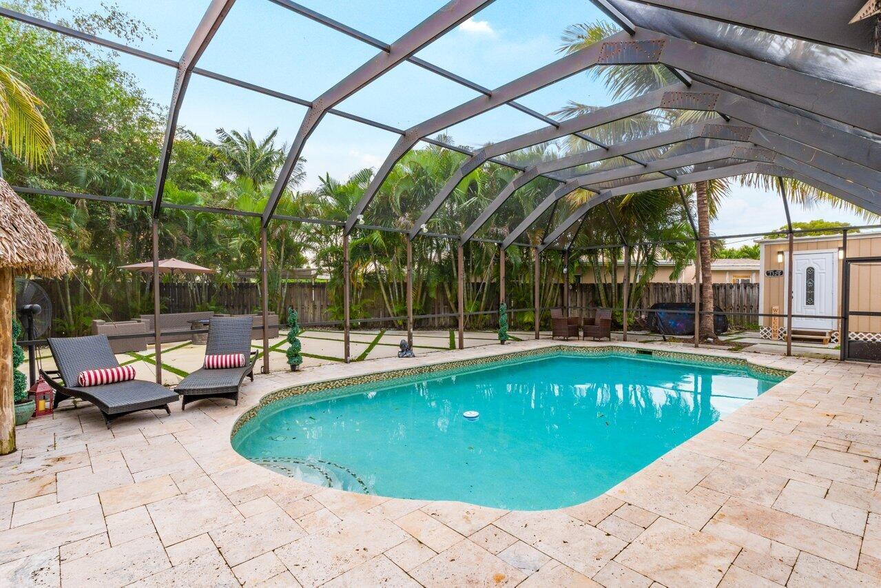 Welcome to Boca Raton!! This beautiful and spacious 5 bed 2 bath single family home with huge travertine paved backyard with a fully screened patio and huge 30 x15 private heated pool with outside shower, on one of the largest pie shaped lots in the community which provides lots of backyard space. Property features double room main bedroom, new roof 2016, wood laminate flooring over off-white ceramic tile underneath, new hurricane impact windows and doors 2022, formal living and huge family room, newer tiki hut, outside bar for entertainment, updated kitchen, updated main bathroom and guest bathroom. Newer water heater and a/c unit, huge driveway. Newer sprinkler system with pump. Close to A graded schools, houses of worship, shops, and parks.
