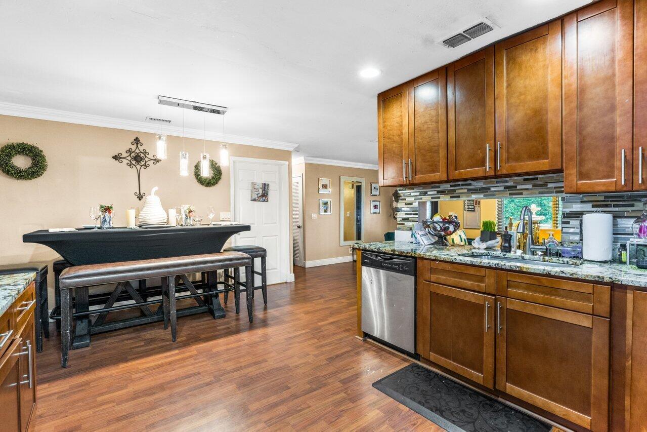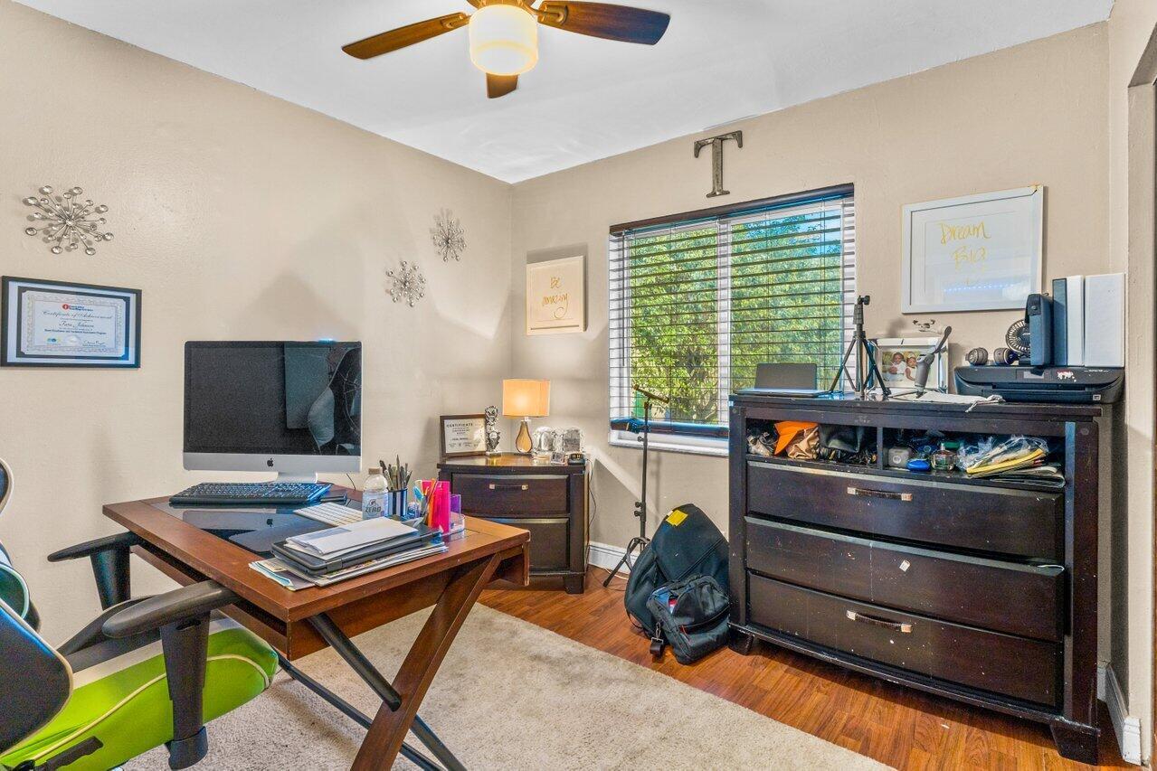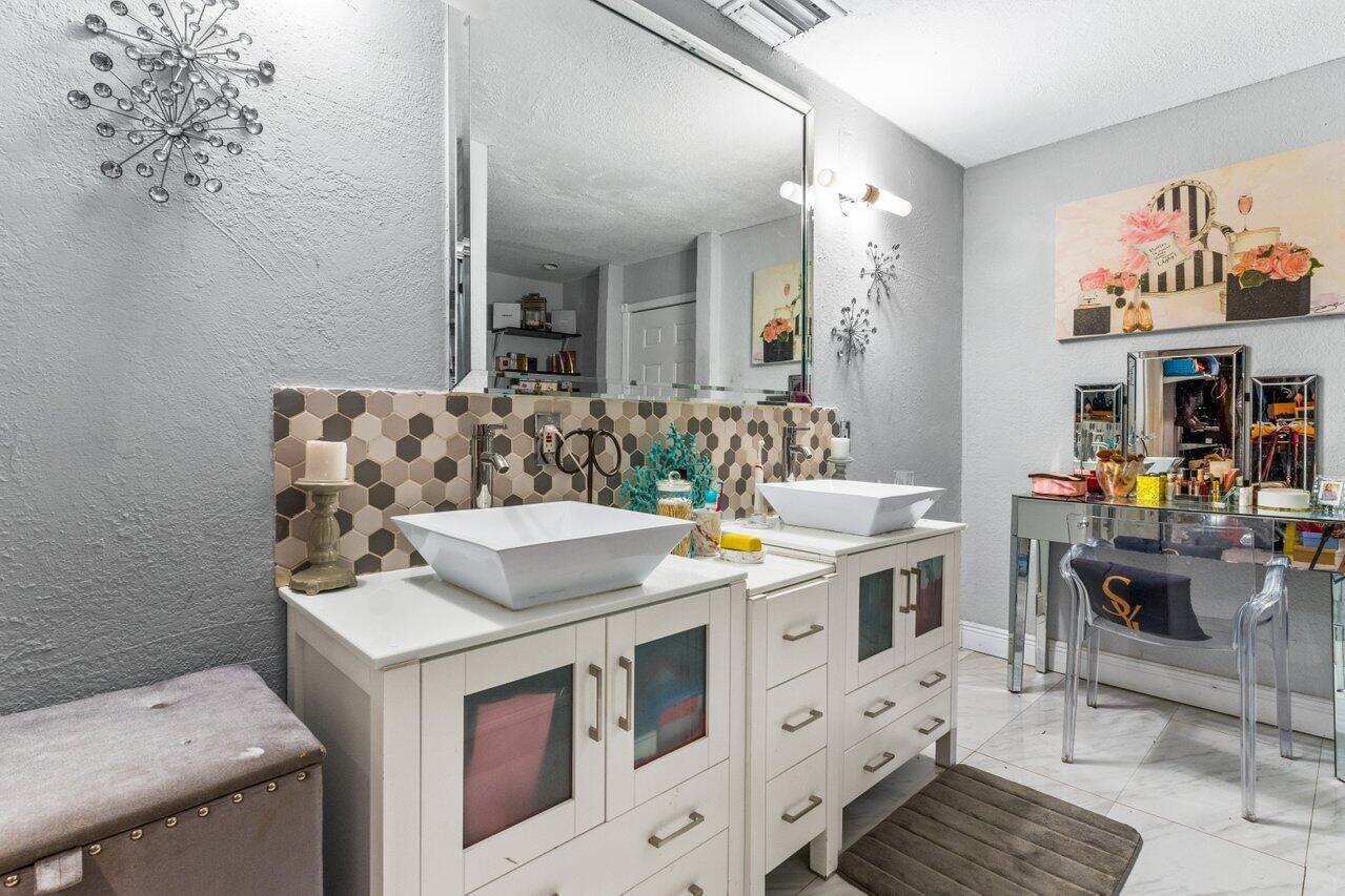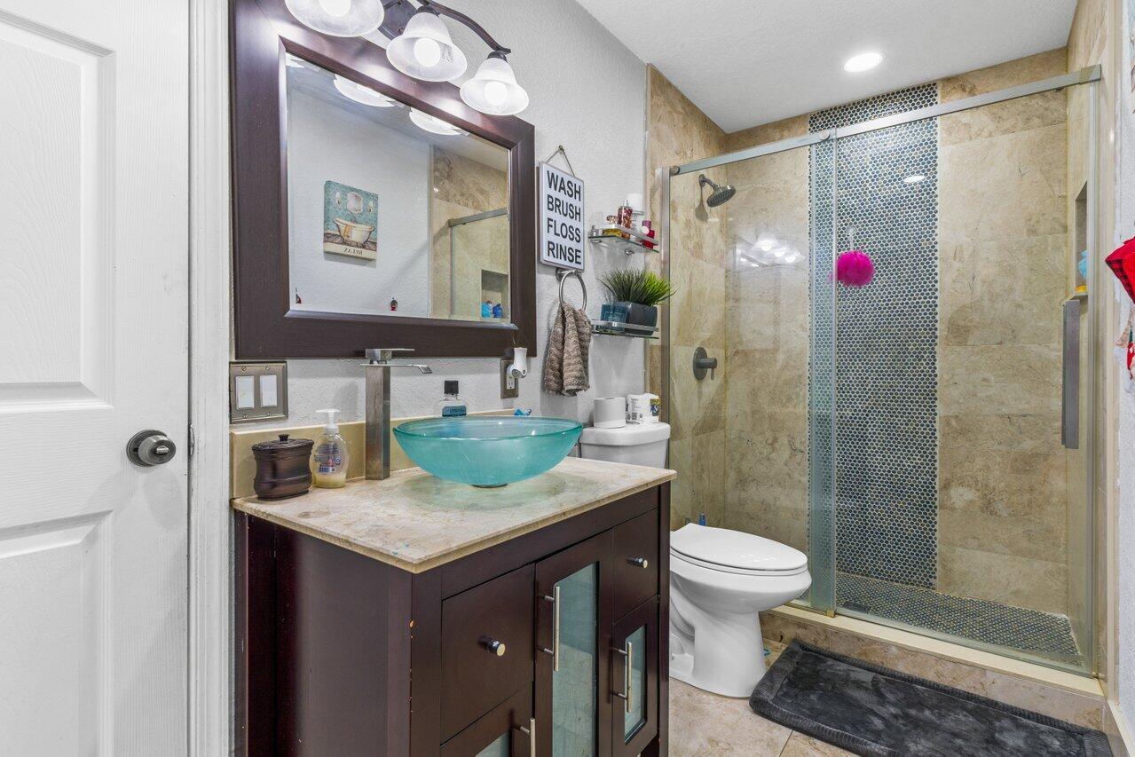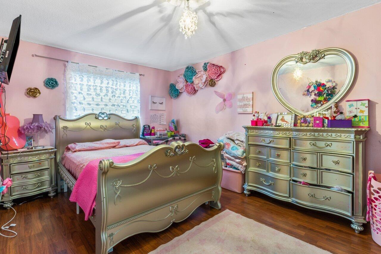 Welcome to Boca Raton!! This beautiful and spacious 5 bed 2 bath single family home with huge travertine paved backyard with a fully screened patio and huge 30 x15 private heated pool with outside shower, on one of the largest pie shaped lots in the community which provides lots of backyard space. Property features double room main bedroom, new roof 2016, wood laminate flooring over off-white ceramic tile underneath, new hurricane impact windows and doors 2022, formal living and huge family room, newer tiki hut, outside bar for entertainment, updated kitchen, updated main bathroom and guest bathroom. Newer water heater and a/c unit, huge driveway. Newer sprinkler system with pump. Close to A graded schools, houses of worship, shops, and parks.