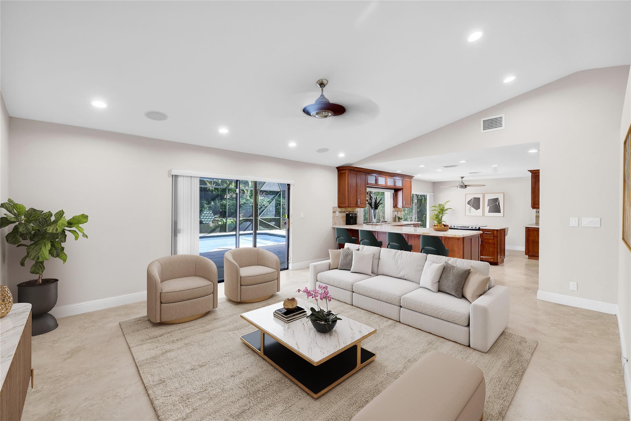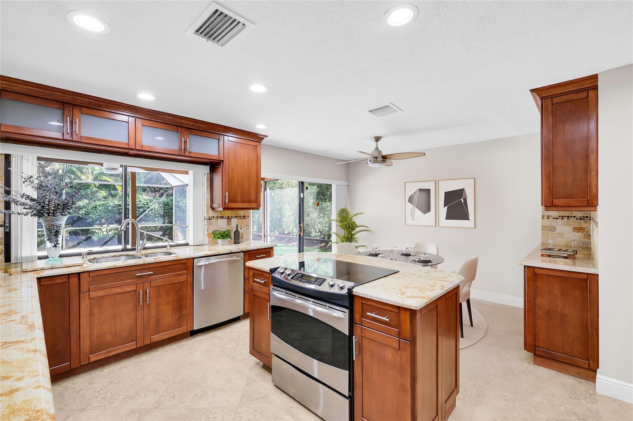 Best deal in Coral Springs! Desirable Shadow Wood neighborhood with NO HOA! Oversized private corner lot & huge circular driveway. Featuring 5 real bedrooms and a 2.5 bathrooms. Rarely do you find vaulted ceilings and the extra 1/2 bath in this part of town but HERE IT IS! Tile floor throughout the living areas with separate formal living, formal dining, and large Family room. Kitchen has TONS of storage and has been updated w/ custom real wood cabinets, island, high-end granite counters, and high-end Stainless Steel appliances. Kitchen features eat-in area for casual dining. Large inside laundry room. IMPACT WINDOWS & DOORS (sliders have shutters). All bathrooms are updated & bedrooms are generously sized. Master features walk-in closet. Bring your toothbrush and move right in!