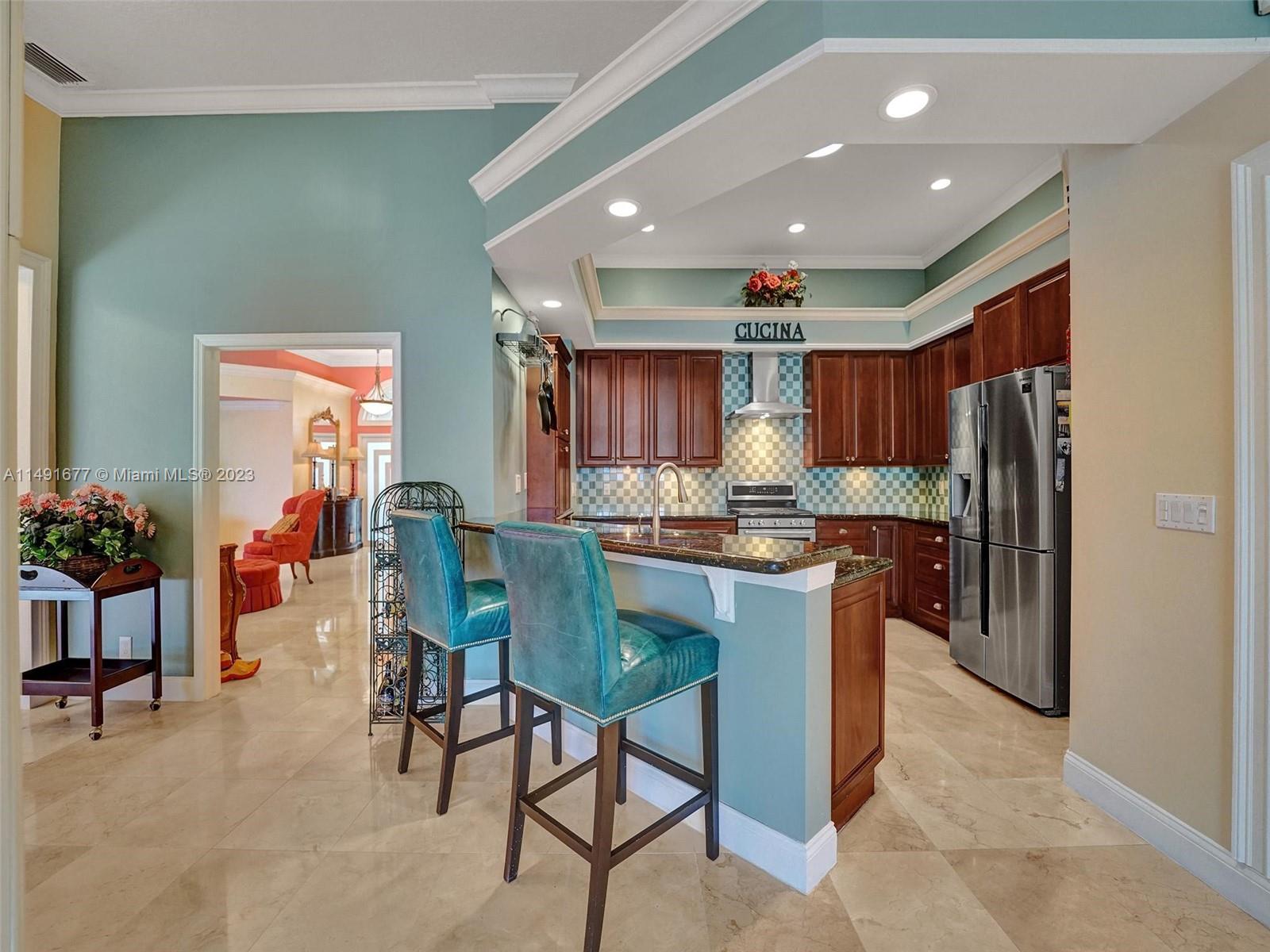 Tucked in a quiet cul-de-sac, this 4 Br + office + study/gym, waterfront gem offers an elegant interior with 12 ft ceilings & luxurious marble floors. Large kitchen featuring mahogany wood cabinetry, plenty of storage & workspace, updated appliances & gas stove. New air-conditioned sunroom w/remote-controlled shades. Outdoor oasis with a solar-heated salt pool, travertine deck & cedar pergola, views of the lake/wildlife preserve & memorable sunsets year-round. Oversized driveway, 3-year-old roof, new A/C unit. This haven is part of a welcoming community. Bonus features: New lake-fed irrigation system, new pool equipment, accordion shutters. Ideal location, closest to the resident gate, tennis court & playground, 4 mins from shopping & I-75. Nearby 7-1/2 miles of trails for biking/walking