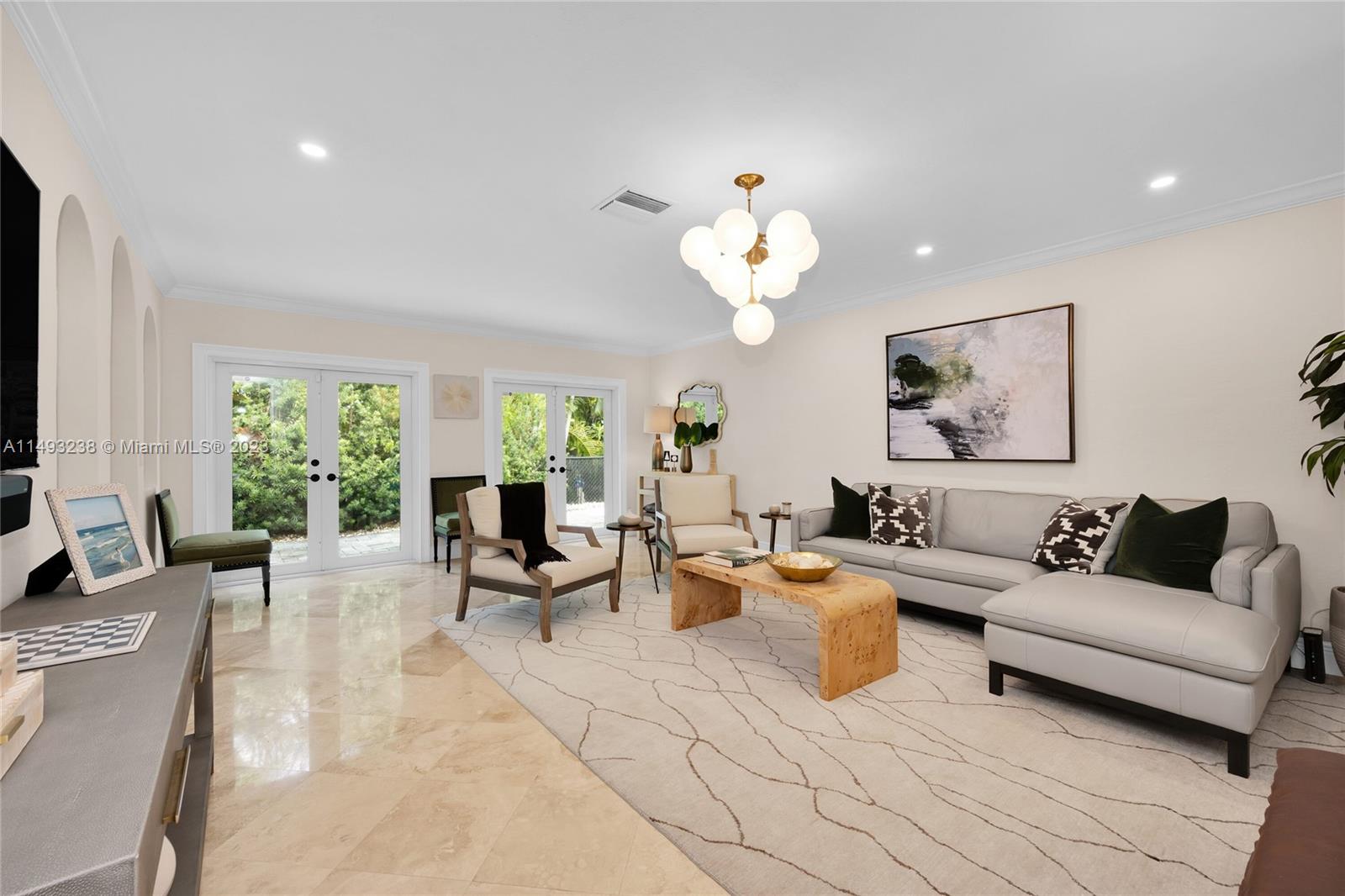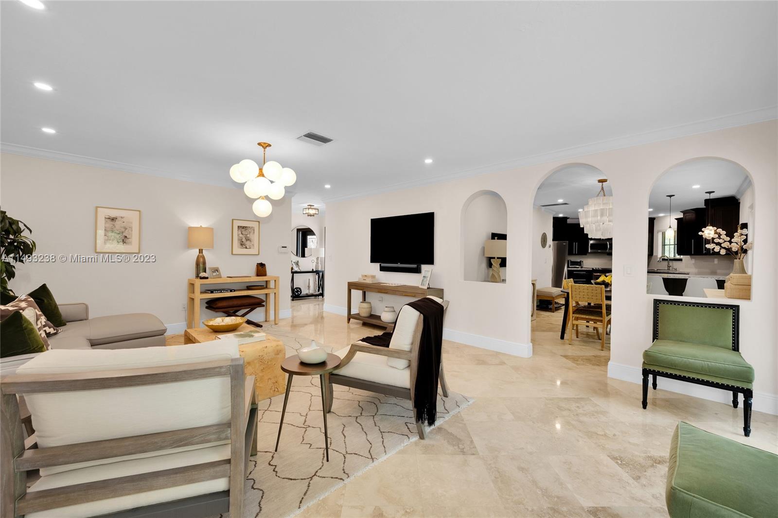 GREAT LOCATION! Near the Shops at Merrick Park and Riviera Country Club, this remodeled, 3-bedroom, 2.5 bath residence is located <1 mile from UM. Sunlight floods 2,255 sf of spacious interiors, highlighting travertine marble floors in the living spaces and bamboo wood floors in each bedroom. An updated, eat-in kitchen features custom cabinetry, granite countertops, stainless steel appliances, and impact glass French doors that open onto the patio. The home includes a flex room w/closet, indoor laundry room, 1-car garage, ChargePoint car charger, new A/C unit, new impact glass windows throughout, and a sweeping circular driveway for ample parking. Embrace the Coral Gables lifestyle in this exquisite, move-in-ready home!