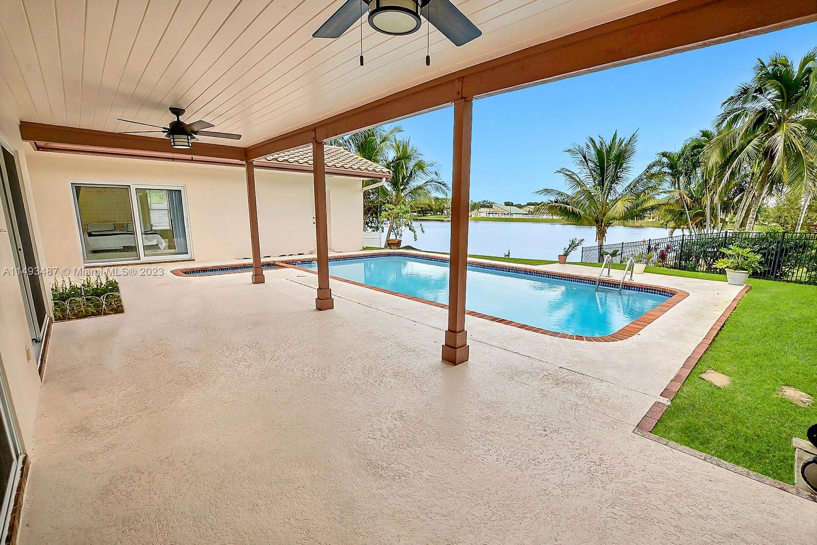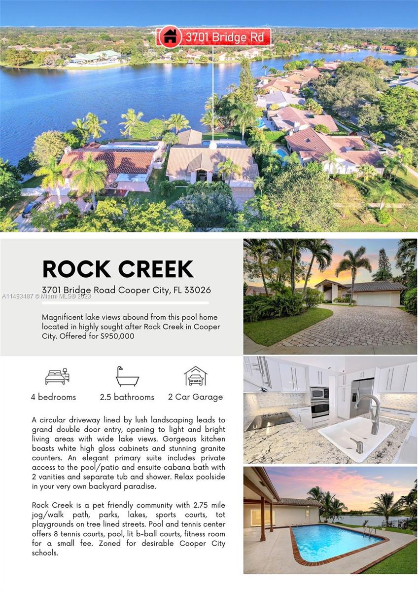 MAGNIFICENT LAKEVIEWS FROM 4 BED 2.5 BATH POOL HOME LOCATED IN HIGHLY SOUGHT AFTER ROCK CREEK, COOPER CITY. CIRCULAR DRIVEWAY LINED BY LUSH LANDSCAPING LEADS TO GRAND DOUBLE DOOR ENTRY, OPENING TO LIGHT & BRIGHT LIVING AREAS W WIDE WATERVIEWS. GORGEOUS KITCHEN FEATURES WHITE HIGH GLOSS CABINETS & STUNNING GRANITE COUNTERS. ELEGANT PRIMARY SUITE INCLUDES PRIVATE ACCESS TO THE POOL/PATIO & ENSUITE CABANA BATH W 2 VANITIES, SEPARATE TUB & SHOWER. IMPACT WINDOWS. RELAX POOLSIDE, ENJOY AN OUTDOOR KITCHEN IN YOUR VERY OWN BACKYARD. ROCK CREEK IS A PET FRIENDLY COMMUNITY W 2.75 MILE JOG/WALK PATH, PARKS, LAKES, SPORTS COURTS, TOT PLAYGROUNDS ON TREE LINED STREETS. POOL & TENNIS CENTER OFFERS 8 TENNIS COURTS, POOL, LIT B-BALL COURTS, FITNESS ROOM FOR A FEE. ZONED FOR DESIRABLE COOPER CITY SCHOOLS.