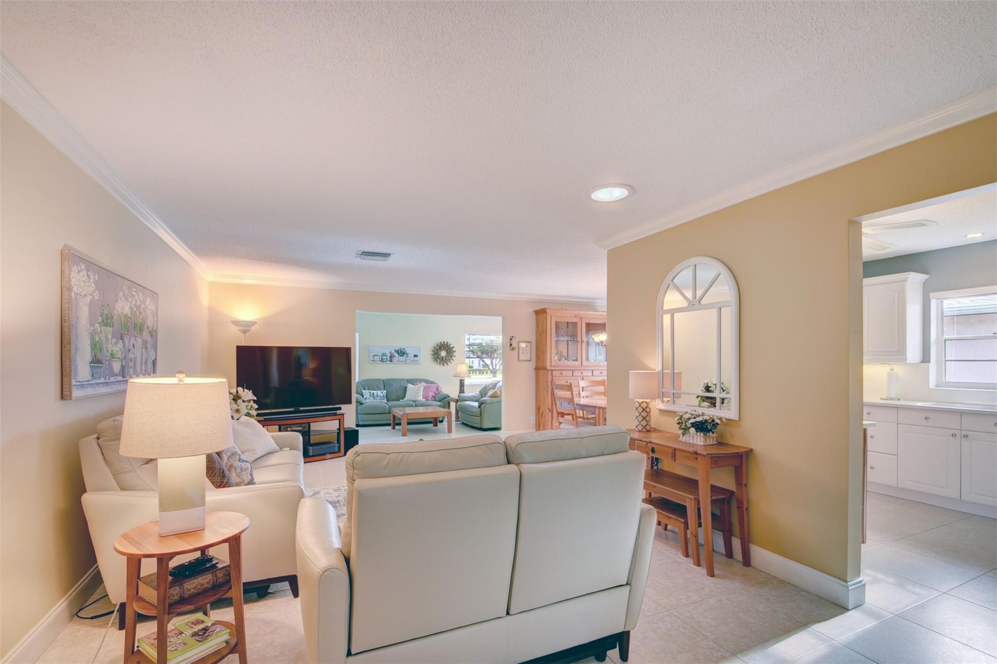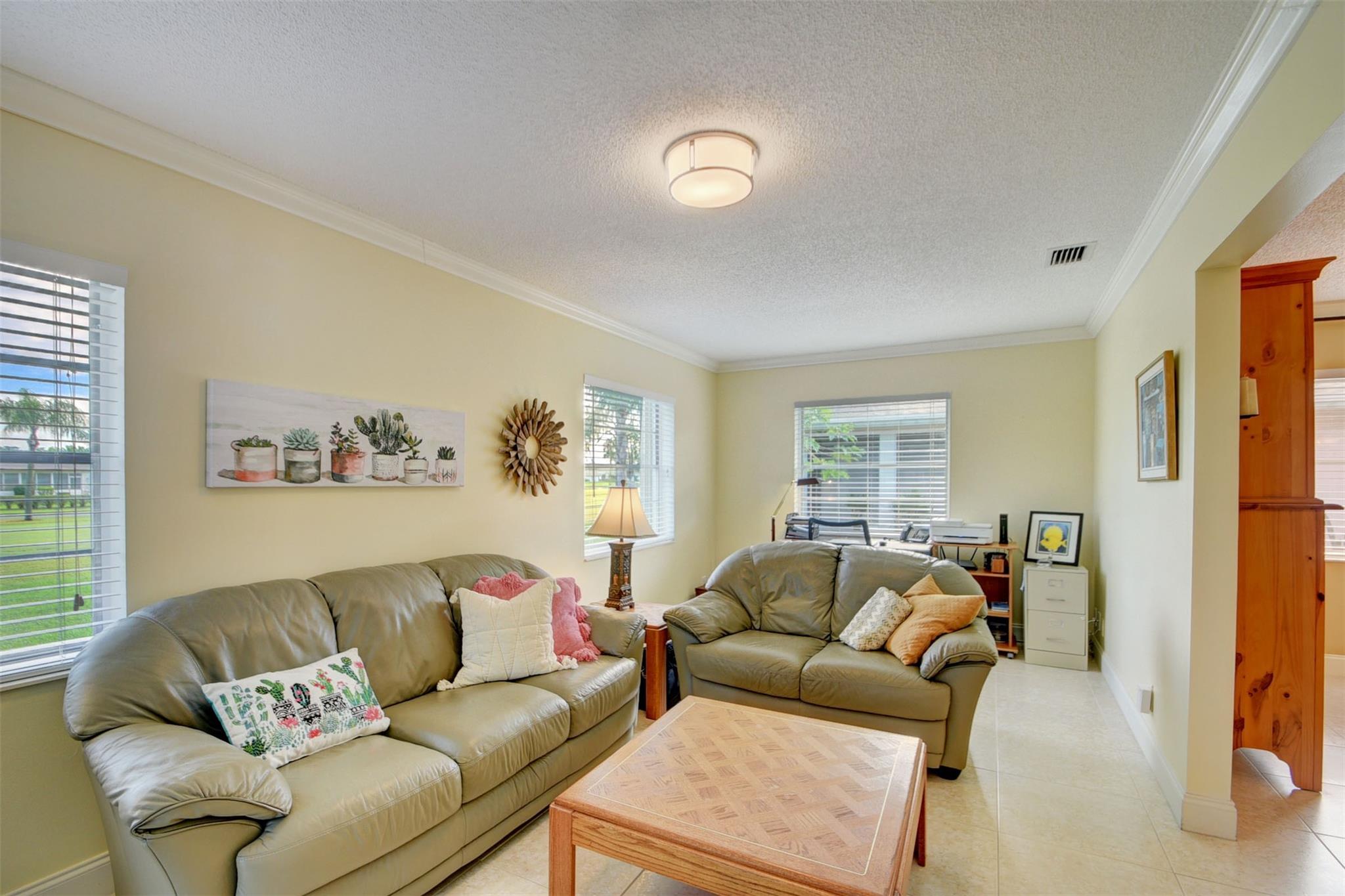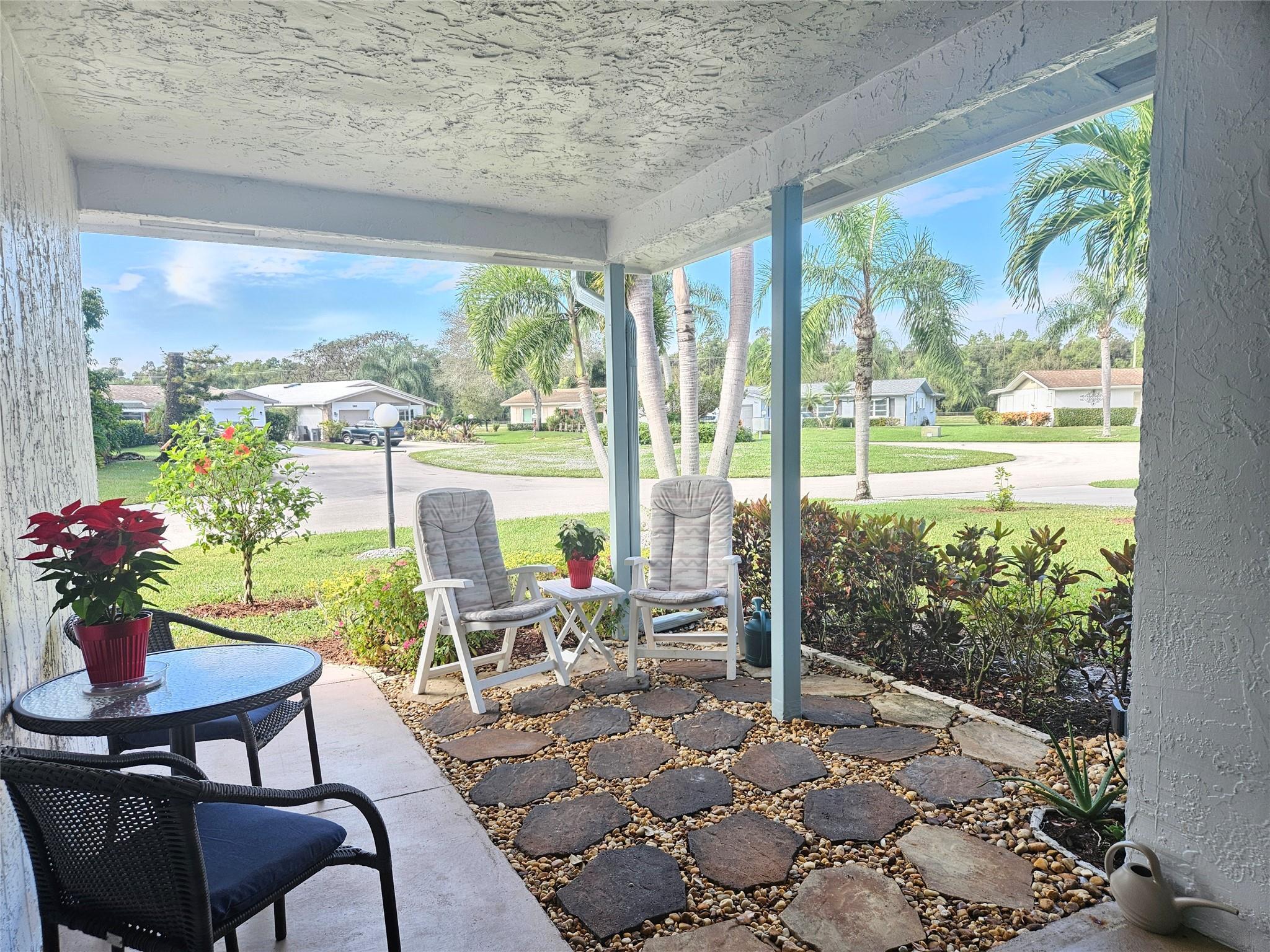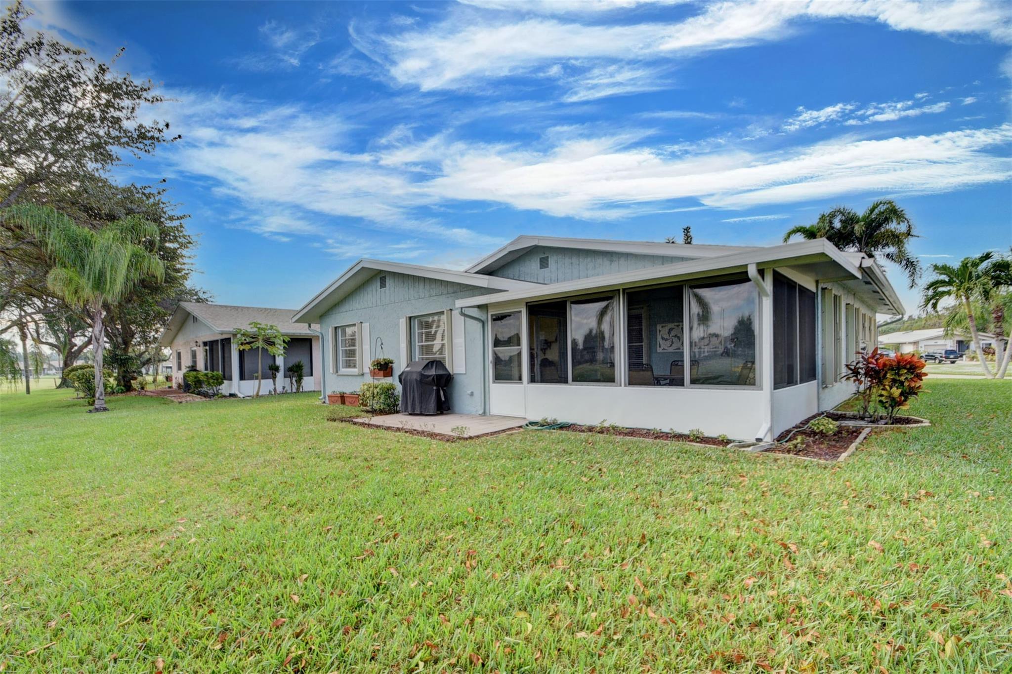Charming 2 beds, 2 baths 1 car garage house on the Golf. Updated kitchen. White cabinets, tile backsplash, stainless appliances. quartz counter tops. Lots of cabinets & pantry for extra storage. Spacious open floor plan. Bright with lots of natural light. Tile flooring & wood in master bedroom. Spacious mater bedroom w/ lots of closet & updated bathroom w/ tiled shower. Large enclosed Florida room overlook a relaxing & entertaining Golf views. Sold furnished. NEW roof coming in 2024. A/C 2023. Water heater 2021. Accordion Shutters. Active 55+ community, offer many activities & Amenities. Fitness center, heated pool, Clubhouse, Billiard & more. PLAY GOLD FOR FREE! Ride your Golf Cart throughout the community. Gated w/ security patrol. Great location minutes to shopping & restaurants.