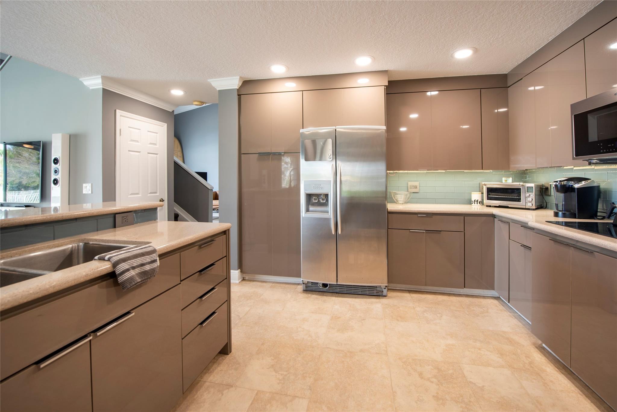5BR/4BA BEAUTY ON FENCED WATERFRONT POINT LOT W/LONG LAKE VIEW & PRIVATE CUL DE SAC! NEW ROOF! Beautiful 2-story/split-level home with primary bedroom suite & one other bedroom/office downstairs. A very flexible floorplan, the Catalina model is rarely available. Large open layout family & living rooms with expansive offset tiles. Modern kitchen, stainless appliances w/double ovens, granite countertops highlight this updated home. An executive office (or additional bed) downstairs & full cabana bath adds versatility. The upstairs features 3 additional bedrooms and 2 more full baths & a loft/study, making for a perfect kid's retreat. All this coupled with an expansive fenced yard & oversized lakeside patio. Premium gated community with all "A" schools, lighted tennis, & playground.