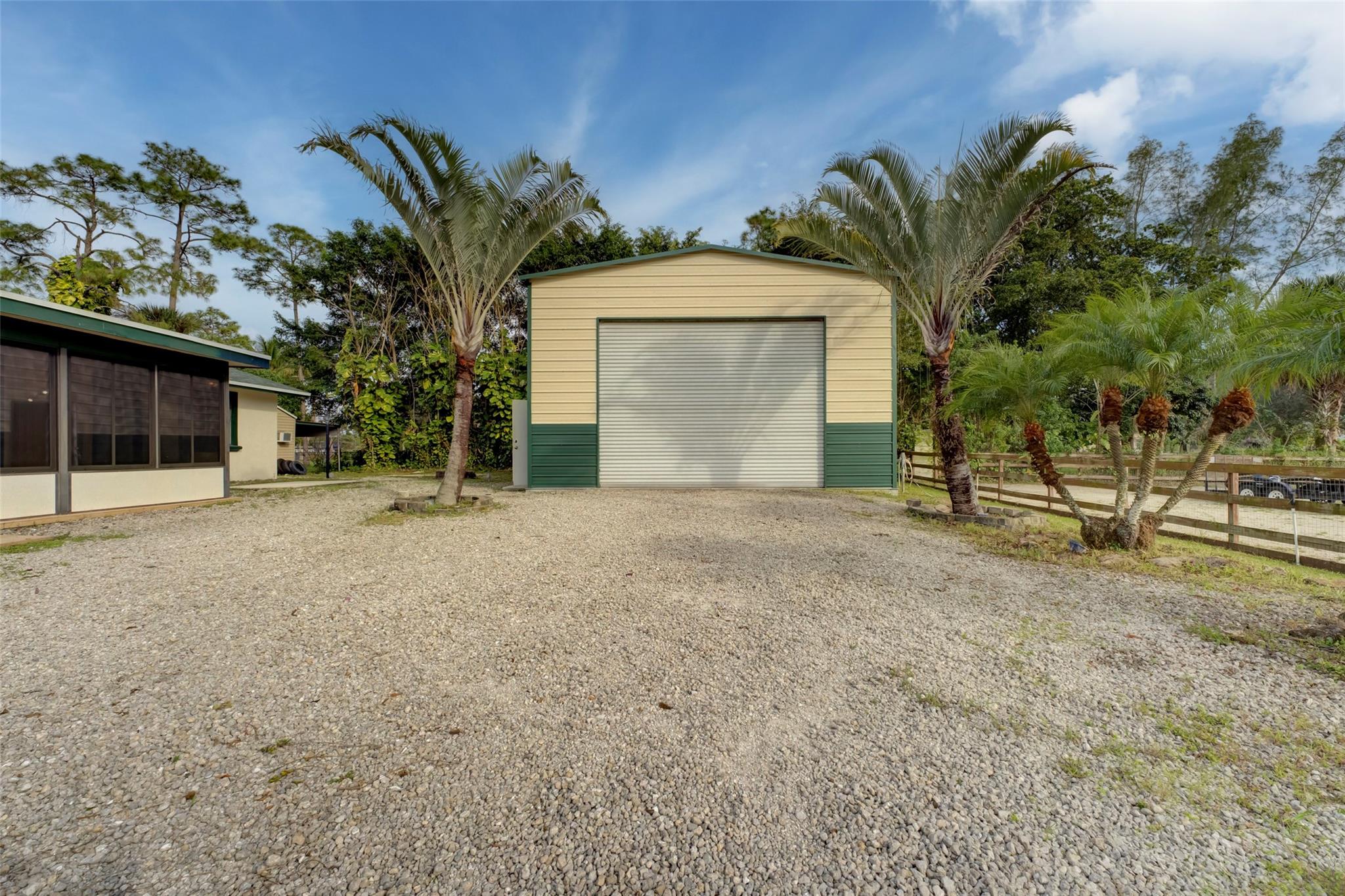 In the heart of West Palm Beach with no HOA or restrictions this 1.25 acre fully fenced property offers unmatched value and versatility. As you approach, a charming 3-bedroom, 2.5 bath home with a screen patio and a Florida sunroom and inviting porch welcomes you. A standout feature is the expansive workshop with 16' roll up door, high ceilings and concrete floors perfect for a boat, a workshop or car storage. Equestrian enthusiasts will appreciate the 5 stall rubber matted barn with turnout and exercise ring. Palm and pine trees adorn the landscape with lots of lush vegetation and privacy. Adjacent to the home there is an added shed, with and wall AC unit. This property is tailor-made for anyone's aspirations, perfect for small Business owners, Equestrians, Families or Investors.
