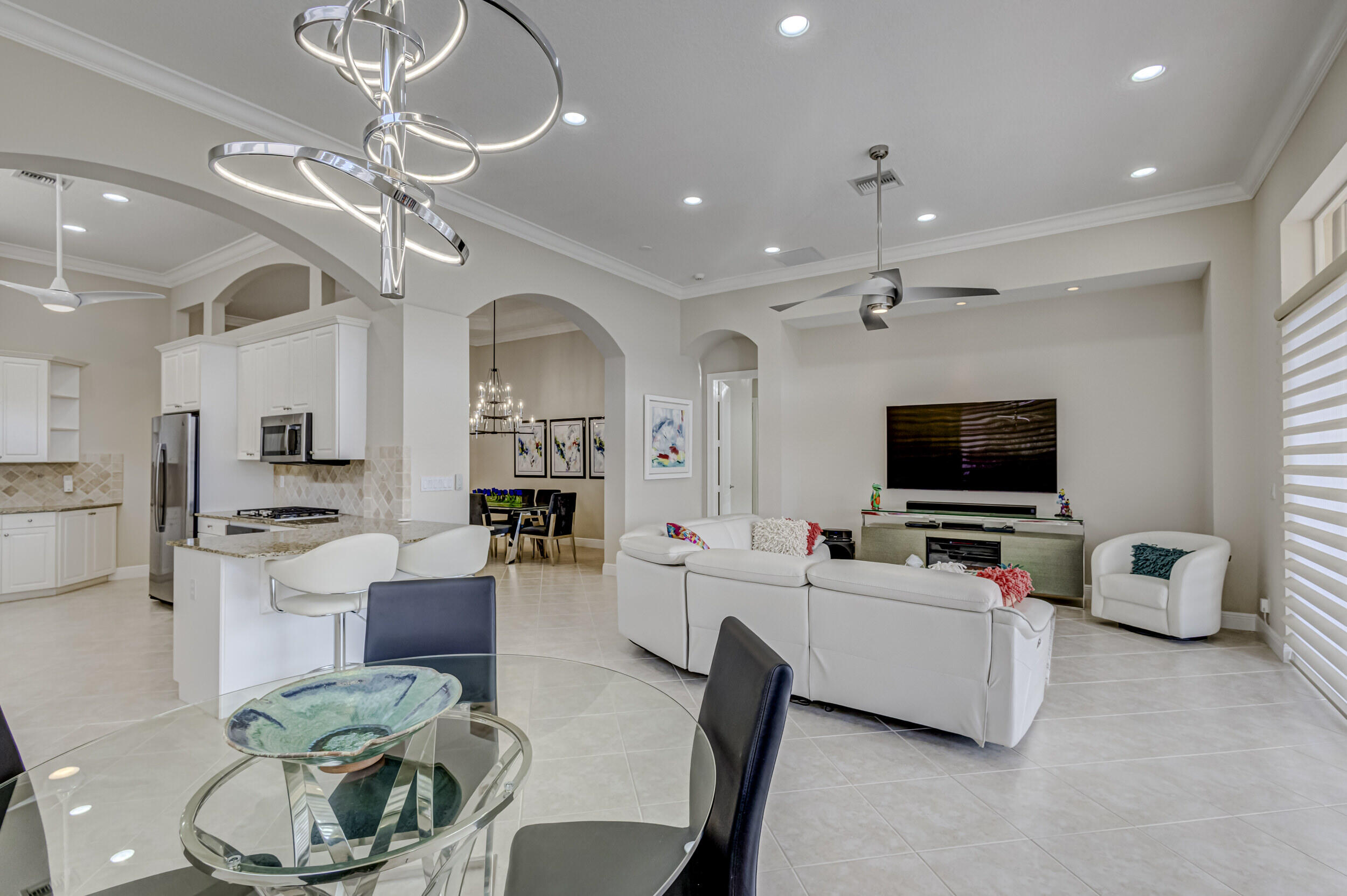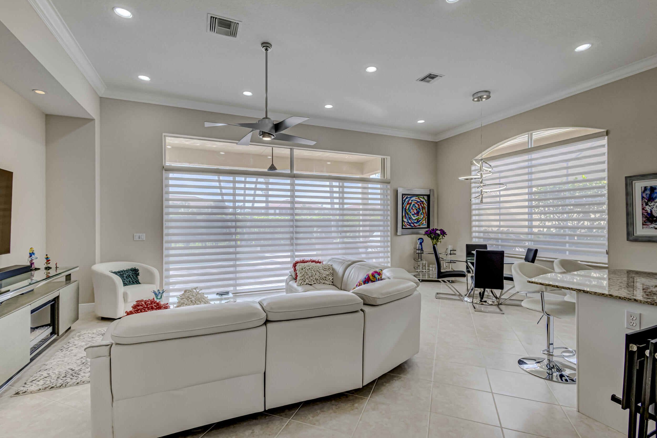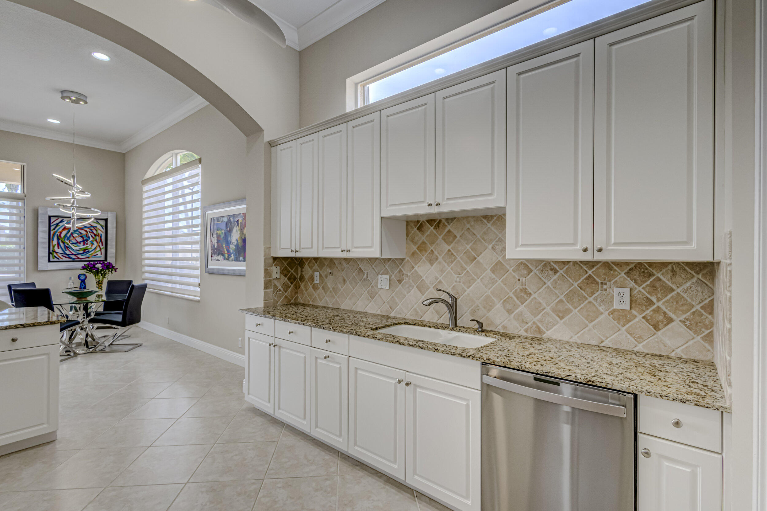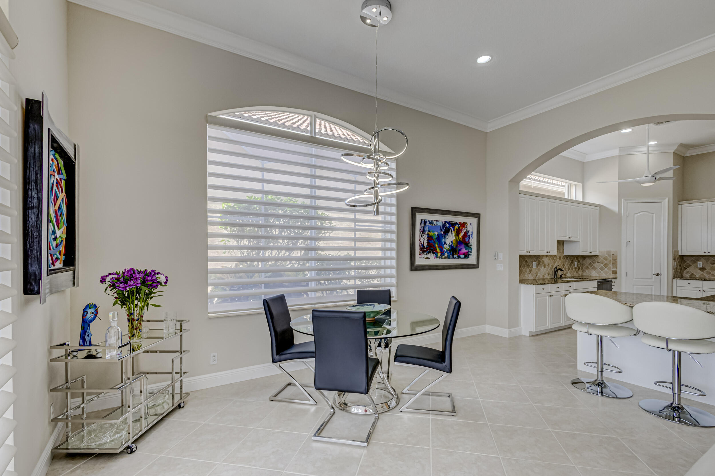 As you approach the property, the lush landscaping and manicured lawn set the stage for what awaits within. The Mediterranean-inspired architecture, complete with stucco finishes and a tile roof, adds a touch of elegance to the exterior. Inside offers a harmonious blend of contemporary design, upscale finishes, and unparalleled comfort. Step through the impressive double front doors into a grand foyer featuring high ceilings and beautiful tile flooring that extends throughout the main living areas. The open-concept design seamlessly connects the living spaces, creating an inviting and airy atmosphere. The gourmet kitchen is a chef's delight, boasting 2020 state-of-the-art stainless steel appliances, granite countertops and custom cabinetry. The adjacent formal dining area is (see MORE).