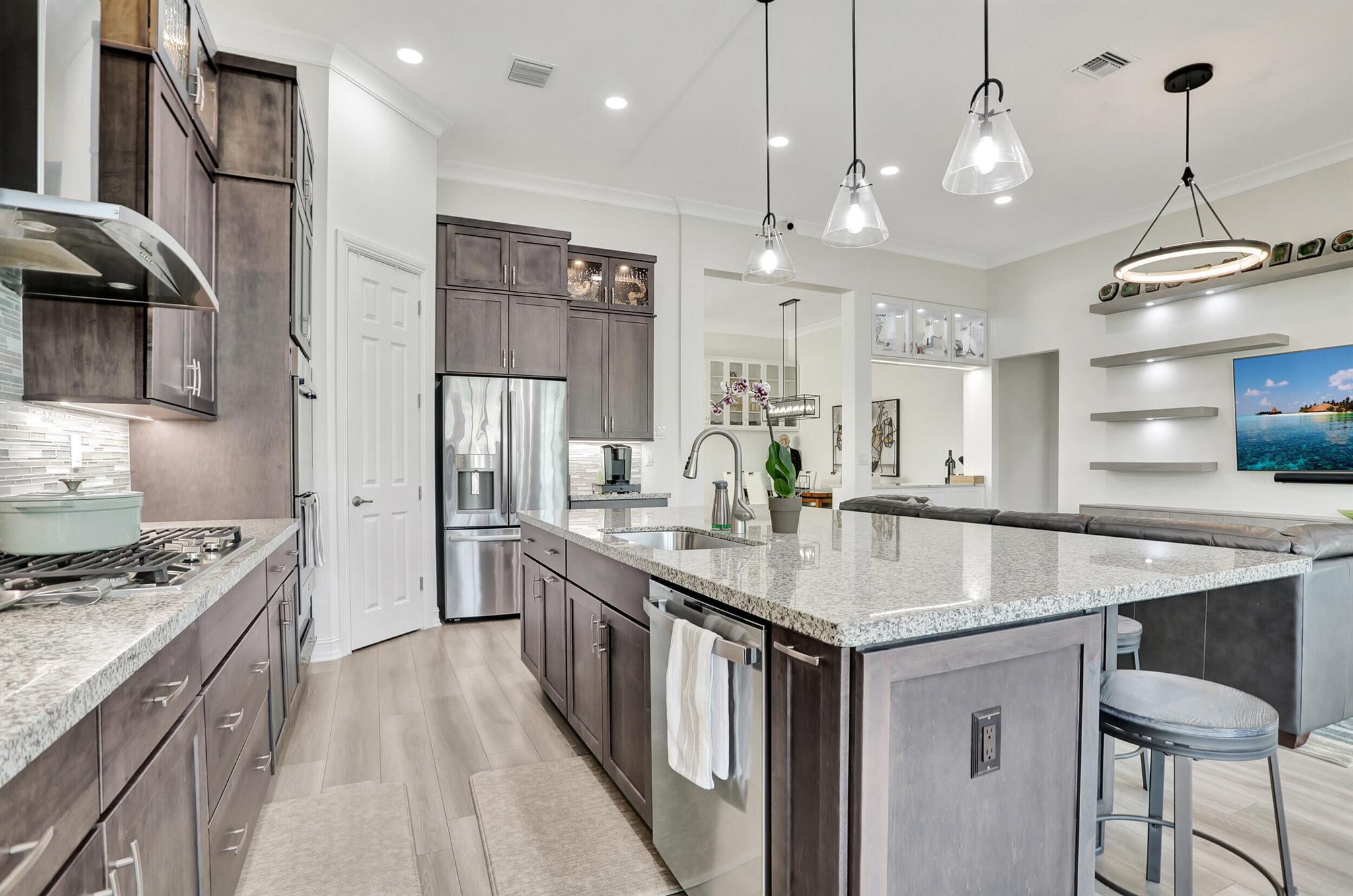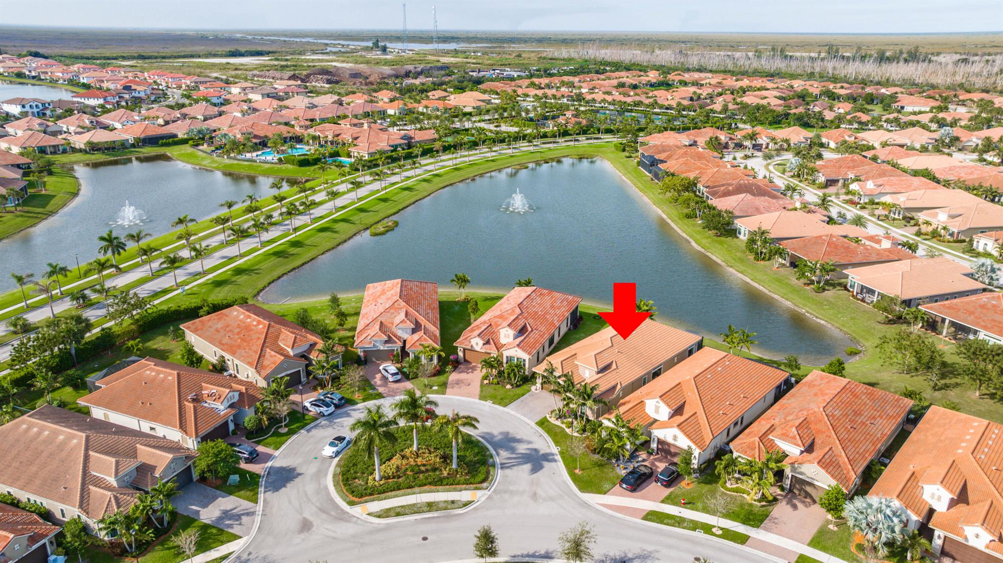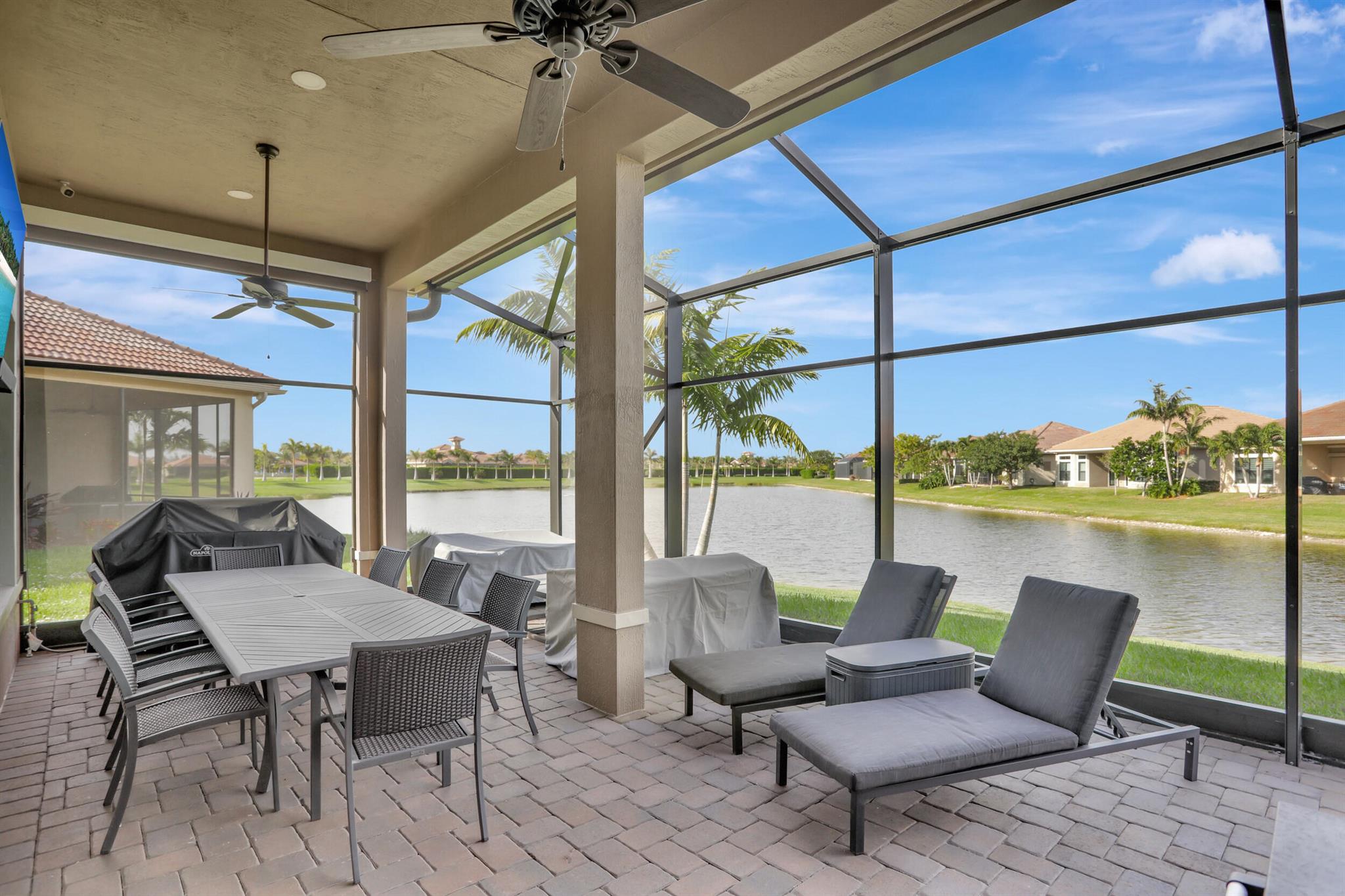 Fabulous Vera model situated on a cul-d-sac with long lake and fountain views, this 3 bedroom, 2 1/2 bath home has numerous upgrades, such as full house generator with natural gas, all hurricane glass windows, custom outdoor landscaping with spectacular lighting, incredible custom kitchen with large center island, up graded cabinets with soft closing drawers, tray dividers and double glass display cabinets with lighting. Stainless exhaust fan fully vented to the outdoors. New light fixtures and ceiling fans, and crown molding thru-out. The master bedroom has new flooring all custom closets. Plantation shutters as well as remote controlled shades. A wall of pocket sliding glass doors open to the patio for a huge, fabulous entertaining space. Screened in