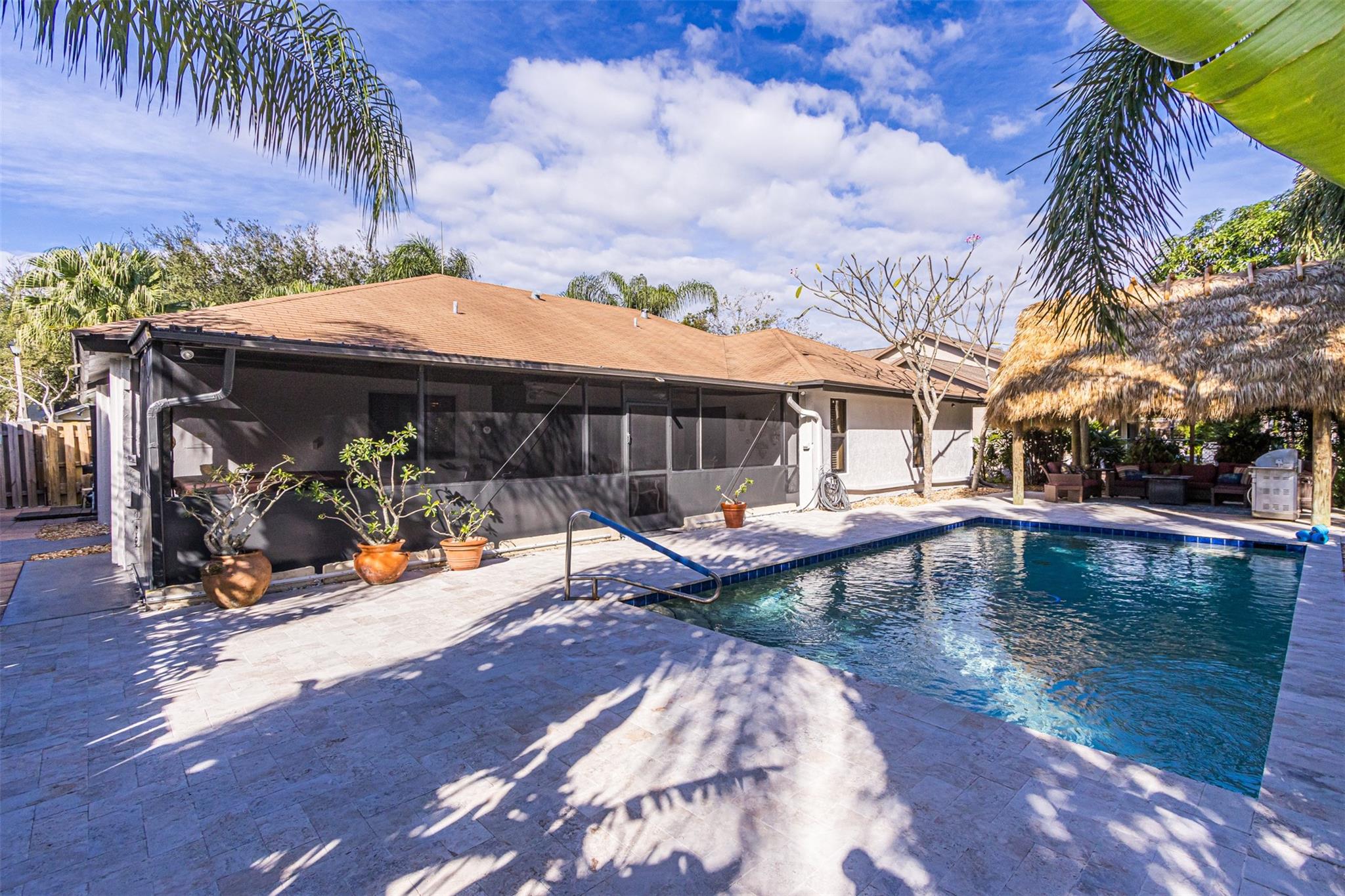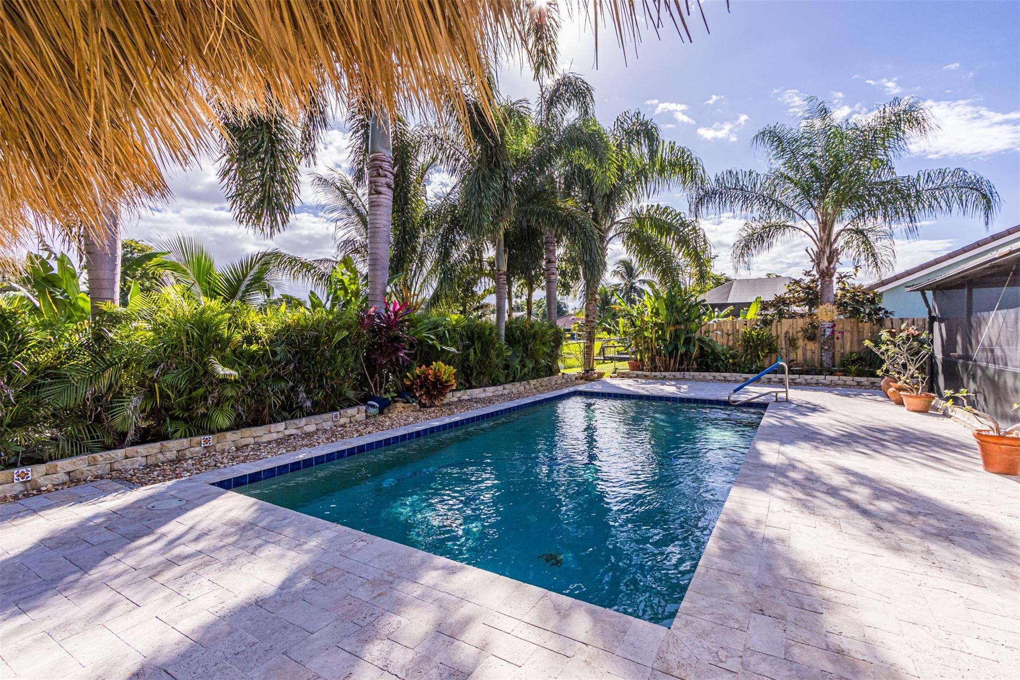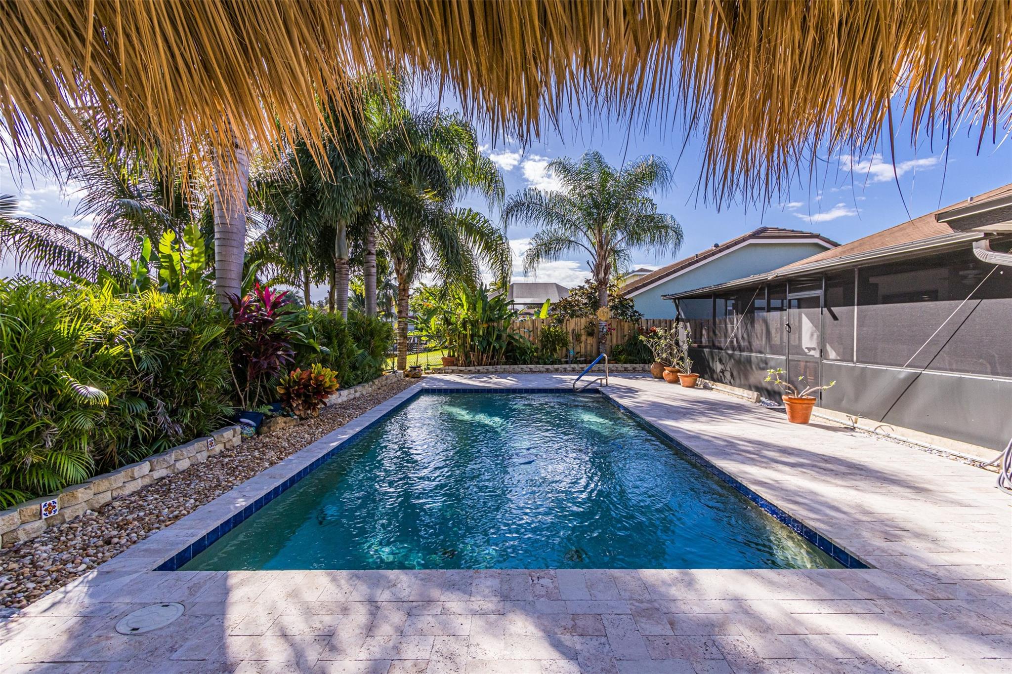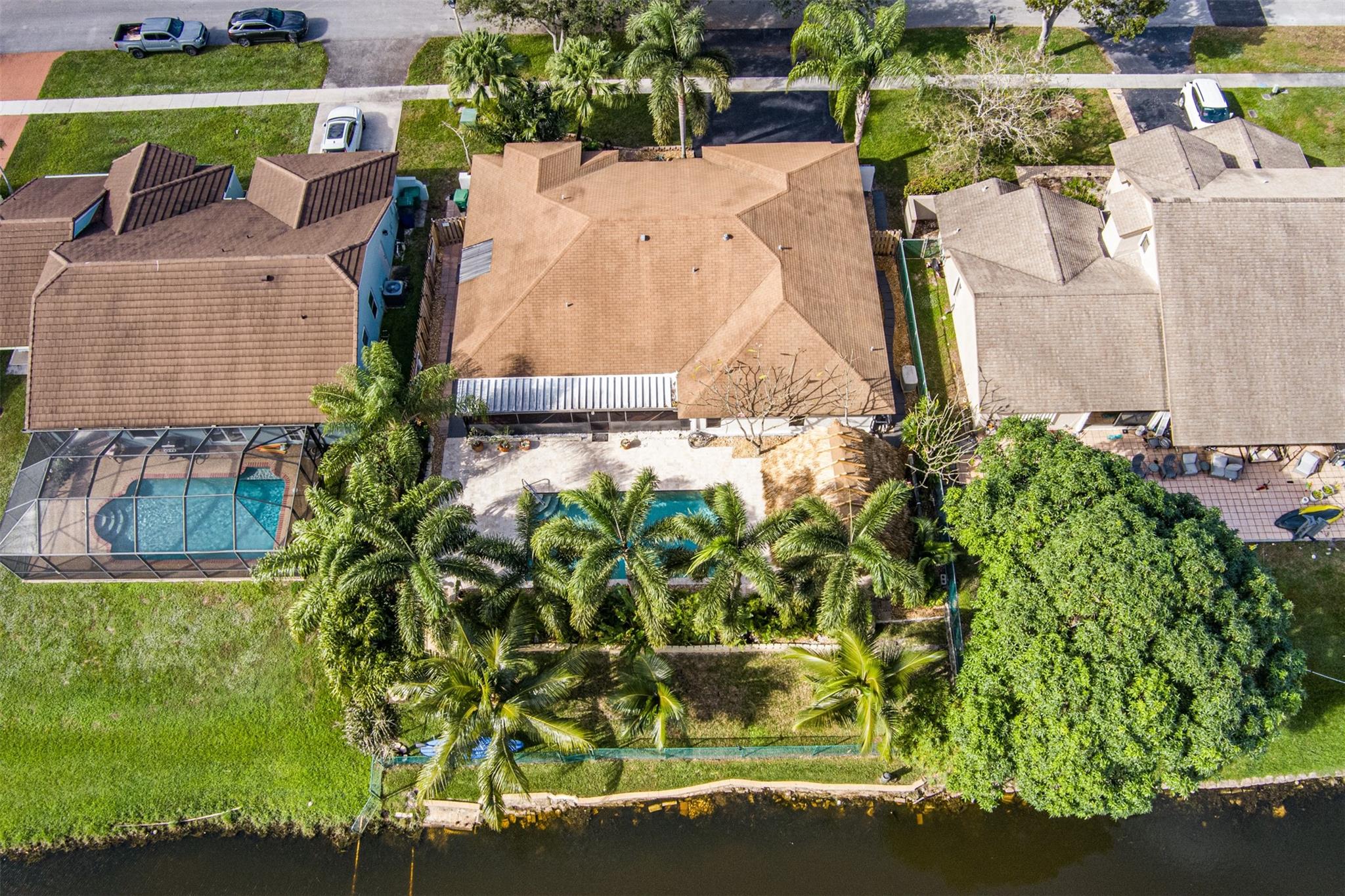 Welcome home to your Country Address tropical paradise in this beautifully updated 3/2 lakefront home. Open floor plan offers great room off the kitchen overlooking pool with plantation shutters, large family room, wet bar and pantry. Spacious master with updated ensuite & walk-in closet is appointed with plantation shutters. Enjoy island vibes with landscaped privacy, oversized pool patio, travertine pavers & freshly thatched tiki hut. Screened patio is great for outdoor dining and taking a dip in the hot tub. Solar outdoor shower, granite counters, SS appliances. This home is hurricane ready with impact glass throughout, impact garage door (full insurance credit). Freshly painted exterior, A+ Cooper City schools, .5 mile to Posnack JCC, .2 miles to park, abundant shopping & dining nearby